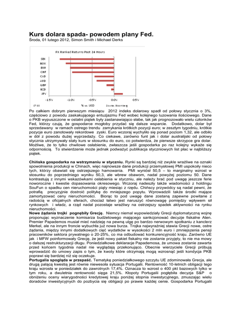 Kurs dolara spada- powodem plany Fed. Środa, 01 lutego 2012, Simon Smith i Michael Derks Po całkiem dobrym pierwszym miesiącu 2012 indeks dolarowy spadł od połowy stycznia o 3%, częściowo z powodu zaskakującego entuzjazmu Fed wobec kolejnego luzowania ilościowego. Dane o PKB wypuszczone w ostatni piątek były zastanawiająco słabe, tak jak prognozowało wielu członków Fed, którzy czują, że gospodarce mogłoby przydać się dalsze wsparcie. Dodatkowo, dolar był sprzedawany w ramach ostrego trendu zamykania krótkich pozycji euro; w zeszłym tygodniu, krótkie pozycje euro zanotowały rekordowe zyski. Euro wczoraj wychyliło się ponad poziom 1,32, ale odbiło w dół z powodu dużej wyprzedaży. Co ciekawe, zarówno funt jak i dolar australijski od połowy stycznia utrzymywały stały kurs w stosunku do euro, co potwierdza, że pierwsze skrzypce gra dolar. Możliwe, że to tylko chwilowe osłabienie, zwłaszcza jeśli gospodarka po raz kolejny wykaże się odpornością. To stwierdzenie może jednak podważyć publikacja styczniowych list płac w najbliższy piątek. Chińska gospodarka na wstrzymaniu w styczniu. Rynki są bardziej niż zwykle wrażliwe na oznaki spowolnienia produkcji w Chinach, więc najnowsze dane produkcji przemysłowej PMI uspokoiły nieco tych, którzy obawiali się ostrzejszego hamowania. PMI wyniósł 50,5 – to marginalny wzrost w stosunku do poprzedniego wyniku 50,3, ale wbrew obawom, nadal powyżej poziomu 50. Dane kontrastują z innymi wskazówkami osłabienia w styczniu, ale należy brać pod uwagę jeszcze ferie noworoczne i kwestie dopasowania okresowego. Wczoraj nadeszły także wiadomości z holdingu SouFun o spadku cen nieruchomości piąty miesiąc z rzędu. Chińscy przywódcy są nadal pewni, że potrafią precyzyjnie dostroić politykę do mniejszego popytu. Wprowadzili także środki mające zamortyzować ceny nieruchomości. Biorąc to pod uwagę dane zostaną zapewne powitane z radością w oficjalnych sferach, chociaż łatwo jest naruszyć równowagę pomiędzy wpływem sił rynkowych i władz, a rząd nadal pozostaje wrażliwy na ostrzejszy spadek aktywności na rynku nieruchomości. Nowe żądania trojki pognębiły Grecję. Niemcy niemal wypowiedziały Grecji dyplomatyczną wojnę proponując wyznaczenie komisarza budżetowego mającego sankcjonować decyzje fiskalne Aten. Premier Papademos musiał mieć nadzieję na pewną ulgę po bardzo nerwowym spotkaniu z kanclerz Merkel, ale na innym froncie wybuchła już nowa burza. Trojka najwyraźniej stawia Grecji nowe, ostre żądania, między innymi dodatkowych cięć wydatków w wysokości 2 mln euro i zmniejszenia pensji pracowników sektora prywatnego o 20-25%, co ma odbudować konkurencyjność kraju. Zarówno UE jak i MFW poinformowały Grecję, że jeśli nowy pakiet fiskalny nie zostanie przyjęty, to nie ma mowy o dalszej restrukturyzacji długu. Poniedziałkowe deklaracje Papademosa, że umowa zostanie zawarta przed końcem tygodnia nadal nie wyglądają przekonująco. Obecnie wierzyciele Grecji próbują wprowadzić do umowy zapis o tym, że kwoty które otrzymają mogą wzrosnąć jeśli kondycja PKB poprawi się bardziej niż się oczekuje. Portugalia spogląda w przepaść. Tematykę poniedziałkowego szczytu UE zdominowała Grecja, ale drugą palącą kwestią jest równie niewesoła sytuacja Portugalii. Rentowność 10-letnich obligacji tego kraju wzrosła w poniedziałek do zawrotnych 17,4%. Oznacza to wzrost o 400 pkt bazowych tylko w tym roku, a dwuletnia rentowność sięga 21,5%. Kłopoty Portugalii pogłębiła decyzja S&P o obniżeniu oceny wiarygodności kredytowej kraju poniżej stopnia inwestycyjnego, zmuszając wielu doradców inwestycyjnych do pozbycia się obligacji po prawie każdej cenie. Gospodarka Portugalii skurczy się w tym roku prawdopodobnie o minimum 5%, a w 2013 dalsze jej osłabienie także jest prawdopodobne. Zadłużenie prywatne/ publiczne wynosi prawie 360% PKB, więc dynamika zadłużenia Portugalii szybko zaczyna być niestabilna. Chociaż europejscy liderzy zaprzeczają że Portugalia będzie niebawem potrzebowała takich cięć wierzytelności jak Grecja, to inwestorzy zdecydowanie w to wierzą. CDsy Portugalii sugerują 72% możliwość, że rząd zbankrutuje w ciągu najbliższych 5 lat. Cała ta sytuacja jest trudna do przełknięcia dla premiera Pedro Coelho, który wprowadził w życie znaczne oszczędności, co pozwoliło Portugalii na otrzymanie w zeszłym roku 78 mln euro pomocy z UE i MFW. Premier wierzy także, że ze swojej strony wywiązał się ze zobowiązań. W zeszłym tygodniu zasugerował, że Portugalia może potrzebować dalszego wsparcia międzynarodowych wierzycieli, ponieważ pakiet oszczędnościowy nie uspokoił inwestorów ani nie wpłynął na zmniejszenie kosztów pożyczek. Coelho obiecał także drugą rundę sprzedaży aktywów, które będą m. in. obejmować udziały rządu w firmie zarządzającej portami lotniczymi i innej, zajmującej się przewozami kolejowymi. Pierwsza runda prywatyzacji idzie całkiem dobrze, a minister finansów Gaspar stwierdził ostatnio, że kraj nadal jest w stanie osiągnąć w tym roku deficyt w wysokości 4% PKB, czyli sporo poniżej celu (5,9%). Największym zmartwieniem inwestorów pozostaje jednak mrożąca krew w żyłach prognoza dot. wzrostu. W przypadku Portugalii leżące u podstaw problemy strukturalne i brak nieodzownego tworzenia dobrobytu powodują, że wprowadzenie pakietów oszczędnościowych staje się bardzo problematyczne. Tak jak Grecja, Portugalia przez długi czas będzie musiała zostać otoczona intensywną opieką. Trudności z pożyczką dla MFW. Ministrowi finansów UK do publicznego rozważania 10mln pożyczki z kasy Wielkiej Brytanii dla MFW wystarczyło najwyraźniej okazanie dobrej woli przez członków strefy euro. Ta demonstracja polegała na namawianiu strefy euro do wspólnej inicjatywy rozwiązania problemów strukturalno-deficytowych
