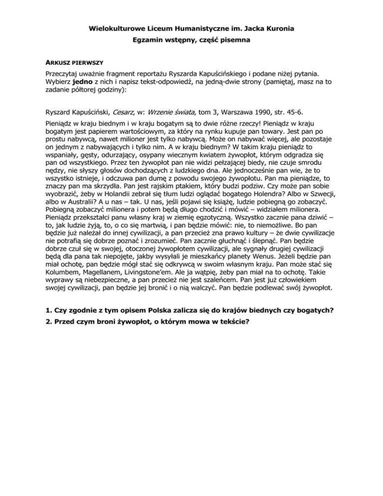Wielokulturowe Liceum Humanistyczne im. Jacka Kuronia Egzamin wstępny, część pisemna ARKUSZ PIERWSZY Przeczytaj uważnie fragment reportażu Ryszarda Kapuścińskiego i podane niżej pytania. Wybierz jedno z nich i napisz tekst-odpowiedź, na jedną-dwie strony (pamiętaj, masz na to zadanie półtorej godziny): Ryszard Kapuściński, Cesarz, w: Wrzenie świata, tom 3, Warszawa 1990, str. 45-6. Pieniądz w kraju biednym i w kraju bogatym są to dwie różne rzeczy! Pieniądz w kraju bogatym jest papierem wartościowym, za który na rynku kupuje pan towary. Jest pan po prostu nabywcą, nawet milioner jest tylko nabywcą. Może on nabywać więcej, ale pozostaje on jednym z nabywających i tylko nim. A w kraju biednym? W takim kraju pieniądz to wspaniały, gęsty, odurzający, osypany wiecznym kwiatem żywopłot, którym odgradza się pan od wszystkiego. Przez ten żywopłot pan nie widzi pełzającej biedy, nie czuje smrodu nędzy, nie słyszy głosów dochodzących z ludzkiego dna. Ale jednocześnie pan wie, że to wszystko istnieje, i odczuwa pan dumę z powodu swojego żywopłotu. Pan ma pieniądze, to znaczy pan ma skrzydła. Pan jest rajskim ptakiem, który budzi podziw. Czy może pan sobie wyobrazić, żeby w Holandii zebrał się tłum ludzi oglądać bogatego Holendra? Albo w Szwecji, albo w Australii? A u nas – tak. U nas, jeśli pojawi się książę, ludzie pobiegną go zobaczyć. Pobiegną zobaczyć milionera i potem będą długo chodzić i mówić – widziałem milionera. Pieniądz przekształci panu własny kraj w ziemię egzotyczną. Wszystko zacznie pana dziwić – to, jak ludzie żyją, to, o co się martwią, i pan będzie mówić: nie, to niemożliwe. Bo pan będzie już należał do innej cywilizacji, a pan przecież zna prawo kultury – że dwie cywilizacje nie potrafią się dobrze poznać i zrozumieć. Pan zacznie głuchnąć i ślepnąć. Pan będzie dobrze czuł się w swojej, otoczonej żywopłotem cywilizacji, ale sygnały drugiej cywilizacji będą dla pana tak niepojęte, jakby wysyłali je mieszkańcy planety Wenus. Jeżeli będzie pan miał ochotę, pan będzie mógł stać się odkrywcą w swoim własnym kraju. Pan może stać się Kolumbem, Magellanem, Livingstone’em. Ale ja wątpię, żeby pan miał na to ochotę. Takie wyprawy są niebezpieczne, a pan przecież nie jest szaleńcem. Pan jest już człowiekiem swojej cywilizacji, pan będzie jej bronić i o nią walczyć. Pan będzie podlewać swój żywopłot. 1. Czy zgodnie z tym opisem Polska zalicza się do krajów biednych czy bogatych? 2. Przed czym broni żywopłot, o którym mowa w tekście?