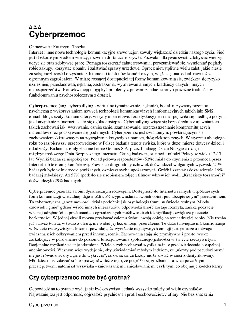 AAA Cyberprzemoc Opracowała: Katarzyna Tyszka Internet i inne nowe technologie komunikacyjne zrewolucjonizowały większość dziedzin naszego życia. Sieć jest doskonałym źródłem wiedzy, rozwija i dostarcza rozrywki. Pozwala odkrywać świat, zdobywać wiedzę, uczyć się oraz zdobywać pracę. Pomaga rozszerzać zainteresowania, porozumiewać się, wymieniać poglądy, robić zakupy, korzystać z banku i załatwiać sprawy urzędowe. Oprócz niewątpliwie wielu zalet, jakie niesie za sobą możliwość korzystania z Internetu i telefonów komórkowych, wiąże się ona jednak również z ogromnym zagrożeniem. W miarę rosnącej dostępności tej formy komunikowania się, zwiększa się ryzyko uzależnień, prześladowań, nękania, zastraszania, wyśmiewania innych, kradzieży danych i innych niebezpieczeństw. Konsekwencją mogą być problemy z prawem z jednej strony i poważne trudności w funkcjonowaniu psychospołecznym z drugiej. Cyberprzemoc (ang. cyberbullying - wirtualne tyranizowanie, nękanie), bo tak nazywamy przemoc psychiczną z wykorzystaniem nowych technologii komunikacyjnych i informacyjnych takich jak: SMS, e-mail, blogi, czaty, komunikatory, witryny internetowe, fora dyskusyjne i inne, pojawiła się niedługo po tym, jak korzystanie z Internetu stało się ogólnodostępne. Cyberbullying wiąże się bezpośrednio z ujawnianiem takich zachowań jak: wyzywanie, ośmieszanie, szantażowanie, rozprzestrzenianie kompromitujących materiałów oraz podszywanie się pod innych. Cyberprzemoc jest świadomym, powtarzającym się zachowaniem skierowanym na wyrządzanie krzywdy za pomocą dróg elektronicznych. W styczniu ubiegłego roku po raz pierwszy przeprowadzono w Polsce badania tego zjawiska, które w dużej mierze dotyczy dzieci i młodzieży. Badania zostały zlecone firmie Gemius S.A. przez fundację Dzieci Niczyje z okazji międzynarodowego Dnia Bezpiecznego Internetu. Grupę badawczą stanowili młodzi Polacy w wieku 12-17 lat. Wyniki badań są niepokojące. Ponad połowa respondentów (52%) miała do czynienia z przemocą przez Internet lub telefonię komórkową. Prawie co drugi młody człowiek doświadczał wulgarnych wyzwisk, 21% badanych było w Internecie poniżanych, ośmieszanych i upokarzanych. Gróźb i szantażu doświadczyło 16% badanej młodzieży. Aż 57% spotkało się z robieniem zdjęć i filmów wbrew ich woli. „Kradzieży tożsamości” doświadczyło 29% badanych. Cyberprzemoc przeraża swoim dynamicznym rozwojem. Dostępność do Internetu i innych współczesnych form komunikacji wirtualnej, daje możliwość wypowiadania swoich opinii pod „bezpiecznym” pseudonimem. Ta cybernetyczna „anonimowość” działa podobnie jak psychologia tłumu w świecie realnym. Młody człowiek „ginie” gdzieś wśród innych internautów, odpowiedzialność zostaje rozmyta, zanika poczucie własnej odrębności, a przekonanie o ograniczonych możliwościach identyfikacji, zwiększa poczucie bezkarności. W jednej chwili można przekazać całemu światu swoją opinię na temat drugiej osoby. Nie trzeba już stawać twarzą w twarz z ofiarą, nie widać jej łez, emocji, przerażenia. To dużo łatwiejsze niż konfrontacja w świecie rzeczywistym. Internet powoduje, że wyrażanie negatywnych emocji jest prostsze a odwaga związana z ich odkrywaniem przed innymi, rośnie. Zachowania stają się prymitywne i proste, wręcz zaskakujące w porównaniu do poziomu funkcjonowania społecznego jednostki w świecie rzeczywistym. Racjonalne myślenie zostaje stłumione. Wiele z tych zachowań wynika m.in. z przeświadczenia o zupełnej anonimowości. Ważnym więc wydaje się, aby uświadamiać młodym ludziom, że „ukryty pod pseudonimem” nie jest równoznaczny z „nie do wykrycia”, co oznacza, że każdy może zostać w sieci zidentyfikowany. Młodzież musi zdawać sobie sprawę również z tego, że pogróżki są groźbami – a więc poważnym przestępstwem, natomiast wyzwiska - znieważaniem i zniesławianiem, czyli tym, co obejmuje kodeks karny. Czy cyberprzemoc może być groźna? Odpowiedź na to pytanie wydaje się być oczywista, jednak wszystko zależy od wielu czynników. Najważniejsza jest odporność, dojrzałość psychiczna i profil osobowościowy ofiary. Nie bez znaczenia Cyberprzemoc 1 pozostaje również nasilenie, rozmiar i czas trwania cyberbullying’u. Im dłużej trwa internetowa bądź „komórkowa” przemoc, tym skutki takiego stresogennego działania mogą być poważniejsze dla osoby nękanej. 33% badanej młodzieży podaje, że naruszenie ich godności w cyberprzestrzeni, nie robi na nich wrażenia, 59% reaguje zdenerwowaniem, zmniejszając w ten sposób stres powstały na skutek doświadczenia nieprzyjemności, 42% przeżywa ogólną przykrość, 18% doświadcza lęku, a 13% uczucia wstydu, co oznacza, że w co ósmym przypadku poniżanie, przynosi zamierzony przez dręczyciela efekt. Niepokojącym pozostaje fakt, że aż 48% badanych nie mówi nikomu o zaistnieniu przykrego zdarzenia. Rodzice i „szkoła” dowiadują się o takich wydarzeniach bardzo rzadko (7% i 4%). Najbardziej niebezpieczną i dotkliwą formą cyberprzemocy są działania godzące w wizerunek społeczny ofiary, czyli przemoc na ogólnodostępnych stronach internetowych, gdzie każdy może przeczytać obraźliwe, lub zawstydzające informacje o ofierze. Niestety, często sprawcami internetowej przemocy są osoby znane poszkodowanym, co niesie za sobą ryzyko przeniesienia wirtualnego nękania na grunt realny. Prawie połowa badanych (47%) doświadcza upokorzenia ze strony kolegów/koleżanek ze szkoły, 37% od innych znajomych z reala w wieku szkolnym. Również w przypadku kompromitujących publikacji, w 59% autorami są koledzy szkolni. Miejsca dobrze znane, w których dzieci i młodzież powinni czuć się bezpiecznie, stają się zagrożeniem dla prawidłowego funkcjonowania młodego człowieka. Efektem takich doświadczeń może