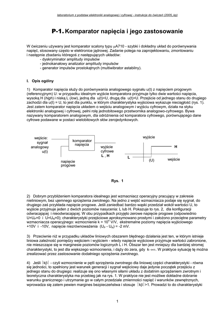 laboratorium z podstaw elektroniki analogowej i cyfrowej - instrukcje do ćwiczeń (2005,,kp) P-1. Komparator napięcia i jego zastosowanie W ćwiczeniu używany jest komparator scalony typu µA710 - szybki i dokładny układ do porównywania napięć, stosowany często w elektronice jądrowej. Zadanie polega na zaprojektowaniu, zmontowaniu i następnie zbadaniu któregoś z następujących układów: - dyskryminator amplitudy impulsów - jednokanałowy analizator amplitudy impulsów - generator impulsów prostokątnych (multiwibrator astabilny). I. Opis ogólny 1) Komparator napięcia służy do porównywania analogowego sygnału u(t) z napięciem progowym (referencyjnym) U: w przypadku idealnym wyjście komparatora przyjmuje tylko dwie wartości napięcia, wysoką H (high) i niską L (low), jedną dla u(t)<U, drugą dla u(t)>U. Przejście od jednego stanu do drugiego zachodzi dla u(t) = U, to jest dla punktu, w którym charakterystyka wyjściowa wykazuje nieciągłość (rys. 1). Jest zatem komparator napięcia układem o wejściu analogowym i wyjściu cyfrowym, działa na styku elektroniki analogowej i cyfrowej, pełni rolę jednobitowego przetwornika analogowo-cyfrowego. Bywa nazywany komparatorem analogowym, dla odróżnienia od komparatora cyfrowego, porównującego dane cyfrowe podawane w postaci wielobitowych słów zerojedynkowych. wejście: sygnał analogowy u(t) komparator napięcia wyjście H wyjście cyfrowe L,H L napięcie progowe (U) wejście Rys. 1 2) Dobrym przybliżeniem komparatora idealnego jest wzmacniacz operacyjny pracujący w zakresie nieliniowym, bez ujemnego sprzężenia zwrotnego. Na jedno z wejść wzmacniacza podaje się sygnał, do drugiego zaś przykłada napięcie progowe. Jeśli zaniedbać bardzo wąski przedział wokół wartości U, to wyjście przyjmuje jeden z dwóch poziomów nasycenia: L lub H. Pokazuje to rys. 2, dla konfiguracji odwracającej i nieodwracającej. W obu przypadkach przyjęto zerowe napięcie progowe (odpowiednio U=UP=0 i U=UN=0); charakterystyki przejściowe aproksymowano prostymi i założono przeciętne parametry wzmacniacza operacyjnego: wzmocnienie k = 104 V/V, ekstremalne poziomy napięcia wyjściowego +10V i -10V, napięcie niezrównoważenia (UP - UN) = -2 mV. 3) Przeciwnie niż w przypadku układów liniowych obszarem błędnego działania jest ten, w którym istnieje liniowa zależność pomiędzy wejściem i wyjściem - wtedy napięcie wyjściowe przyjmuje wartości zabronione, nie mieszczące się w marginesie poziomów logicznych L i H. Obszar ten jest mniejszy dla bardziej stromej charakterystyki, to jest dla większego wzmocnienia, i dąży do zera, gdy k→∞. W praktyce sytuację tę można zrealizować przez zastosowanie dodatniego sprzężenia zwrotnego. 4) Jeśli kβ - czyli wzmocnienie w pętli sprzężenia zwrotnego dla liniowej części charakterystyki - równa się jedności, to spełniony jest warunek generacji i sygnał wejściowy daje jedynie początek przejściu z jednego stanu do drugiego: realizuje się ono własnymi siłami układu z dodatnim sprzężeniem zwrotnym i teoretyczna charakterystyka ma przebieg jak na rys. 1. W praktyce nie jest możliwe dokładne dobranie warunku granicznego i utrzymanie go w całym przedziale zmienności napięć i warunków zewnętrznych, wprowadza się zatem pewien margines bezpieczeństwa i stosuje kβ>1. Prowadzi to do charakterystyki 1 laboratorium z podstaw elektroniki analogowej i cyfrowej - instrukcje do ćwiczeń (2005,,kp) z histerezą, jak to pokazano na przykładzie układu odwracającego na rys. 3 (teoretyczne nachylenie charakterystyki przejściowej jest ujemne). uN U U WY u U P WY ,V U +10 +10 ,V +10 +5 -4 WY WY +5 uN , mV -2 +2 P +6 +4 u -6 -4 -2 +2 -5 -5 -10 -10 , mV +4 Rys. 2 UN U UP WY napięcie U R1 β= R2 R1 + R HIST R2 wejście 2 U U WY H U U wyjście N czas L UHIST Rys. 3 2 laboratorium z podstaw elektroniki analogowej i cyfrowej - instrukcje do ćwiczeń (2005,,kp) 5) Histereza jest nie tylko praktycznie nie do uniknięcia, ale często pożądana, choć ogranicza rozdzielczość komparacji napięć - stanowi ona bowiem zabezpieczenie przed pasożytniczymi przeskokami komparatora, spowodowanymi przez zakłócenia nakładające się na sygnał użyteczny. Szerokość pętli histerezy UH musi wtedy przewyższać fluktuacje sygnału, spowodowane zkłóceniami. Zależy ona od wartości rezystorów w obwodzie sprzężenia zwrotnego i napięć nasycenia wzmacniacza. Przeskok układu z jednego stanu do drugiego następuje wtedy, gdy UP=UN; wielkość UP zaś różni się od napięcia U o przyczynek od prądu płynącego w obwodzie: wyjście wzmacniacza - źródło napięcia referencyjnego (spadek napięcia na R2). Przyczynek ten w stanie H jest inny niż w stanie L, zatem, odpowiednio do dwóch stabilnych stanów wyjściowych, istnieją dwa napięcia progowe UPR' i UPR'', różniące się o wartość napięcia histerezy UHIST. W przypadku jak na rys. 3 przyczynki mają różne znaki dla L i H, dlatego napięcie referencyjne U leży gdzieś między rzeczywistymi napięciami progowymi. 6) Zwykle przy porównywaniu napięć żąda się odpowiedzi bardzo szybkiej i udzielonej w określonym standardzie sygnałów logicznych. Buduje się zatem specjalizowane układy scalone, oparte na nieco innych założeniach, niż wzmacniacze operacyjne: np. mniej zabiega się o wysoką rezystancję wejściową i wysokie wzmocnienie, bardziej o szybkość odpowiedzi impulsowej oraz dopasowanie do warunków zasilania i sterowania obwodów cyfrowych. Popularnym komparatorem scalonym jest układ µA710 firmy Fairchild, szybki, dokładny, zgodny z układami logicznymi TTL, wymagający jednak specjalnego zasilania i cechujący się niewygodnymi ograniczeniami napięć na wejściu i prądów na wyjściu. Ten właśnie komparator będzie użyty w ćwiczeniu. Poniżej zebrane są najważniejsze jego parametry, a na rys. 4 pokazano rozkład wyprowadzeń dla obudowy okrągłej i prosto