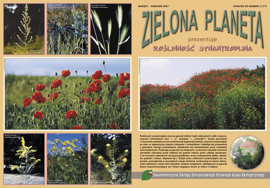 Stokłosa miękka ( Bromus hordeaceus) Jęczmień płonny ( Hordeum murinum) MARZEC – KWIECIEŃ 2007 DODATEK DO NUMERU 2 (71) prezentuje roś li n N OŚ Ć syn a ntro p ij n A fot. Krystyna Haladyn fot. Aureliusz Mikłaszewski Bylica pospolita ( Artemisia vulgaris) Nawłoć późna (Solidago gigantea) Roślinność synantropijną tworzą gatunki dzikich bądź zdziczałych roślin towarzyszących człowiekowi (syn = „z”, antropos = „człowiek”). Swoje powstanie i utrzymanie zawdzięcza ona ustawicznej ingerencji ludzkiej; zespoły synantropijne są więc w najwyższym stopniu związane z człowiekiem i składają się przeważnie z gatunków obcego pochodzenia, świadomie lub nieświadomie przez człowieka wprowadzonych. Powstają wyłącznie na miejscach, na których człowiek zniszczył uprzednio naturalną szatę roślinną (na polach celowo przez zabiegi uprawowe, a na terenach ruderalnych raczej przypadkowo, przez rozkopywanie gleby, składanie popiołu i śmieci, deptanie itp.). Dzięki temu roślinność synantropijna nie napotyka, przynajmniej w początkach swego istnienia, konkurencji ze strony zbiorowisk rodzimych i może mieć charakter stadiów inicjalnych, obfitujących w gatunki łatwo rozprzestrzeniające się i łatwo ulegające innym w walce o miejsce. Wrotycz pospolity (Tanacetum vulgare) Stulisz Loesela (Sisymbrium loeselii ) Wyka wąskolistna (Vicia angustifolia) Glistnik jaskółcze ziele (Chelidonium majus) Maruna nadmorska bezwonna ( Matricaria maritima spp. indora) Ostróżeczka polna (Consolida regalis) Chaber bławatek (Centaurea cyanus) Kąkol polny ( Agrostemma githago) Szczeć pospolita ( Dipsacus sylvestris) Łopian pajęczynowaty ( Arctium tomentosum) Ostrożeń polny (Cirsium arvense) Przegorzan kulisty ( Echinops sphaerocephalus) Oset kędzierzawy (Carduus crispus) Bieluń dziędzierzawa ( Datura stramonium) ROŚ LI N N OŚĆ SYNANTROPIJ NA Mak polny ( Papaver rhoeas) Fiołek polny (Viola arvensis) Pokrzywa żegawka (Urtica urens) Jasnota biała ( Lamium album) Szczawik żółty (Oxalis stricta) Ślaz dziki ( Malva sylvestris) projekt graficzny: Bogusław Wojtyszyn fotografie: Witold Berdowski