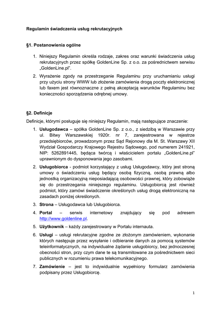 Regulamin świadczenia usług rekrutacyjnych §1. Postanowienia ogólne 1. Niniejszy Regulamin określa rodzaje, zakres oraz warunki świadczenia usług rekrutacyjnych przez spółkę GoldenLine Sp. z o.o. za pośrednictwem serwisu „GoldenLine.pl”. 2. Wyrażenie zgody na przestrzeganie Regulaminu przy uruchamianiu usługi przy użyciu strony WWW lub złożenie zamówienia drogą poczty elektronicznej lub faxem jest równoznaczne z pełną akceptacją warunków Regulaminu bez konieczności sporządzenia odrębnej umowy. §2. Definicje Definicje, którymi posługuje się niniejszy Regulamin, mają następujące znaczenie: 1. Usługodawca – spółka GoldenLine Sp. z o.o., z siedzibą w Warszawie przy ul. Bitwy Warszawskiej 1920r. nr 7, zarejestrowana w rejestrze przedsiębiorców, prowadzonym przez Sąd Rejonowy dla M. St. Warszawy XII Wydział Gospodarczy Krajowego Rejestru Sądowego, pod numerem 241921, NIP: 5262891445, będąca twórcą i właścicielem portalu „GoldenLine.pl” uprawnionym do dysponowania jego zasobami. 2. Usługobiorca - podmiot korzystający z usług Usługodawcy, który jest stroną umowy o świadczeniu usług będący osobą fizyczną, osobą prawną albo jednostką organizacyjną nieposiadającą osobowości prawnej, który zobowiąże się do przestrzegania niniejszego regulaminu. Usługobiorcą jest również podmiot, który zamówi świadczenie określonych usług drogą elektroniczną na zasadach poniżej określonych. 3. Strona – Usługodawca lub Usługobiorca. 4. Portal – serwis internetowy http://www.goldenline.pl. znajdujący się pod adresem 5. Użytkownik – każdy zarejestrowany w Portalu internauta. 6. Usługi – usługi rekrutacyjne zgodne ze złożonym zamówieniem, wykonanie których następuje przez wysyłanie i odbieranie danych za pomocą systemów teleinformatycznych, na indywidualne żądanie usługobiorcy, bez jednoczesnej obecności stron, przy czym dane te są transmitowane za pośrednictwem sieci publicznych w rozumieniu prawa telekomunikacyjnego. 7. Zamówienie – jest to indywidualnie wypełniony formularz zamówienia podpisany przez Usługobiorcę. 1 8. Panel rekrutacyjny – Panel umożliwiający zarządzanie wykupionymi usługami w Portalu. 9. Login - ciąg znaków służących do identyfikacji użytkownika. 10. Hasło - ciąg znaków ustalanych w celu zagwarantowania autoryzowanego dostępu do zamówionej usługi. 11. Rejestracja - wprowadzenie do systemu teleinformatycznego usługodawcy danych niezbędnych do realizacji usługi internetowej §3. Warunki zawierania umów 1. Złożenie zamówienia na Usługę świadczoną przez Usługodawcę następuje przez podpisanie i dostarczenie formularza zamówienia: a. na podany przez Usługodawcę numer faxu lub b. poprzez przesłanie na adres: [email protected] lub c. za pośrednictwem przedstawiciela handlowego Usługodawcy. 2. Warunkiem koniecznym do uruchomienia Usługi w pełnym zakresie jest otrzymanie przez Usługodawcę wynagrodzenia, chyba że co innego wynika z ustaleń pomiędzy Stronami i ustalenia te zostały uwzględnione w Zamówieniu zaakceptowanym przez Usługodawcę. 3. W momencie otrzymania przez Usługodawcę zamówienia, Usługodawca rozpoczyna świadczenie usług poprzez zarezerwowanie zasobów niezbędnych do realizacji zamówienia. 4. Usługa zostaje udostępniona w pełnym zakresie po udokumentowaniu przez Usługodawcę wpłaty za usługę, chyba że co innego wynika z ustaleń pomiędzy Stronami i ustalenia te uwzględniono w Zamówieniu. Hasło i identyfikator są wysyłane pocztą elektroniczną. Przesłanie informacji zwrotnej zawierającej identyfikator i hasło dostępu do usługi możliwe jest jedynie wtedy, gdy dane przekazane Usługodawcy przez Usługobiorcę są poprawne. 5. Jeżeli dla właściwego wykonania umowy Usługobiorca dostarcza jakiekolwiek utwory chronione postanowieniami ustawy o prawie autorskim i prawach pokrewnych, Usługobiorca uzyska stosowne zgody osób uprawnionych – dysponentów takich praw celem upoważnienia Usługodawcę do korzystania z takich utworów zgodnie z ich przeznaczeniem i w celu realizacji umowy na polach eksploatacji określonych postanowieniami art. 50 cyt. ustawy. Upoważnienie, o którym mowa w paragrafie niniejszym zawierać będzie także upoważnienie do wykonywania praw zależnych do takich utworów oraz do udzielania ewentualnych licencji lub sublicencji na rzecz osób trzecich przez Usługodawcę o ile będzie to niezbędne dla należytego wykonywania umowy. 2 6. Usługobiorca ponosi wszystkie ewentualne koszty związane ze wszelkimi roszczeniami osób trzecich wniesionymi przeciwko Usługodawcy opartymi na zarzucie naruszenia praw autorskich przez umieszczenie na Portalu utworów, o których mowa w punkcie 4 powyżej. 7. Usługobiorca oświadcza, że wszelkie majątkowe prawa autorskie do utworów powstałych w związku z wykonaniem niniejszej umowy i w ramach świadczenia usług rekrutacyjnych przez Usługodawcę pozostaną przy Usługodawcy. 8. Usługobiorca nie nabywa w żadnym wypadku jakichkolwiek majątkowych praw autorskich do szat graficznych zamieszczanych w Portalu w stosunku do ogłoszeń rekrutacyjnych lub ogłoszeń reklamowych. §4. Rodzaj i zakres świadczonych usług Niniejszy regulamin obejmuje Usługi świadczone drogą elektroniczną: 1. Ogłoszenie Podstawowe – publikacja ogłoszenia rekrutacyjnego w szacie graficznej GoldenLine; 2. Ogłoszenie Wizerunkowe – publikacja ogłoszenia rekrutacyjnego w szacie graficznej Klienta; 3. Mailing Selektywny – ogłoszenie przesyłane na GoldenLine Użytkownikom wyselekcjonowanym Usługodawcy. skrzynkę pocztową przez konsultanta §5. Warunki świadczenia usług. 1. Usługodawca świadczy usługi na rzecz Usługobiorcy, w zakresie i warunkach określonych w Zamówieniu oraz niniejszym Regulaminie. 2. Usługodawca zobowiązuje się: a. przyznać Usługobiorcy dostęp do Panelu rekrutacyjnego poprzez przekazanie loginu i hasła za poufn