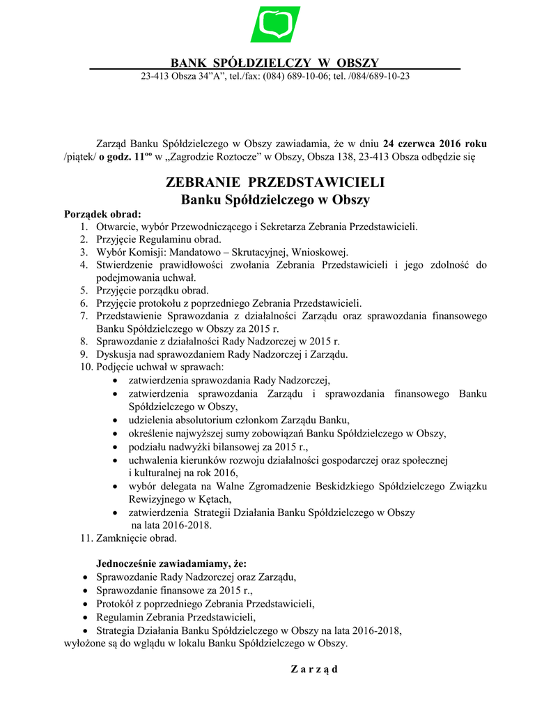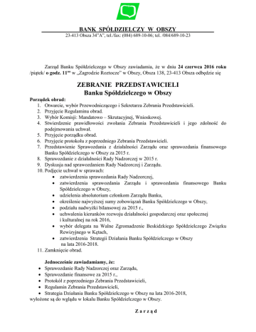 BANK SPÓŁDZIELCZY W OBSZY 23-413 Obsza 34”A”, tel./fax: (084) 689-10-06; tel. /084/689-10-23 Zarząd Banku Spółdzielczego w Obszy zawiadamia, że w dniu 24 czerwca 2016 roku /piątek/ o godz. 11ºº w „Zagrodzie Roztocze” w Obszy, Obsza 138, 23-413 Obsza odbędzie się ZEBRANIE PRZEDSTAWICIELI Banku Spółdzielczego w Obszy Porządek obrad: 1. Otwarcie, wybór Przewodniczącego i Sekretarza Zebrania Przedstawicieli. 2. Przyjęcie Regulaminu obrad. 3. Wybór Komisji: Mandatowo – Skrutacyjnej, Wnioskowej. 4. Stwierdzenie prawidłowości zwołania Zebrania Przedstawicieli i jego zdolność do podejmowania uchwał. 5. Przyjęcie porządku obrad. 6. Przyjęcie protokołu z poprzedniego Zebrania Przedstawicieli. 7. Przedstawienie Sprawozdania z działalności Zarządu oraz sprawozdania finansowego Banku Spółdzielczego w Obszy za 2015 r. 8. Sprawozdanie z działalności Rady Nadzorczej w 2015 r. 9. Dyskusja nad sprawozdaniem Rady Nadzorczej i Zarządu. 10. Podjęcie uchwał w sprawach: zatwierdzenia sprawozdania Rady Nadzorczej, zatwierdzenia sprawozdania Zarządu i sprawozdania finansowego Banku Spółdzielczego w Obszy, udzielenia absolutorium członkom Zarządu Banku, określenie najwyższej sumy zobowiązań Banku Spółdzielczego w Obszy, podziału nadwyżki bilansowej za 2015 r., uchwalenia kierunków rozwoju działalności gospodarczej oraz społecznej i kulturalnej na rok 2016, wybór delegata na Walne Zgromadzenie Beskidzkiego Spółdzielczego Związku Rewizyjnego w Kętach, zatwierdzenia Strategii Działania Banku Spółdzielczego w Obszy na lata 2016-2018. 11. Zamknięcie obrad. Jednocześnie zawiadamiamy, że: Sprawozdanie Rady Nadzorczej oraz Zarządu, Sprawozdanie finansowe za 2015 r., Protokół z poprzedniego Zebrania Przedstawicieli, Regulamin Zebrania Przedstawicieli, Strategia Działania Banku Spółdzielczego w Obszy na lata 2016-2018, wyłożone są do wglądu w lokalu Banku Spółdzielczego w Obszy. Zarząd