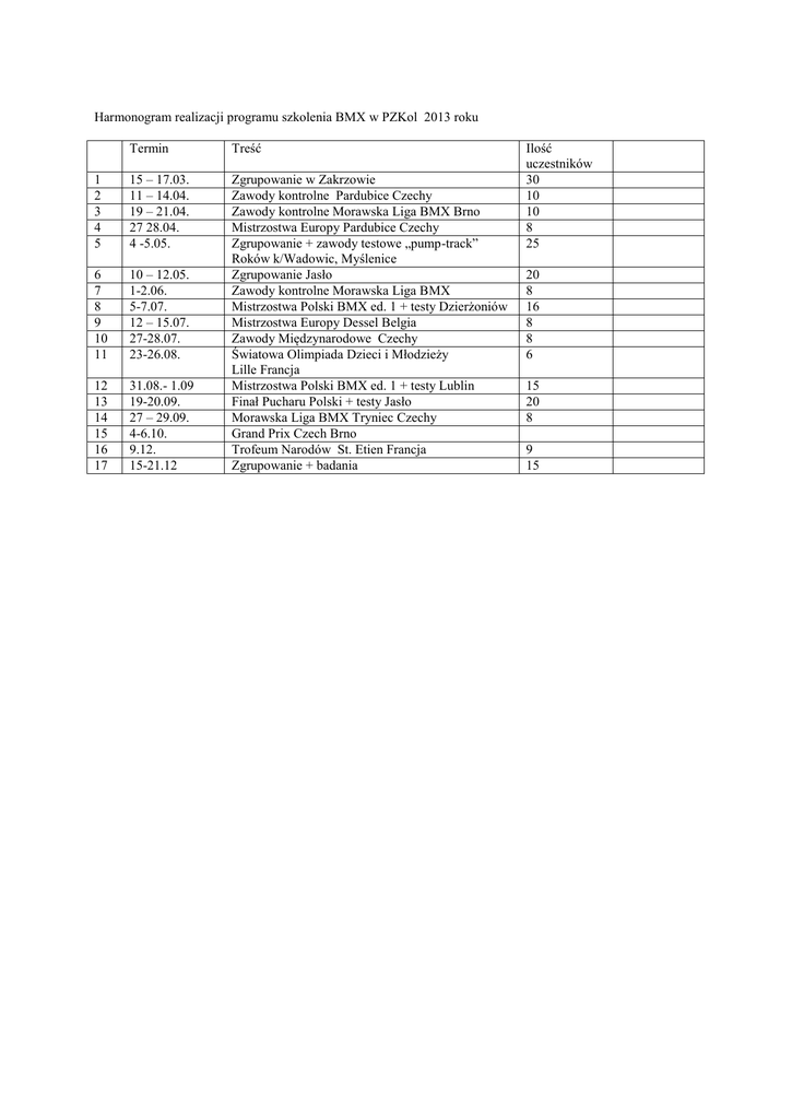 Harmonogram realizacji programu szkolenia BMX w PZKol 2013