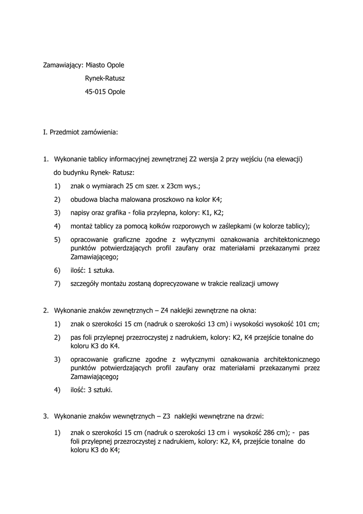Zamawiający: Miasto Opole Rynek-Ratusz 45-015 Opole I. Przedmiot zamówienia: 1. Wykonanie tablicy informacyjnej zewnętrznej Z2 wersja 2 przy wejściu (na elewacji) do budynku Rynek- Ratusz: 1) znak o wymiarach 25 cm szer. x 23cm wys.; 2) obudowa blacha malowana proszkowo na kolor K4; 3) napisy oraz grafika - folia przylepna, kolory: K1, K2; 4) montaż tablicy za pomocą kołków rozporowych w zaślepkami (w kolorze tablicy); 5) opracowanie graficzne zgodne z wytycznymi oznakowania architektonicznego punktów potwierdzających profil zaufany oraz materiałami przekazanymi przez Zamawiającego; 6) ilość: 1 sztuka. 7) szczegóły montażu zostaną doprecyzowane w trakcie realizacji umowy 2. Wykonanie znaków zewnętrznych – Z4 naklejki zewnętrzne na okna: 1) znak o szerokości 15 cm (nadruk o szerokości 13 cm) i wysokości wysokość 101 cm; 2) pas foli przylepnej przezroczystej z nadrukiem, kolory: K2, K4 przejście tonalne do koloru K3 do K4. 3) opracowanie graficzne zgodne z wytycznymi oznakowania architektonicznego punktów potwierdzających profil zaufany oraz materiałami przekazanymi przez Zamawiającego; 4) ilość: 3 sztuki. 3. Wykonanie znaków wewnętrznych – Z3 naklejki wewnętrzne na drzwi: 1) znak o szerokości 15 cm (nadruk o szerokości 13 cm i wysokość 286 cm); - pas foli przylepnej przezroczystej z nadrukiem, kolory: K2, K4, przejście tonalne do koloru K3 do K4; 2) opracowanie graficzne zgodne z wytycznymi oznakowania architektonicznego punktów potwierdzających profil zaufany oraz materiałami przekazanymi przez Zamawiającego; 3) ilość: 3 sztuki. 4. Wykonanie, dostawa i montaż znaków wewnętrznych (W2) – znak kierunkowy prawy: 1) znak o wymiarach 105x22x10 cm; 2) obudowa blacha malowana proszkowo na kolor K4; 3) napisy oraz grafika - folia przylepna, kolory: K1, K2; 4) znak dwustronny – na odwrocie grafika znaku kierunkowego lewego; 5) znak kierunkowy będzie podwieszany do sufitu za pomocą linki stalowej; 6) opracowanie graficzne zgodne z wytycznymi oznakowania architektonicznego punktów potwierdzających profil zaufany oraz materiałami przekazanymi przez Zamawiającego; 7) ilość: 2 sztuki. 5. Wykonanie, dostawa i montaż znaku wewnętrznego (W1) – znak podwieszany: 1) znak o wymiarach 105x22x10; 2) obudowa - blacha malowana proszkowo na kolor K4; 3) napisy oraz grafika – folia przylepna kolory: K1, K2 przejście tonalne do koloru K3 do K4; 4) mocowanie na kołki rozporowe; 5) opracowanie graficzne zgodne z wytycznymi oznakowania architektonicznego punktów potwierdzających profil zaufany oraz materiałami przekazanymi przez Zamawiającego; 6) ilość: 1 sztuka. 6. Wykonanie, dostawa montaż Totemu (Z1): 1) znak o wymiarach 40 x 105 x 15 cm; 2) obudowa blacha malowana proszkowo na kolor K4; 3) napisy oraz grafika folia przylepna kolory: K1,K2, przejście tonalne od koloru K3 do K4; 4) cokół blacha nierdzewna; 5) totem będzie mocowany do podłoża przed budynkiem Urzędu Miasta Opola Rynek – Ratusz; 6) opracowanie graficzne zgodne z wytycznymi oznakowania architektonicznego punktów potwierdzających profil zaufany oraz materiałami przekazanymi przez Zamawiającego; 7) ilość: 1 sztuka. 8) szczegóły montażu zostaną doprecyzowane w trakcie realizacji umowy II. Istotne warunki zamówienia: 1. Napisy na tablicach, naklejkach i totemie powinny zostać wykonane w sposób czytelny i trwały. 2. Materiały z których wykonane są oznaczenia zewnętrzne: jakość wykonania powinna gwarantować odporność na zniszczenia spowodowane warunkami atmosferycznymi. 3. Ostateczna forma tablic, totemu i naklejek zostanie z konsultowana i zatwierdzona przez Zamawiającego. 4. Miejsce montażu totemu i znaków zostanie wskazane przez Zamawiającego. 5. Gwarancja: 5 lat 6. Wykonanie zgodne z wytycznymi oznakowania architektonicznego punktów potwierdzających profil zaufany: http://epuap.gov.pl/wps/wcm/connect/b7d40c59dfd2-4ac3-8fbd-8702cfaab6ef/pz%2Bstylebook.pdf?MOD=AJPERES
