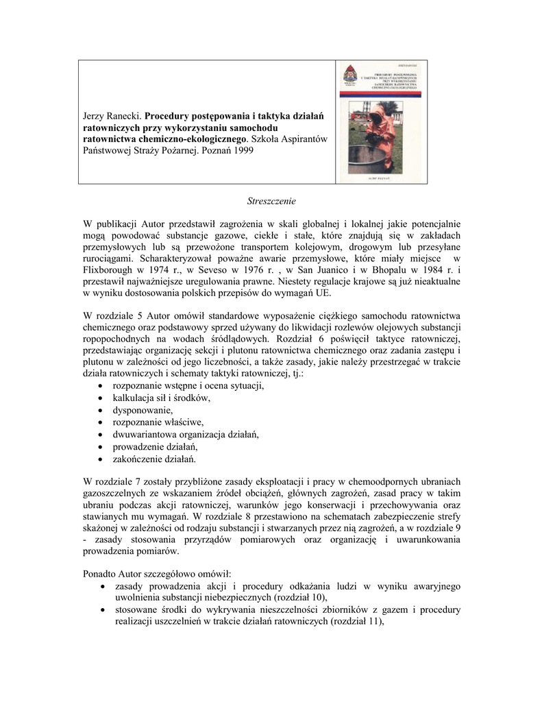 Jerzy Ranecki. Procedury postępowania i taktyka działań ratowniczych przy wykorzystaniu samochodu ratownictwa chemiczno-ekologicznego. Szkoła Aspirantów Państwowej Straży Pożarnej. Poznań 1999 Streszczenie W publikacji Autor przedstawił zagrożenia w skali globalnej i lokalnej jakie potencjalnie mogą powodować substancje gazowe, ciekłe i stałe, które znajdują się w zakładach przemysłowych lub są przewożone transportem kolejowym, drogowym lub przesyłane rurociągami. Scharakteryzował poważne awarie przemysłowe, które miały miejsce w Flixborough w 1974 r., w Seveso w 1976 r. , w San Juanico i w Bhopalu w 1984 r. i przestawił najważniejsze uregulowania prawne. Niestety regulacje krajowe są już nieaktualne w wyniku dostosowania polskich przepisów do wymagań UE. W rozdziale 5 Autor omówił standardowe wyposażenie ciężkiego samochodu ratownictwa chemicznego oraz podstawowy sprzed używany do likwidacji rozlewów olejowych substancji ropopochodnych na wodach śródlądowych. Rozdział 6 poświęcił taktyce ratowniczej, przedstawiając organizację sekcji i plutonu ratownictwa chemicznego oraz zadania zastępu i plutonu w zależności od jego liczebności, a także zasady, jakie należy przestrzegać w trakcie działa ratowniczych i schematy taktyki ratowniczej, tj.: • rozpoznanie wstępne i ocena sytuacji, • kalkulacja sił i środków, • dysponowanie, • rozpoznanie właściwe, • dwuwariantowa organizacja działań, • prowadzenie działań, • zakończenie działań. W rozdziale 7 zostały przybliżone zasady eksploatacji i pracy w chemoodpornych ubraniach gazoszczelnych ze wskazaniem źródeł obciążeń, głównych zagrożeń, zasad pracy w takim ubraniu podczas akcji ratowniczej, warunków jego konserwacji i przechowywania oraz stawianych mu wymagań. W rozdziale 8 przestawiono na schematach zabezpieczenie strefy skażonej w zależności od rodzaju substancji i stwarzanych przez nią zagrożeń, a w rozdziale 9 - zasady stosowania przyrządów pomiarowych oraz organizację i uwarunkowania prowadzenia pomiarów. Ponadto Autor szczegółowo omówił: • zasady prowadzenia akcji i procedury odkażania ludzi w wyniku awaryjnego uwolnienia substancji niebezpiecznych (rozdział 10), • stosowane środki do wykrywania nieszczelności zbiorników z gazem i procedury realizacji uszczelnień w trakcie działań ratowniczych (rozdział 11), • najważniejsze zasady stosowania pomp chemicznych i dokonywania przepompowywania w zależności od właściwości cieczy (rozdział 12), • zasady eksploatacji i stosowania zbiorników chemicznych w zależności od ich odporności materiału, z którego zostały wykonane (rozdział 13), • zasady organizacji i techniki prowadzenia dekontaminacji na miejscu zdarzenia (rozdział 14), • zasady postępowania podczas zdarzeń z udziałem gazów skroplonych (rozdział 15), • procedury postępowania podczas wypadku w takcie transportu materiałów promieniotwórczych (rozdział 16), • zasady stosowania zapór przeciwolejowych podczas likwidacji rozlewów substancji ropopochodnych wraz ze schematami i przykładami skutecznego stosowania rożnych typów zapór w zależności od prędkości nurtu w rzece (rozdział 17), które muszą być bezwzględnie przestrzegane w trakcie prowadzenia akcji ratowniczej. W rozdziale 18 Autor zaprezentował rekomendowane rozwiązania taktyczno-techniczne na przykładzie historycznych akcji ratowniczych przeprowadzonych w Polsce, ze szczególnym uwzględnieniem charakterystycznych zdarzeń z lat 1995-1997. Dodatkowo publikacja zawiera mini-słownik ratownictwa chemiczno-ekologicznego, mały poradnik ratownika chemika, uniwersalną tabelę odporności chemicznej i kolorowe zdjęcia przedstawiające podstawowy sprzęt i czynności ratownicze.