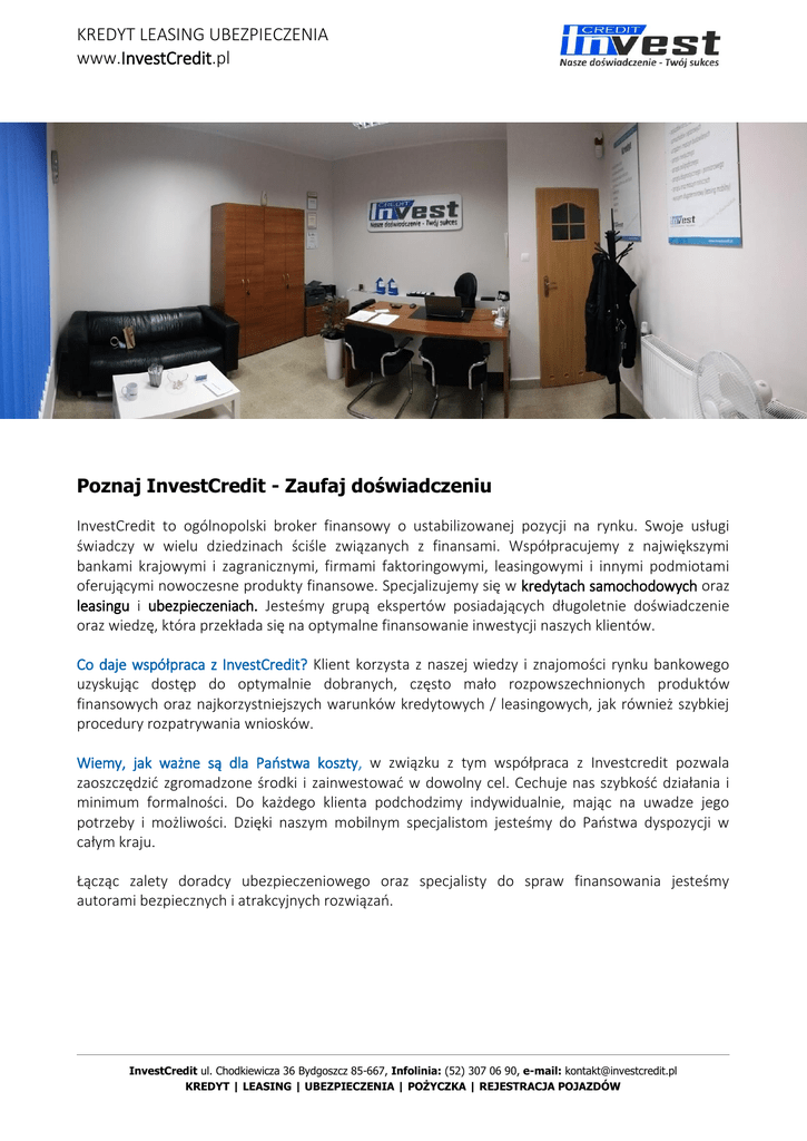 KREDYT LEASING UBEZPIECZENIA www.InvestCredit.pl Poznaj InvestCredit - Zaufaj doświadczeniu InvestCredit to ogólnopolski broker finansowy o ustabilizowanej pozycji na rynku. Swoje usługi świadczy w wielu dziedzinach ściśle związanych z finansami. Współpracujemy z największymi bankami krajowymi i zagranicznymi, firmami faktoringowymi, leasingowymi i innymi podmiotami oferującymi nowoczesne produkty finansowe. Specjalizujemy się w kredytach samochodowych oraz leasingu i ubezpieczeniach. Jesteśmy grupą ekspertów posiadających długoletnie doświadczenie oraz wiedzę, która przekłada się na optymalne finansowanie inwestycji naszych klientów. Co daje współpraca z InvestCredit? Klient korzysta z naszej wiedzy i znajomości rynku bankowego uzyskując dostęp do optymalnie dobranych, często mało rozpowszechnionych produktów finansowych oraz najkorzystniejszych warunków kredytowych / leasingowych, jak również szybkiej procedury rozpatrywania wniosków. Wiemy, jak ważne są dla Państwa koszty, w związku z tym współpraca z Investcredit pozwala zaoszczędzić zgromadzone środki i zainwestować w dowolny cel. Cechuje nas szybkość działania i minimum formalności. Do każdego klienta podchodzimy indywidualnie, mając na uwadze jego potrzeby i możliwości. Dzięki naszym mobilnym specjalistom jesteśmy do Państwa dyspozycji w całym kraju. Łącząc zalety doradcy ubezpieczeniowego oraz specjalisty do spraw finansowania jesteśmy autorami bezpiecznych i atrakcyjnych rozwiązań. InvestCredit ul. Chodkiewicza 36 Bydgoszcz 85-667, Infolinia: (52) 307 06 90, e-mail: [email protected] KREDYT | LEASING | UBEZPIECZENIA | POŻYCZKA | REJESTRACJA POJAZDÓW KREDYT LEASING UBEZPIECZENIA www.InvestCredit.pl Leasing pojazdów do 3,5 tony To produkt skierowany do Klientów, którzy myślą o zakupie nowego lub używanego samochodu firmowego lub motocykla, nie chcą angażować własnych środków, szanują swój czas, oczekują indywidualnego podejścia, doradztwa i bezpieczeństwa. Leasing samochodów osobowych obejmuje nowe oraz używane do 3,5 tony. Charakteryzuje się uproszczoną procedurą zawarcia umowy leasingowej, indywidualnym podejściem do Klienta oraz najwyższym bezpieczeństwem zawarcia transakcji Finansujemy: samochody osobowe, ciężarowe i dostawcze do 3,5 tony motocykle, quady Procedura: opłata wstępna od 1% dla pojazdów nowych i od 5% dla pojazdów używanych okres leasingu do 84 miesięcy Harmonogram Odroczony w przypadku wydłużonego czasu oczekiwania na pojazd możliwość leasingowania samochodów w wieku nawet do 10 lat raty równe, degresywne, sezonowe brak konieczności wyceny rzeczoznawcy w przypadku samochodów używanych ubezpieczenie od straty finansowej GAP indywidualne pakiety ubezpieczeń komunikacyjnych możliwość rozłożenia składki ubezpieczeniowej w ratach Wymagane dokumenty dla działalności gospodarczej: Dowód osobisty Wpis do EDG (NIP, REGON) KRS Zaświadczenie o niezaleganiu w ZUS i US ( dotyczy Spółki z o.o.) Faktura proforma oraz specyfikacja sprzętu/pojazdu InvestCredit ul. Chodkiewicza 36 Bydgoszcz 85-667, Infolinia: (52) 307 06 90, e-mail: [email protected] KREDYT | LEASING | UBEZPIECZENIA | POŻYCZKA | REJESTRACJA POJAZDÓW KREDYT LEASING UBEZPIECZENIA www.InvestCredit.pl Leasing pojazdów ciężarowych powyżej 3,5 tony To nowoczesny produkt skierowany do Klientów, którzy planują zakup nowego lub używanego samochodu ciężarowego powyżej 3,5 ton, ciągnika siodłowego, naczepy lub przyczepy, nie chcą angażować własnych środków, szanują swój czas oraz oczekują indywidualnego podejścia. Leasing środków transportu charakteryzuje się uproszczoną procedurą zawarcia umowy leasingu, indywidualnym podejściem do Klienta i najwyższym bezpieczeństwem zawarcia transakcji. Finansujemy: samochody ciężarowe powyżej 3,5 t autobusy, ciągniki siodłowe, przyczepy naczepy Procedura: opłata wstępna od 0% dla pojazdów nowych i używanych Harmonogram Odroczony w przypadku wydłużonego czasu oczekiwania na pojazd raty równe, degresywne, sezonowe okres leasingu do 60 miesięcy indywidualne pakiety ubezpieczeń komunikacyjnych możliwość rozłożenia składki ubezpieczeniowej w ratach Wymagane dokumenty dla działalności gospodarczej: Dowód osobisty Wpis do EDG (NIP, REGON) KRS Zaświadczenie o niezaleganiu w ZUS i US ( dotyczy Spółki z o.o.) Faktura proforma oraz specyfikacja pojazdu InvestCredit ul. Chodkiewicza 36 Bydgoszcz 85-667, Infolinia: (52) 307 06 90, e-mail: [email protected] KREDYT | LEASING | UBEZPIECZENIA | POŻYCZKA | REJESTRACJA POJAZDÓW KREDYT LEASING UBEZPIECZENIA www.InvestCredit.pl Leasing maszyn i urządzeń budowlanych Oferta leasingu środków trwałych dedykowana dla Klientów zainteresowanych użytkowaniem: maszyn budowlanych i innych nowych oraz używanych maszyn i urządzeń. Każdy harmonogram finansowy jest ustalany indywidualnie i dopasowany do potrzeb i możliwości Leasingobiorców. Od rodzaju przedmiotu leasingu uzależniona jest wysokość pierwszej wpłaty oraz długość umowy leasingu. Finansujemy: Koparko-ładowarki, sprzęt specjalistyczny, ładowarki, dźwigi pozostały sprzęt budowalny Procedura: opłata wstępna od 10% dla pojazdów nowych i używanych okres leasingu do 60 miesięcy Harmonogram Odroczony w przypadku wydłużonego czasu oczekiwania na pojazd indywidualne pakiety ubezpieczeń komunikacyjnych możliwość rozłożenia składki ubezpieczeniowej w ratach Wymagane dokumenty dla działalności gospodarczej: Dowód osobisty Wpis do EDG (NIP, REGON) KRS wycena sprzętu Faktura proforma oraz specyfikacja sprzętu/pojazdu InvestCredit ul. Chodkiewicza 36 Bydgoszcz 85-667, Infolinia: (52) 307 06 90, e-mail: [email protected] KREDYT | LEASING | UBEZPIECZENIA | POŻYCZKA | REJESTRACJA POJAZDÓW KREDYT LEASING UBEZPIECZENIA www.InvestCredit.pl Leasing sprzętu medycznego To produkt dedykowany w szczególności lekarzom różnych specjalności, stomatologom, 