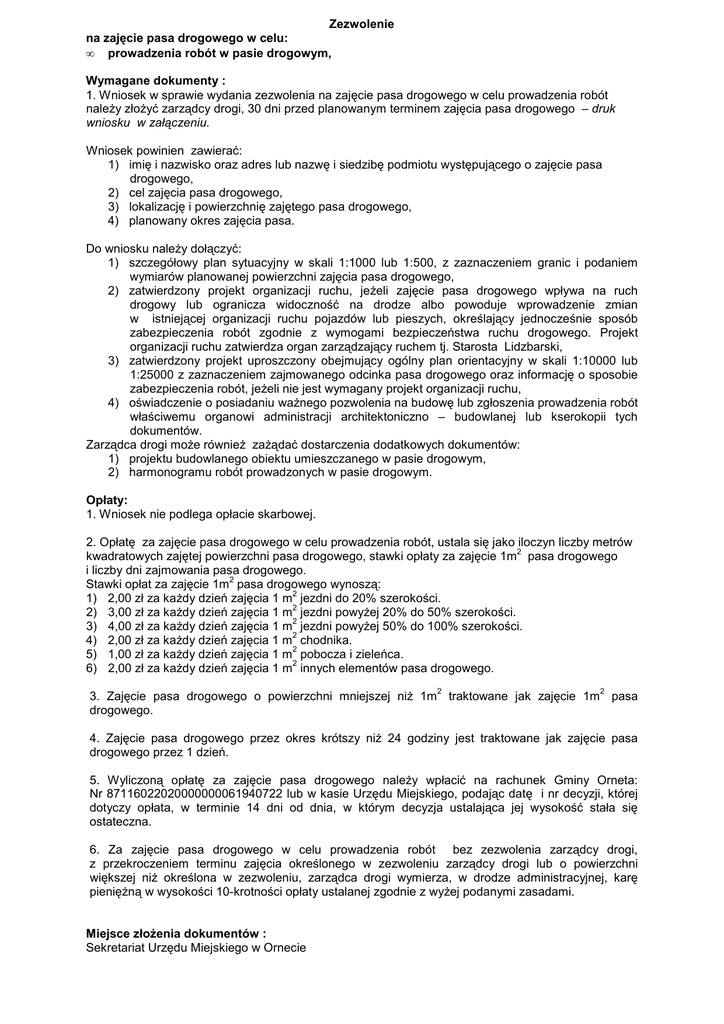 Zezwolenie na zajęcie pasa drogowego w celu: • prowadzenia robót w pasie drogowym, Wymagane dokumenty : 1. Wniosek w sprawie wydania zezwolenia na zajęcie pasa drogowego w celu prowadzenia robót należy złożyć zarządcy drogi, 30 dni przed planowanym terminem zajęcia pasa drogowego – druk wniosku w załączeniu. Wniosek powinien zawierać: 1) imię i nazwisko oraz adres lub nazwę i siedzibę podmiotu występującego o zajęcie pasa drogowego, 2) cel zajęcia pasa drogowego, 3) lokalizację i powierzchnię zajętego pasa drogowego, 4) planowany okres zajęcia pasa. Do wniosku należy dołączyć: 1) szczegółowy plan sytuacyjny w skali 1:1000 lub 1:500, z zaznaczeniem granic i podaniem wymiarów planowanej powierzchni zajęcia pasa drogowego, 2) zatwierdzony projekt organizacji ruchu, jeżeli zajęcie pasa drogowego wpływa na ruch drogowy lub ogranicza widoczność na drodze albo powoduje wprowadzenie zmian w istniejącej organizacji ruchu pojazdów lub pieszych, określający jednocześnie sposób zabezpieczenia robót zgodnie z wymogami bezpieczeństwa ruchu drogowego. Projekt organizacji ruchu zatwierdza organ zarządzający ruchem tj. Starosta Lidzbarski, 3) zatwierdzony projekt uproszczony obejmujący ogólny plan orientacyjny w skali 1:10000 lub 1:25000 z zaznaczeniem zajmowanego odcinka pasa drogowego oraz informację o sposobie zabezpieczenia robót, jeżeli nie jest wymagany projekt organizacji ruchu, 4) oświadczenie o posiadaniu ważnego pozwolenia na budowę lub zgłoszenia prowadzenia robót właściwemu organowi administracji architektoniczno – budowlanej lub kserokopii tych dokumentów. Zarządca drogi może również zażądać dostarczenia dodatkowych dokumentów: 1) projektu budowlanego obiektu umieszczanego w pasie drogowym, 2) harmonogramu robót prowadzonych w pasie drogowym. Opłaty: 1. Wniosek nie podlega opłacie skarbowej. 2. Opłatę za zajęcie pasa drogowego w celu prowadzenia robót, ustala się jako iloczyn liczby metrów 2 kwadratowych zajętej powierzchni pasa drogowego, stawki opłaty za zajęcie 1m pasa drogowego i liczby dni zajmowania pasa drogowego. 2 Stawki opłat za zajęcie 1m pasa drogowego wynoszą: 2 1) 2,00 zł za każdy dzień zajęcia 1 m jezdni do 20% szerokości. 2 2) 3,00 zł za każdy dzień zajęcia 1 m jezdni powyżej 20% do 50% szerokości. 2 3) 4,00 zł za każdy dzień zajęcia 1 m jezdni powyżej 50% do 100% szerokości. 2 4) 2,00 zł za każdy dzień zajęcia 1 m chodnika. 2 5) 1,00 zł za każdy dzień zajęcia 1 m pobocza i zieleńca. 2 6) 2,00 zł za każdy dzień zajęcia 1 m innych elementów pasa drogowego. 2 2 3. Zajęcie pasa drogowego o powierzchni mniejszej niż 1m traktowane jak zajęcie 1m pasa drogowego. 4. Zajęcie pasa drogowego przez okres krótszy niż 24 godziny jest traktowane jak zajęcie pasa drogowego przez 1 dzień. 5. Wyliczoną opłatę za zajęcie pasa drogowego należy wpłacić na rachunek Gminy Orneta: Nr 87116022020000000061940722 lub w kasie Urzędu Miejskiego, podając datę i nr decyzji, której dotyczy opłata, w terminie 14 dni od dnia, w którym decyzja ustalająca jej wysokość stała się ostateczna. 6. Za zajęcie pasa drogowego w celu prowadzenia robót bez zezwolenia zarządcy drogi, z przekroczeniem terminu zajęcia określonego w zezwoleniu zarządcy drogi lub o powierzchni większej niż określona w zezwoleniu, zarządca drogi wymierza, w drodze administracyjnej, karę pieniężną w wysokości 10-krotności opłaty ustalanej zgodnie z wyżej podanymi zasadami. Miejsce złożenia dokumentów : Sekretariat Urzędu Miejskiego w Ornecie Termin załatwienia sprawy : Do 25 dni. Tryb odwoławczy : Od wydanej decyzji służy prawo odwołania do Samorządowego Kolegium Odwoławczego w Olsztynie, za pośrednictwem Burmistrza Ornety w terminie 14 dni od dnia otrzymania decyzji. Jednostka odpowiedzialna : Referat Ochrony Środowiska, Gospodarki Komunalnej i Drogownictwa UM Orneta – kamieniczka „D” tel. 0-55 22-10-202 Podstawa prawna : 1) Ustawa z dnia 16 listopada 2006r. o opłacie skarbowej (Dz. U. 2012r. poz. 1282, z późniejszymi zmianami) 2) Ustawa z dnia 14 czerwca 1960r. - Kodeks postępowania administracyjnego (Dz. U. 2013r. poz. 267), 3) Ustawa z dnia 21 marca 1985 r. o drogach publicznych (Dz. U. 2013r. poz. 260), 4) Rozporządzenie Ministra Infrastruktury z dnia 23 września 2003r. w sprawie szczegółowych warunków zarządzania ruchem na drogach oraz wykonania nadzoru nad tym zarządzeniem (Dz. U. Nr 177, poz. 1729), 5) Rozporządzenie Rady Ministrów z dnia 1 czerwca 2004r. w sprawie określenia warunków udzielania zezwoleń na zajęcie pasa drogowego (Dz. U. Nr 140, poz. 1481), 6) Ustawa z dnia 7 lipca 1994r. Prawo budowlane (Dz. U. z 2010r, Nr 243, poz. 1623, z późniejszymi zmianami), 7) Uchwała Rady Miejskiej w Ornecie NR XXVII/152/04 z dnia 29 listopada 2004r. Dokument utworzony przez: Piotr Ogiela Dokument ostatnio zmodyfikowany przez: Piotr Ogiela 14 maja 2013r. .......................................................... (miejscowość, data) ...................................................... (wnioskodawca) …………………………………….. (znak sprawy) Burmistrz Ornety ul. Plac Wolności 26 11-130 Orneta WNIOSEK o wydanie zezwolenia na zajęcie pasa drogowego drogi gminnej .......................................................................................................................................................................................................... (nazwa drogi, ulicy) 1. Rodzaj i cel zajęcia pasa drogowego: Prowadzenie robót w pasie drogowym w celu: .............................................................................................................................................................. .............................................................................................................................................................. …………………………………………