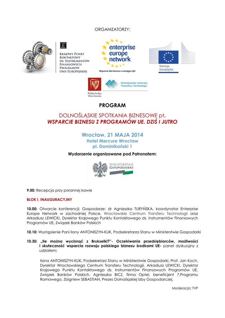 ORGANIZATORZY: PROGRAM DOLNOŚLĄSKIE SPOTKANIA BIZNESOWE pt. WSPARCIE BIZNESU Z PROGRAMÓW UE. DZIŚ I JUTRO Wrocław, 21 MAJA 2014 Hotel Mercure Wrocław pl. Dominikański 1 Wydarzenie organizowane pod Patronatem: 9.00: Recepcja przy porannej kawie BLOK I. INAUGURACYJNY 10.00: Otwarcie konferencji: Gospodarze: dr Agnieszka TURYŃSKA, koordynator Enterprise Europe Network w zachodniej Polsce, Wrocławskie Centrum Transferu Technologii oraz Arkadiusz LEWICKI, Dyrektor Krajowego Punktu Kontaktowego ds. Instrumentów Finansowych Programów UE, Związek Banków Polskich 10.10: Wystąpienie Pani Ilony ANTONISZYN-KLIK, Podsekretarza Stanu w Ministerstwie Gospodarki 10.30: „Ile można wycisnąć z Brukselki?”- Oczekiwania przedsiębiorców, możliwości i skuteczność wsparcia rozwoju polskiego biznesu środkami UE- panel dyskusyjny z udziałem: Ilona ANTONISZYN-KLIK, Podsekretarz Stanu w Ministerstwie Gospodarki, Prof. Jan Koch, Dyrektor Wrocławskiego Centrum Transferu Technologii, Arkadiusz LEWICKI, Dyrektor Krajowego Punktu Kontaktowego ds. Instrumentów Finansowych Programów UE, Związek Banków Polskich, Agnieszka BICZ, firma Optel, beneficjent 7.Programu Ramowego, Zbigniew SEBASTIAN, Prezes Dolnośląskiej Izby Gospodarczej. Moderacja: TVP 11.30: Przerwa BLOK II. WSPARCIE DLA PRZEDSIĘBIORCÓW W RAMACH PROGRAMÓW 2007-2013 11.45: Gdzie przedsiębiorca może szukać jeszcze wsparcia w ramach programów 2007-2013? 11.45:Aktualne wsparcie pozafinansowe dla przedsiębiorców w ramach sieci Enterprise Europe Network, dr Agnieszka TURYŃSKA, EEN WCTT 12.00: Mapa dostępnego wsparcia dla przedsiębiorców z programów ramowych UE, Michał GORZELAK, Główny Specjalista, KPK ds. Instrumentów Finansowych Programów UE, ZBP 12.15: Giełda Instrumentów Narodowych Pośredników Finansowych (NPF) Programów UE: (preferencyjne kredyty, gwarancje, poręczenia, leasing, pożyczki): Prezentacje wybranych Narodowych Pośredników Finansowych 13.15: Sesja pytań i odpowiedzi 13.30: Przerwa i indywidualne sesje match-makingowe NPF z zainteresowanymi przedsiębiorcami. BLOK III. WSPARCIE DLA PRZEDSIĘBIORCÓW W RAMACH NOWEJ PERSPEKTYWY FINANSOWEJ UE 13.50: Wsparcie dla przedsiębiorców w ramach nowych programów operacyjnych 20142020: Przedstawiciel Urzędu Marszałkowskiego Województwa Dolnośląskiego 14.10: Wsparcie dla przedsiębiorców w programach Unii Europejskiej 2014-2020: COSME, HORYZONT 2020, KREATYWNA EUROPA, EASI: 14.10: COSME i Horyzont 2020: Marcin JABŁOŃSKI, Katarzyna BANYŚ, EEN WCTT 14.35: Instrumenty Finansowe: Michał GORZELAK, Główny Specjalista, Krajowy Punkt Kontaktowy ds. Instrumentów Finansowych Programów UE, Związek Banków Polskich 14.50: Sesja pytań i odpowiedzi 15.05: Podsumowanie i zakończenie konferencji: Dr Agnieszka TURYŃSKA, Koordynator Enterprise Europe Network, Wrocławskie Centrum Transferu Technologii oraz Arkadiusz LEWICKI, Dyrektor KPK ds. Instrumentów Finansowych Programów UE, ZBP 15.15: Lunch, losowanie nagród oraz indywidualne z zainteresowanymi przedsiębiorcami sesje match-makingowe NPF *** Udział w konferencji jest bezpłatny. REJESTRACJA: [email protected] Przedsięwzięcie finansowane ze środków Unii Europejskiej w ramach Programu ramowego na rzecz konkurencyjności i innowacji na lata 2007-2013 oraz budżetu państwa ramach Programu Wieloletniego na rzecz udziału Polski w Programie ramowego na rzecz konkurencyjności i innowacji na lata 2007-2014