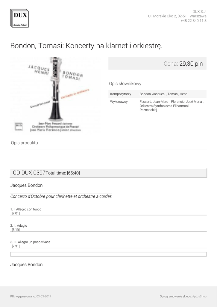 DUX S.J. Ul. Morskie Oko 2, 02-511 Warszawa +48 22 849 11 3 Bondon, Tomasi: Koncerty na klarnet i orkiestrę. Cena: 29,30 pln Opis słownikowy Kompozytorzy Bondon, Jacques ∎, Tomasi, Henri ∎ Wykonawcy Fessard, Jean-Marc ∎, Florencio, José Maria ∎, Orkiestra Symfoniczna Filharmonii Poznańskiej ∎ Opis produktu CD DUX 0397Total time: [65:40] Jacques Bondon Concerto d’Octobre pour clarinette et orchestre a cordes 1. I. Allegro con fuoco [7:01] 2. II. Adagio [8:19] 3. III. Allegro un poco vivace [7:31] Jacques Bondon Plik wygenerowano: 03-03-2017 Oprogramowanie sklepu: AptusShop DUX S.J. Ul. Morskie Oko 2, 02-511 Warszawa +48 22 849 11 3 Concerto des Offrandes pour clarinette et orchestre 4. I. Offrande pour hier [7:17] 5. II. Offrande pour aujourd’hui [7:36] 6. III. Offrande pour demain [8:44] Henri Tomasi Concerto pour clarinette et orchestre a cordes (Koncert na klarnet i orkiestrę smyszkową) 7. I. Allegro giocoso [8:43] 8. II. Nocturne [5:05] 9. III. Scherzo final [5:21] Wykonawcy: Orkiestra Symfoniczna Filharmonii Poznańskiej Jean-Marc Fessard /klarnet/ José Maria Florencio /dyrygent/ Plik wygenerowano: 03-03-2017 Powered by TCPDF (www.tcpdf.org) Oprogramowanie sklepu: AptusShop