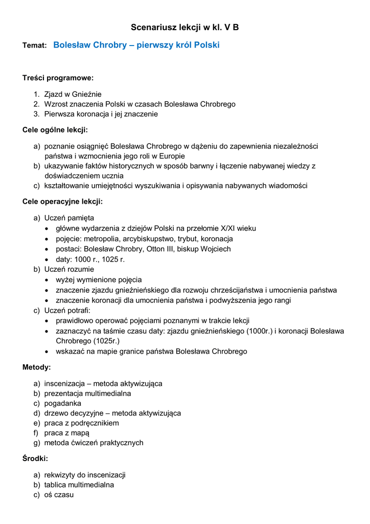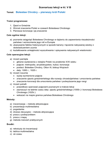 Scenariusz lekcji w kl. V B Temat: Bolesław Chrobry – pierwszy król Polski Treści programowe: 1. Zjazd w Gnieźnie 2. Wzrost znaczenia Polski w czasach Bolesława Chrobrego 3. Pierwsza koronacja i jej znaczenie Cele ogólne lekcji: a) poznanie osiągnięć Bolesława Chrobrego w dążeniu do zapewnienia niezależności państwa i wzmocnienia jego roli w Europie b) ukazywanie faktów historycznych w sposób barwny i łączenie nabywanej wiedzy z doświadczeniem ucznia c) kształtowanie umiejętności wyszukiwania i opisywania nabywanych wiadomości Cele operacyjne lekcji: a) Uczeń pamięta główne wydarzenia z dziejów Polski na przełomie X/XI wieku pojęcie: metropolia, arcybiskupstwo, trybut, koronacja postaci: Bolesław Chrobry, Otton III, biskup Wojciech daty: 1000 r., 1025 r. b) Uczeń rozumie wyżej wymienione pojęcia znaczenie zjazdu gnieźnieńskiego dla rozwoju chrześcijaństwa i umocnienia państwa znaczenie koronacji dla umocnienia państwa i podwyższenia jego rangi c) Uczeń potrafi: prawidłowo operować pojęciami poznanymi w trakcie lekcji zaznaczyć na taśmie czasu daty: zjazdu gnieźnieńskiego (1000r.) i koronacji Bolesława Chrobrego (1025r.) wskazać na mapie granice państwa Bolesława Chrobrego Metody: a) b) c) d) e) f) g) inscenizacja – metoda aktywizująca prezentacja multimedialna pogadanka drzewo decyzyjne – metoda aktywizująca praca z podręcznikiem praca z mapą metoda ćwiczeń praktycznych Środki: a) rekwizyty do inscenizacji b) tablica multimedialna c) oś czasu d) e) f) g) podręcznik plansze z ważnymi pojęciami karty pracy uczniów plansza ze schematem drzewa decyzyjnego Etapy lekcji Zaangażowanie 1. Wprowadzenie Powitanie zaproszonych gości, przedstawienie celu lekcji i tematu, który uczniowie zapisują do zeszytów. 2. Pogadanka. Nawiązanie do tematu. Prezentacja 3. Przedstawienie prezentacji nt. „Bolesław Chrobry – pierwszy król Polski” z wykorzystaniem tablicy multimedialnej. Cz. 1 4. Inscenizacja nr 1 Uczniowie prezentują spotkanie Bolesława Chrobrego z cesarzem Ottonem III. INSCENIZACJA NR 1 - GNIEZNO w 1000 r - ZJAZD NARRATOR: Uważamy za godne przekazania pamięci, że w 1000 r. przybył do grobu św. Wojciecha cesarz Otton III dla modlitwy, pojednania i w celu poznania sławnego księcia. Jest wręcz nie do uwierzenia i nie da się opowiedzieć, w jaki sposób książę przyjął cesarza i poprowadził przez swoje ziemie. U wrót Gniezna odbyła się uroczystość powitania. CESARZ: Jestem cesarz rzymski z rodu niemieckiego Przyjechałem tu do Gniezna na dwór księcia wspaniałego By odwiedzić grób Wojciecha przyjaciela mego Z rąk pogańskich Prusów zabitego. BOLESŁAW: Jego ciało wykupiłem za złoto i chrześcijański pogrzeb mu wyprawiłem. Uczyniłem to z ochotą, bo mądry i dobry był to człowiek. CESARZ: Chcesz by było niezależne twoje państwo, Bo ojciec twój wprowadził tu chrześcijaństwo ? BOLESŁAW: Jestem władcą Polaków. Mój kraj sięga od Gniezna po Kraków ! CESARZ: Szkoda tylko, że władca Polski ciągle księciem pozostaje. Chcę by był królem – z berłem i koroną. Zanim z Rzymu otrzymasz własną – weź moją ! Weź też włócznię – słusznie ci się należy – boś wielki opiekun rycerzy. BOLESŁAW: Dziękuję cesarzu ! 5. Podkreślenie znaczenia zjazdu gnieźnieńskiego dla rozwoju organizacji państwowej i kościelnej – prezentacja cz. 2 6. Omówienie wojen polsko – niemieckich 1002 – 1018 oraz wyprawy na Ruś Kijowską – prezentacja cz. 3 7. Inscenizacja nr 2 Uczniowie prezentują koronację Bolesława Chrobrego na króla Polski. INSCENIZACJA NR 2 - KORONACJA 1025 r. NARRATOR: Nadszedł długo wyczekiwany Anno Domini 1025. Ogłaszam wszem, wobec i każdemu z osobna, iż w tej chwili odbędzie się koronacja miłościwie nam panującego księcia Bolesława. Fanfary rozpoczynające uroczystości ARCYBISKUP: Bolesławie ! Ja Arcybiskup koronuję Ciebie na króla Polski. Czy przysięgasz sprawiedliwie rządzić swoimi poddanymi i przestrzegać praw bożych ? BOLESŁAW: Ja Bolesław, z Bożej łaski król Polski przysięgam ! Tak mi dopomóż Bóg ! NARRATOR: Koronacja w średniowieczu należała do największych uroczystości państwowych i kościelnych, podczas których monarcha otrzymywał insygnia koronacyjne (koronę, berło, jabłko, miecz). Miała formę sakramentu. Gest, słowo, muzyka, przepych i bogactwo, jakie towarzyszyły tej uroczystości sprawiały, że w pamięci widzów pozostawała jako wspaniałe widowisko. 8. Podkreślenie znaczenia koronacji w 1025 r. – prezentacja cz. 4. Badanie i przekształcanie 9. Nauczyciel odczytuje tekst. Zadaniem uczniów jest wstawienie w puste miejsca brakujących wyrazów. Bolesław Chrobry był synem Mieszka I i czeskiej księżniczki Dobrawy. Popierał akcję misyjną biskupa Wojciecha, który został zamordowany przez Prusów i pochowany w katedrze w Gnieźnie. Zjazd gnieźnieński odbył się w 1000 roku. Do Gniezna przybył wówczas cesarz Otton III. W Gnieźnie utworzono metropolię z arcybiskupstwem, któremu podlegały 4 biskupstwa: poznańskie, krakowskie, kołobrzeskie, wrocławskie. W 1018 roku do Polski przyłączono: a) na zachodzie Łużyce i Milsko b) na wschodzie Grody Czerwieńskie Bolesław Chrobry koronował się w 1025 roku w Gnieźnie 10. Uczniowie określają wiek dat ważnych wydarzeń: 1000 r. i 1025 r. Zapisanie notatki w zeszycie. 11. Zastosowanie metody aktywizującej „drzewo decyzyjne”. Na tablicy zostaje powieszona plansza, którą uczniowie po zastanowieniu uzupełniają. CELE I WARTOŚCI ……………………… ……………………… POZYTYWNE …………………….. …………………….. POZYTYWNE …………………… …………………… SKUTKI NEGATYWNE ……………………. ……………………. TAK NEGATYWNE …………………… …………………… MOŻLIWE ROZWIĄZANIA Bolesław Chrobry rządzi państwem polskim. Władca powinien 