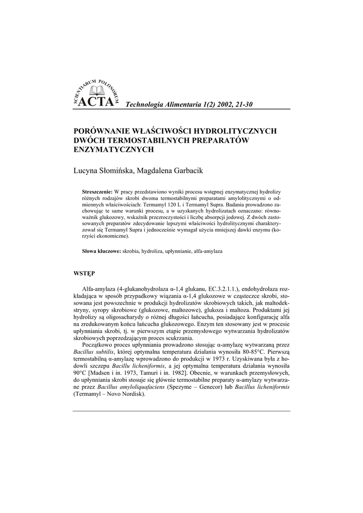 TI SCIEN RUM NO UM POLO AR ACTA Technologia Alimentaria 1(2) 2002, 21-30 PORÓWNANIE WŁAŚCIWOŚCI HYDROLITYCZNYCH DWÓCH TERMOSTABILNYCH PREPARATÓW ENZYMATYCZNYCH Lucyna Słomińska, Magdalena Garbacik Streszczenie: W pracy przedstawiono wyniki procesu wstępnej enzymatycznej hydrolizy różnych rodzajów skrobi dwoma termostabilnymi preparatami amylolitycznymi o odmiennych właściwościach: Termamyl 120 L i Termamyl Supra. Badania prowadzono zachowując te same warunki procesu, a w uzyskanych hydrolizatach oznaczano: równoważnik glukozowy, wskaźnik przezroczystości i liczbę absorpcji jodowej. Z dwóch zastosowanych preparatów zdecydowanie lepszymi właściwości hydrolitycznymi charakteryzował się Termamyl Supra i jednocześnie wymagał użycia mniejszej dawki enzymu (korzyści ekonomiczne). Słowa kluczowe: skrobia, hydroliza, upłynnianie, alfa-amylaza WSTĘP Alfa-amylaza (4-glukanohydrolaza α-1,4 glukanu, EC.3.2.1.1.), endohydrolaza rozkładająca w sposób przypadkowy wiązania α-1,4 glukozowe w cząsteczce skrobi, stosowana jest powszechnie w produkcji hydrolizatów skrobiowych takich, jak maltodekstryny, syropy skrobiowe (glukozowe, maltozowe), glukoza i maltoza. Produktami jej hydrolizy są oligosacharydy o różnej długości łańcucha, posiadające konfigurację alfa na zredukowanym końcu łańcucha glukozowego. Enzym ten stosowany jest w procesie upłynniania skrobi, tj. w pierwszym etapie przemysłowego wytwarzania hydrolizatów skrobiowych poprzedzającym proces scukrzania. Początkowo proces upłynniania prowadzono stosując α-amylazę wytwarzaną przez Bacillus subtilis, której optymalna temperatura działania wynosiła 80-85°C. Pierwszą termostabilną α-amylazę wprowadzono do produkcji w 1973 r. Uzyskiwana była z hodowli szczepu Bacillu licheniformis, a jej optymalna temperatura działania wynosiła 90°C [Madsen i in. 1973, Tamuri i in. 1982]. Obecnie, w warunkach przemysłowych, do upłynniania skrobi stosuje się głównie termostabilne preparaty α-amylazy wytwarzane przez Bacillus amyloliquafaciens (Spezyme – Genecor) lub Bacillus licheniformis (Termamyl – Novo Nordisk). 22 L. Słomińska, M. Garbacik Zastosowanie termostabilnej α-amylazy (Bacillus licheniformis) w procesie upłynniania pozwala na prowadzenie I etapu procesu upłynniania w temperaturze 103-107°C w czasie 5-10 min, a II etapu w temperaturze 90-98°C w czasie 1-2 h. Enzym wprowadzany jest jednorazowo, a wysoka temperatura działania enzymu nie wymaga pośredniego etapu – wygrzewania, który jest konieczny w wypadku stosowania enzymu działającego w temperaturze 80-85°C [Aleksander i Zobel 1994]. I etap upłynniania zapewnia rozpuszczenie substratu, natomiast II etap pozwala uzyskać oligosacharydy zawierające 10-13 reszt glukozowych. W wyniku upłynniania następuje: – skleikowanie skrobi w stopniu umożliwiającym szybkie działanie enzymu, – redukcja wysokiej lepkości skleikowanego mleczka skrobiowego, – degradacja cząsteczki skrobi do krótkich łańcuchów, które nie ulegają retrogradacji w czasie ochładzania [Ashengreen 1981, Guzman-Maldonado i Parades-Lopez 1995, Schenck 2002]. Zastosowanie termostabilnej α-amylazy jest korzystne ze względu na dużą szybkość i wydajność reakcji związaną z wysoką temperaturą działania, minimalizację zakażenia, zapewnienie strącenia pozostałości białek zanieczyszczających substrat oraz ograniczenie niekorzystnego żelowania. Stopień upłynniania zależy od szybkości wzrostu temperatury, stężenia skrobi i enzymu, temperatury kleikowania skrobi i jej zakresu, termostabilności i punktu inaktywacji enzymu, obecności innych składników, które mogą oddziaływać na pęcznienie ziaren skrobiowych lub aktywować enzym [Radley 1976, Birch i in. 1981]. Głównym zamierzeniem niniejszej pracy było porównanie właściwości hydrolitycznych dwóch termostabilnych preparatów amylolitycznych α-amylazy bakteryjnej: Termamylu 120 L i Termamylu Supra. MATERIAŁY I METODY Skrobia Do badań wykorzystano następujące rodzaje skrobi: skrobię ziemniaczaną (Szczecińskie Zakłady Przemysłu Ziemniaczanego – Łobez), skrobię tapiokową (Tajlandia – Birkamidon), skrobię kukurydzianą (Belgia – Amylum), skrobię pszenną (Zakłady Przemysłu Ziemniaczanego – Niechlów). Skrobia została zakupiona w 2000-2001 r. Enzymy Skrobię traktowano termostabilnymi preparatami enzymatycznymi – α-amylazami upłynniającymi produkowanymi przez Novo Nordisk (Dania): – Termamylem 120 L wyhodowanym ze szczepu Bacillus licheniformis, – Termamylem Supra zawierającym mieszaninę wyjątkowo termostabilnych α-amylaz, produkowanych przez genetycznie zmodyfikowane szczepy z rodzaju Bacillus. Termamyl Supra jest nową, upłynniającą mieszaniną enzymów, zdolną do działania w niższych zakresach pH i poziomu wapnia niż tradycyjne termostabilne α-amylazy. Aktywność preparatów Termamyl 120 L i Termamyl Supra wynosi 120 KNU/g. KNU to ilość enzymu rozkładająca 5,26 g skrobi w ciągu godziny w następujących Acta Sci. Pol. Porównanie właściwości hydrolitycznych ... 23 parametrach standardowych: substrat – skrobia rozpuszczalna, zawartość wapnia – 0,0043 M, czas reakcji – 7-20 min, temperatura – 37°C, pH – 5,6. Parametry optymalne działania enzymów: temperatura 90-95°C i pH 6-6,5. Hydroliza Wodne zawiesiny skrobiowe o stężeniu 30% s.s. i pH 6,2 (odpowiednie pH osiągano stosując 10-procentowy kwas cytrynowy) traktowano wymienionymi powyżej preparatami enzymatycznymi stosowanymi w dawce 0,08-0,1% (10-12 KNU/g s.s. skrobi). Proces hydrolizy skrobi prowadzono w temperaturze 95°C przez 3 godziny. W odstępach godzinnych pobierano próby, w których oznaczano: zawartość cukrów redukujących i równoważnik glukozowy zmodyfikowaną metodą Schoorla-Rogenbogena (PN-78/A-74701), wartość pH (PN-78/A-74701), wskaźnik przezroczystości (ekstynkcja roztworu mierzona była przy długości fali