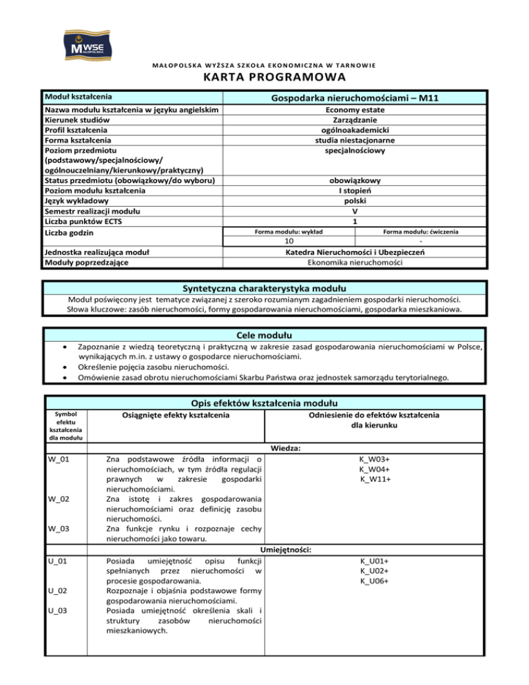 MAŁOP OLSKA WYŻSZ A SZ KOŁA E KONOMICZNA W TARN OW IE KARTA PROGRAMOWA Moduł kształcenia Gospodarka nieruchomościami – M11 Nazwa modułu kształcenia w języku angielskim Kierunek studiów Profil kształcenia Forma kształcenia Poziom przedmiotu (podstawowy/specjalnościowy/ ogólnouczelniany/kierunkowy/praktyczny) Status przedmiotu (obowiązkowy/do wyboru) Poziom modułu kształcenia Język wykładowy Semestr realizacji modułu Liczba punktów ECTS Liczba godzin Economy estate Zarządzanie ogólnoakademicki studia niestacjonarne specjalnościowy obowiązkowy I stopień polski V 1 Forma modułu: wykład Forma modułu: ćwiczenia 10 Katedra Nieruchomości i Ubezpieczeń Ekonomika nieruchomości Jednostka realizująca moduł Moduły poprzedzające Syntetyczna charakterystyka modułu Moduł poświęcony jest tematyce związanej z szeroko rozumianym zagadnieniem gospodarki nieruchomości. Słowa kluczowe: zasób nieruchomości, formy gospodarowania nieruchomościami, gospodarka mieszkaniowa. Cele modułu Zapoznanie z wiedzą teoretyczną i praktyczną w zakresie zasad gospodarowania nieruchomościami w Polsce, wynikających m.in. z ustawy o gospodarce nieruchomościami. Określenie pojęcia zasobu nieruchomości. Omówienie zasad obrotu nieruchomościami Skarbu Państwa oraz jednostek samorządu terytorialnego. Opis efektów kształcenia modułu Symbol efektu kształcenia dla modułu Osiągnięte efekty kształcenia Odniesienie do efektów kształcenia dla kierunku Wiedza: W_01 W_02 W_03 U_01 U_02 U_03 Zna podstawowe źródła informacji o nieruchomościach, w tym źródła regulacji prawnych w zakresie gospodarki nieruchomościami. Zna istotę i zakres gospodarowania nieruchomościami oraz definicję zasobu nieruchomości. Zna funkcje rynku i rozpoznaje cechy nieruchomości jako towaru. Umiejętności: Posiada umiejętność opisu funkcji spełnianych przez nieruchomości w procesie gospodarowania. Rozpoznaje i objaśnia podstawowe formy gospodarowania nieruchomościami. Posiada umiejętność określenia skali i struktury zasobów nieruchomości mieszkaniowych. K_W03+ K_W04+ K_W11+ K_U01+ K_U02+ K_U06+ K_01 K_02 Kompetencje społeczne: Jest przygotowany do umiejętnego analizowania i podejmowania decyzji co do wyboru korzystnych form gospodarowania nieruchomości. Ma świadomość postępowania etycznego w ocenie form gospodarowania nieruchomościami. K_K04++ K_K05+ KU07+ Treści kształcenia modułu Forma modułu: wykład 1. Istota i zakres gospodarowania nieruchomościami. 2. Zasobowe i strumieniowe ujęcie nieruchomości w gospodarce nieruchomościami. 3. Nieruchomość jako przedmiot gospodarowania. 4. Funkcje nieruchomości. 5. Źródła informacji o nieruchomościach: - Źródła prawa miejscowego, - Sądy wieczysto księgowe, księgi wieczyste, - Kataster nieruchomości, - Ewidencja sieci uzbrojenia terenu i mapa zasadnicza. 6. Formy gospodarowania nieruchomościami – dochody. 7. Nieruchomość jako przedmiot obrotu – wartość i cena nieruchomości. Nieruchomość jako towar. 8. Gospodarka zasobami mieszkaniowymi. Polityk mieszkaniowa Państwa. Gospodarowanie nieruchomościami mieszkalnymi Skarbu Państwa i jednostek samorządu terytorialnego. 9. Kompetencje organów administracji publicznej w zakresie gospodarowania nieruchomościami. 10. Prawo spółdzielcze. Literatura podstawowa Literatura uzupełniająca Forma modułu: ćwiczenia B. Wierzchowski, Gospodarka nieruchomościami. Podstawy prawne, Wydawnictwo LexisNexis Polska, Warszawa 2014 rok; M.W. Wierzchowski, Gospodarowanie gruntami w polskich miastach, Wydawnictwo Instytut Rozwoju Miast, Kraków 2011 rok; E. Kucharska-Stasiak, Nieruchomości w gospodarce rynkowej, Wydawnictwo Naukowe PWN, Warszawa 2012 rok; R. Cymerman, Gospodarka nieruchomościami, Wydawnictwo Uczelniane Politechniki Koszalińskiej, Koszalin 2009 rok. R. Wiśniewski, Gospodarowanie gminnymi zasobami nieruchomości, Wydawnictwo Uniwersytetu Warmińsko-Mazurskiego, Olsztyn 2008 rok; S. Źróbek, R. Źróbek, Gospodarka nieruchomościami z komentarzem do wybranych procedur, Wydawnictwo Gall, Katowice 2006 rok; Gospodarowanie tarnowskimi nieruchomościami. Konferencja w Tarnowie, Wydawnictwo MWSE w Tarnowie, Katedra Nieruchomości i Ubezpieczeń, Tarnów 2006 rok; R. Wiśniewski (red), Gospodarowanie gminnymi zasobami nieruchomości, Wydawnictwo Uniwersytetu Warmiński-Mazurskiego, Olsztyn 2008 rok; S. Belniak, M. Wierzchowski, Źródła informacji o nieruchomościach, Wydawnictwo MWSE w Tarnowie, Tarnów 2005 rok; M. Bac, Zagospodarowanie nieruchomości poprzemysłowych na cele mieszkaniowe i komercyjne na przykładzie loftów, Zeszyt Naukowy MWSE w Tarnowie, nr 2(21), s. 9 – 24, Wyd. MWSE w Tarnowie, Tarnów 2012 rok, (dostęp: http://zn.mwse.edu.pl/marzena-bac-zagospodarowanie-nieruchomoscipoprzemyslowych-na-cele-mieszkaniowe-i-komercyjne-na-przykladzie-loftow/); Periodyk: Świat Nieruchomości, Wyd. UE w Krakowie Ustawa z dnia 21 sierpnia 1997 roku o gospodarce nieruchomościami (Dz.U. Nr 261, poz. 2603). Metody dydaktyczne Wykład: metoda tradycyjna z wykorzystaniem metod audiowizualnych analiza przypadku, dyskusja.