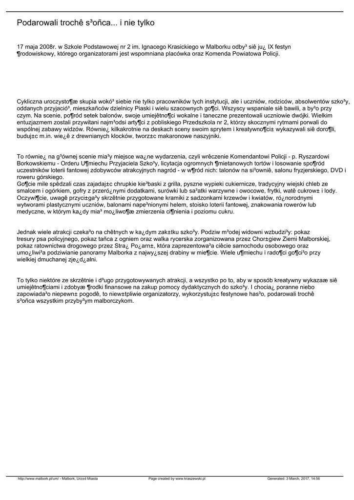 Podarowali trochê s³oñca... i nie tylko 17 maja 2008r. w Szkole Podstawowej nr 2 im. Ignacego Krasickiego w Malborku odby³ siê ju¿ IX festyn ¶rodowiskowy, którego organizatorami jest wspomniana placówka oraz Komenda Powiatowa Policji. Cykliczna uroczysto¶æ skupia wokó³ siebie nie tylko pracowników tych instytucji, ale i uczniów, rodziców, absolwentów szko³y, oddanych przyjació³, mieszkañców dzielnicy Piaski i wielu szacownych go¶ci. Wszyscy wspaniale siê bawili, a by³o przy czym. Na scenie, po¶ród setek balonów, swoje umiejêtno¶ci wokalne i taneczne prezentowali uczniowie dwójki. Wielkim entuzjazmem zostali przywitani najm³odsi arty¶ci z pobliskiego Przedszkola nr 2, którzy skocznymi rytmami porwali do wspólnej zabawy widzów. Równie¿ kilkakrotnie na deskach sceny swoim sprytem i kreatywno¶ci± wykazywali siê doro¶li, buduj±c m.in. wie¿ê z drewnianych klocków, tworz±c makaronowe naszyjniki. To równie¿ na g³ównej scenie mia³y miejsce wa¿ne wydarzenia, czyli wrêczenie Komendantowi Policji - p. Ryszardowi Borkowskiemu - Orderu U¶miechu Przyjaciela Szko³y, licytacja ogromnych ¶mietanowych tortów i losowanie spo¶ród uczestników loterii fantowej zdobywców atrakcyjnych nagród - w w¶ród nich: talonów na si³owniê, salonu fryzjerskiego, DVD i roweru górskiego. Go¶cie mile spêdzali czas zajadaj±c chrupkie kie³baski z grilla, pyszne wypieki cukiernicze, tradycyjny wiejski chleb ze smalcem i ogórkiem, gofry z przeró¿nymi dodatkami, surówki lub sa³atki warzywne i owocowe, frytki, watê cukrow± i lody. Oczywi¶cie, uwagê przyci±ga³y skrzêtnie przygotowane kramiki z sadzonkami krzewów i kwiatów, ró¿norodnymi wytworami plastycznymi uczniów, balonami nape³nionymi helem, stoisko loterii fantowej, znakowania rowerów lub medyczne, w którym ka¿dy mia³ mo¿liwo¶æ zmierzenia ci¶nienia i poziomu cukru. Jednak wiele atrakcji czeka³o na chêtnych w ka¿dym zak±tku szko³y. Podziw m³odej widowni wzbudzi³y: pokaz tresury psa policyjnego, pokaz tañca z ogniem oraz walka rycerska zorganizowana przez Chor±giew Ziemi Malborskiej, pokaz ratownictwa drogowego przez Stra¿ Po¿arn±, która zaprezentowa³a ciêcie samochodu osobowego oraz umo¿liwi³a podziwianie panoramy Malborka z najwy¿szej drabiny w mie¶cie. Wiele u¶miechu i rado¶ci go¶ci³o przy wielkiej dmuchanej zje¿d¿alni. To tylko niektóre ze skrzêtnie i d³ugo przygotowywanych atrakcji, a wszystko po to, aby w sposób kreatywny wykazaæ siê umiejêtno¶ciami i zdobyæ ¶rodki finansowe na zakup pomocy dydaktycznych do szko³y. I chocia¿ poranne niebo zapowiada³o niepewn± pogodê, to niew±tpliwie organizatorzy, wykorzystuj±c festynowe has³o, podarowali trochê s³oñca wszystkim przyby³ym malborczykom. http://www.malbork.pl/um/ - Malbork, Urz±d Miasta Page created by www.kraszewski.pl Generated: 3 March, 2017, 14:56