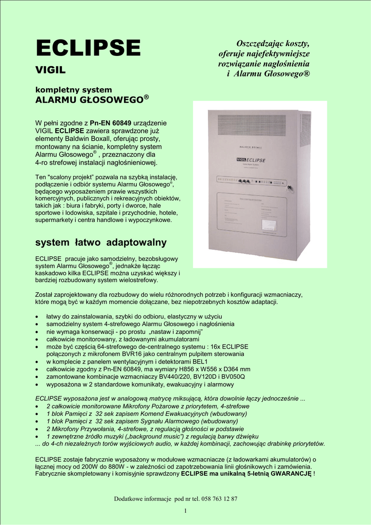 ECLIPSE Oszczędzając koszty, oferuje najefektywniejsze rozwiązanie nagłośnienia i Alarmu Głosowego® VIGIL kompletny system ALARMU GŁOSOWEGO® W pełni zgodne z Pn-EN 60849 urządzenie VIGIL ECLIPSE zawiera sprawdzone już elementy Baldwin Boxall, oferując prosty, montowany na ścianie, kompletny system Alarmu Głosowego® , przeznaczony dla 4-ro strefowej instalacji nagłośnieniowej. Ten "scalony projekt” pozwala na szybką instalację, podłączenie i odbiór systemu Alarmu Głosowego®, będącego wyposażeniem prawie wszystkich komercyjnych, publicznych i rekreacyjnych obiektów, takich jak : biura i fabryki, porty i dworce, hale sportowe i lodowiska, szpitale i przychodnie, hotele, supermarkety i centra handlowe i wypoczynkowe. system łatwo adaptowalny ECLIPSE pracuje jako samodzielny, bezobsługowy ® system Alarmu Głosowego , jednakże łącząc kaskadowo kilka ECLIPSE można uzyskać większy i bardziej rozbudowany system wielostrefowy. Został zaprojektowany dla rozbudowy do wielu różnorodnych potrzeb i konfiguracji wzmacniaczy, które mogą być w każdym momencie dołączane, bez niepotrzebnych kosztów adaptacji. • • • • • • • • • łatwy do zainstalowania, szybki do odbioru, elastyczny w użyciu samodzielny system 4-strefowego Alarmu Głosowego i nagłośnienia nie wymaga konserwacji - po prostu „nastaw i zapomnij” całkowicie monitorowany, z ładowanymi akumulatorami może być częścią 64-strefowego de-centralnego systemu : 16x ECLIPSE połączonych z mikrofonem BVR16 jako centralnym pulpitem sterowania w komplecie z panelem wentylacyjnym i detektorami BEL1 całkowicie zgodny z Pn-EN 60849, ma wymiary H856 x W556 x D364 mm zamontowane kombinacje wzmacniaczy BV440/220, BV120D i BV050Q wyposażona w 2 standardowe komunikaty, ewakuacyjny i alarmowy ECLIPSE wyposażona jest w analogową matrycę miksującą, która dowolnie łączy jednocześnie ... • 2 całkowicie monitorowane Mikrofony Pożarowe z priorytetem, 4-strefowe • 1 blok Pamięci z 32 sek zapisem Komend Ewakuacyjnych (wbudowany) • 1 blok Pamięci z 32 sek zapisem Sygnału Alarmowego (wbudowany) • 2 Mikrofony Przywołania, 4-strefowe, z regulacją głośności w podstawie • 1 zewnętrzne źródło muzyki („background music”) z regulacją barwy dźwięku ... do 4-ch niezależnych torów wyjściowych audio, w każdej kombinacji, zachowując drabinkę priorytetów. ECLIPSE zostaje fabrycznie wyposażony w modułowe wzmacniacze (z ładowarkami akumulatorów) o łącznej mocy od 200W do 880W - w zależności od zapotrzebowania linii głośnikowych i zamówienia. Fabrycznie skompletowany i komisyjnie sprawdzony ECLIPSE ma unikalną 5-letnią GWARANCJĘ ! Dodatkowe informacje pod nr tel. 058 763 12 87 1 SZYBKIE i TANIE ROZWIĄZANIE KOMPLETNEGO SYSTEMU ALARMU GŁOSOWEGO® i 4-STREFOWEGO NAGŁOŚNIENIA 7 kroków do końcowej Instalacji 1. 2. 3. 4. 5. 6. 7. ZAMONTUJ WSPORNIK MONTAŻOWY NA ŚCIANIE - wybierz pustą ścianę, w mało ruchliwym miejscu, wolnym od kurzu i wilgoci, i obierając odpowiednią dla dostępu serwisanta wysokość, wykonaj w niej 4 otwory. PRZYKRĘĆ ECLIPSE DO WSPORNIKA - osadzać mocno, zapewniając dostęp dla dobrej wentylacji i czyszczenia. Jesteś już gotowy do przyłączania. PODŁĄCZ OBWODY GŁOŚNIKOWE - sprawdź czy głośniki posiadają odpowiednie zabezpieczenia p. pożarowe, a także czy ich moc i nastawy regulacyjne odpowiadają specyfikacji i warunkom użytkowania systemu PRZYŁĄCZ BEL1 -DETEKTORY MONITORUJĄCE KONIEC LINII - dla kontrolowania uszkodzeń linii, co 20 sekund ECLIPSE wysyła w obwody głośnikowe niesłyszalny ton, który musi wrócić do urządzenia (max. PODŁACZ POŻĄROWY SYSTEM ALARMOWY - ECLIPSE może być przyłączony do różnych typów central pożarowych za pośrednictwem unikalnego, wewnętrznego interface’u (a także mikrofony i muzykę) SPRAWDŹ POPRAWNOŚĆ POŁĄCZEŃ - upewnij się, że połączenie wszystkich linii głośnikowych, przyłączy mikrofonowych i muzyki sa prawidłowo WŁĄCZ URZĄDZENIE - system ECLIPSE będzie pracował 24 godziny na dobę, 365 dni w roku, nie wymagając, dłuższych niż przewidziane specyfikacją przerw serwisowych. Po prostu : „Włącz i Zapomnij !” System ECLIPSE posiada : • monitorowane przyłącze do współpracy z systemem p. pożarowym • 1 blok pamięci EPROM z 32 sek zapisem Komend Ewakuacyjnych • 1 blok pamięci EPROM z 32 sek zapisem Sygnału Alarmowego • głośniczek do kontroli dźwiękowej wszystkich obwodów, z gniazdem słuchawki • opcjonalnie – gong przed-zapowiedziowy dla każdego mikrofonu • 3 pasmową regulację barwy tonu muzyki, z ogranicznikiem poziomu • obwody do zdalnej regulacji poziomu „muzyki” w każdej strefie głośnikowej • podświetlany przełącznik testowania wskaźników uszkodzeń • zestaw LED wskaźników kontroli stanu pracy i awarii obwodów • modułowe wzmacniacze 100V Vigil o mocy 4x50 do 2x440W (różne opcje) • komplet detektorów końca linii głośnikowych BEL1 • obwody monitorowania 8 linii głośnikowych + wzmacniacz awaryjny • ładowarki sieciowe do akumulatorów 24V zasilania rezerwowego dodatkowo: • mikrofony – strefowe i pożarowe • moduł BVCOM485 do połączeń de-centralnych • dodatkowe detektory końca linii BEL1 • 2 dodatkowe komunikaty cyfrowe • ścienne regulatory głośności muzyki w strefie 4-ry niezależne strefy głośnikowe - każda z podwójnymi liniami głośnikowymi A oraz B - posiadają możliwość zdalnej regulacji poziomu muzyki, za pomocą (opcjonalnych) regulatorów podtynkowych. System VIGIL ECLIPSE współpracuje z centrala p. pożarową, która może selektywnie wyzwolić sygnał alarmowy i słowne komendy ewakuacyjne, z wewnętrznego banku pamięci cyfrowej. Mikrofony pożarowe umożliwiają przekaz „ręczny” komend ewakuacyjnych do wybranych stref w układzie „najwyższego priorytetu”. Wszystkie obwody systemu ECLIPSE (z wyjątkiem wejści