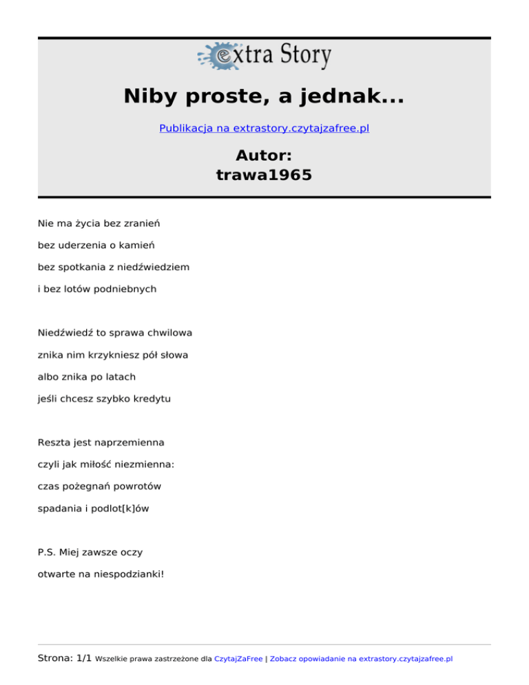 Niby proste, a jednak... Publikacja na extrastory.czytajzafree.pl Autor: trawa1965 Nie ma życia bez zranień bez uderzenia o kamień bez spotkania z niedźwiedziem i bez lotów podniebnych Niedźwiedź to sprawa chwilowa znika nim krzykniesz pół słowa albo znika po latach jeśli chcesz szybko kredytu Reszta jest naprzemienna czyli jak miłość niezmienna: czas pożegnań powrotów spadania i podlot[k]ów P.S. Miej zawsze oczy otwarte na niespodzianki! Strona: 1/1 Wszelkie prawa zastrzeżone dla CzytajZaFree | Zobacz opowiadanie na extrastory.czytajzafree.pl