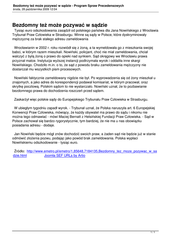 Bezdomny też może pozywać w sądzie - Program Spraw Precedensowych środa, 28 października 2009 12:04 Bezdomny też może pozywać w sądzie Tysiąc euro odszkodowania zasądził od polskiego państwa dla Jana Nowińskiego z Wrocławia Trybunał Praw Człowieka w Strasburgu. Winne są sądy w Polsce, które dyskryminowały mężczyznę za brak stałego adresu zameldowania Wrocławianin w 2002 r. roku rozwiódł się z żoną, a ta wymeldowała go z mieszkania swojej babci, w którym razem mieszkali. Nowiński, policjant, choć nie miał zameldowania, chciał walczyć z byłą żoną o prawo do opieki nad synkiem. Sąd okręgowy we Wrocławiu prawa przyznał matce. Instytucja wyższej instancji podtrzymała wyrok i oddaliła inne skargi Nowińskiego. Chodziło m.in. o to, że sąd z powodu braku zameldowania mężczyzny nie dostarczał mu wszystkich pism procesowych. Nowiński faktycznie zameldowany nigdzie nie był. Po wyprowadzenia się od żony mieszkał u znajomych, a jako adres do korespondencji podawał komisariat, w którym pracował, oraz skrytkę pocztową. Polskim sądom to nie wystarczało. Nowiński uznał, że to pozbawianie bezdomnego prawa do dochodzenia roszczeń przed sądem. Zaskarżył więc polskie sądy do Europejskiego Trybunału Praw Człowieka w Strasburgu. W ubiegłym tygodniu zapadł wyrok. - Trybunał uznał, że Polska naruszyła art. 6 Europejskiej Konwencji Praw Człowieka, mówiący, że każdy obywatel ma prawo do sądu i nikomu nie można tego odmawiać - mówi Maciej Bernatt z Helsińskiej Fundacji Praw Człowieka. - Sąd w Polsce zachował się bardzo rygorystycznie, tym bardziej, że nie ma u nas obowiązku posiadania adresu - dodaje. Jan Nowiński będzie mógł znów dochodzić swoich praw, a żaden sąd nie będzie już w stanie odmówić złożenia pozwu, podając jako powód brak zameldowania. Polska wypłaci Nowińskiemu odszkodowanie - tysiąc euro. Źródło: http://www.emetro.pl/emetro/1,85648,7184135,Bezdomny_tez_moze_pozywac_w_sa dzie.html Joomla SEF URLs by Artio 1/1