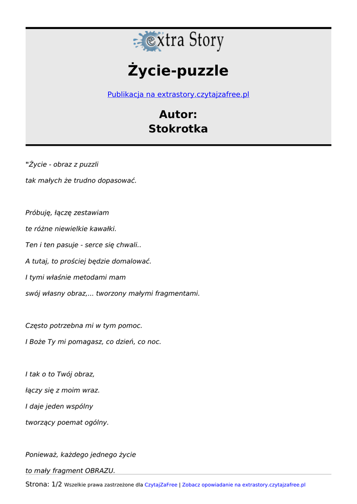 Życie-puzzle Publikacja na extrastory.czytajzafree.pl Autor: Stokrotka "Życie - obraz z puzzli tak małych że trudno dopasować. Próbuję, łączę zestawiam te różne niewielkie kawałki. Ten i ten pasuje - serce się chwali.. A tutaj, to prościej będzie domalować. I tymi właśnie metodami mam swój własny obraz,... tworzony małymi fragmentami. Często potrzebna mi w tym pomoc. I Boże Ty mi pomagasz, co dzień, co noc. I tak o to Twój obraz, łączy się z moim wraz. I daje jeden wspólny tworzący poemat ogólny. Ponieważ, każdego jednego życie to mały fragment OBRAZU. Strona: 1/2 Wszelkie prawa zastrzeżone dla CzytajZaFree | Zobacz opowiadanie na extrastory.czytajzafree.pl Na niego składa się uwierzcie, NASZ WSPÓLNY wysiłek, z całego czasu." Strona: 2/2 Wszelkie prawa zastrzeżone dla CzytajZaFree | Zobacz opowiadanie na extrastory.czytajzafree.pl