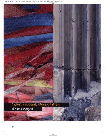RZ_MFWC_10_09_19_00_Zgorzelec 350-351:01 21.08.2008 5:20 Uhr Seite 350 Angielskie madrygały / English Madrigals The King's Singers 350 RZ_MFWC_10_09_19_00_Zgorzelec 350-351:01 21.08.2008 15:45 Uhr Seite 351 Środa / Wednesday 10.09.2008 godz. 19.00 / 7.00 pm Zgorzelec Miejski Dom Kultury ul. Parkowa 1 godz. 19.00 / 7.00 pm Angielskie madrygały / English Madrigls Wykonawcy / Performers The King's Singers David Hurley kontratenor / counter-tenor 10.09.2008 Robin Tyson kontratenor / counter-tenor Paul Phoenix tenor / tenor Philip Lawson baryton / baritone Christopher Gabbitas baryton / baritone Śr / We Stephen Connolly bas / bass Program koncertu / Concert programme Madrigals from Renaissance England Thomas Morley (1557-1602) Now is the Month of Maying Orlando Gibbons (1583-1625) The Silver Swan John Farmer (1570-1602) Fair Phyllis I Saw Sitting All Alone John Wilbye (1574-1638) Draw on, Sweet Night Thomas Weelkes (1575-1623) As Vesta was from Latmos Hill Descending Partsongs from the Time of Queen Victoria Sir John Rogers (1780-1847) Hears Not my Phyllis John William Hobbs (1799-1877) Phillis Is My Only Joy Charles Wood (1866-1926) There Comes a New Moon Henry David Leslie (1822-1896) Charm Me Asleep Paradise Lost Paul Patterson (b. 1947) Time Piece op. 16 MECENAT ZGORZELEC Czas trwania koncertu / duration of the concert c. 1:00 Więcej o programie przy koncercie 8.09.2008, godz. 19.00 w Lubomierzu For more details, see 8.09.2008, 7.00 pm in Lubomierz 351