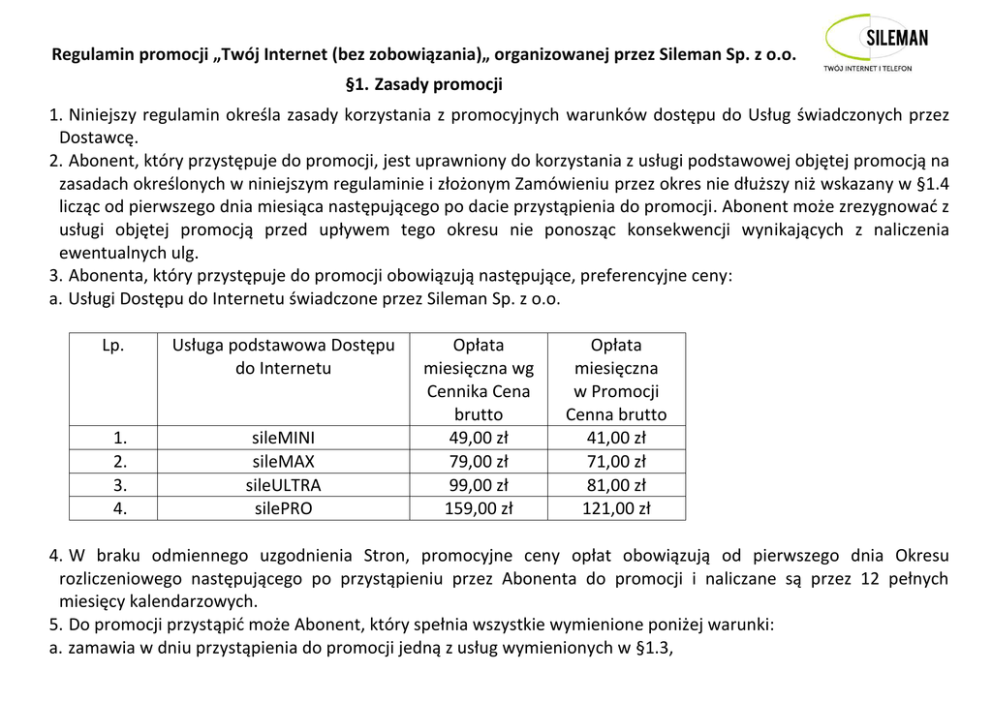 Regulamin promocji „Twój Internet (bez zobowiązania)„ organizowanej przez Sileman Sp. z o.o. §1. Zasady promocji 1. Niniejszy regulamin określa zasady korzystania z promocyjnych warunków dostępu do Usług świadczonych przez Dostawcę. 2. Abonent, który przystępuje do promocji, jest uprawniony do korzystania z usługi podstawowej objętej promocją na zasadach określonych w niniejszym regulaminie i złożonym Zamówieniu przez okres nie dłuższy niż wskazany w §1.4 licząc od pierwszego dnia miesiąca następującego po dacie przystąpienia do promocji. Abonent może zrezygnować z usługi objętej promocją przed upływem tego okresu nie ponosząc konsekwencji wynikających z naliczenia ewentualnych ulg. 3. Abonenta, który przystępuje do promocji obowiązują następujące, preferencyjne ceny: a. Usługi Dostępu do Internetu świadczone przez Sileman Sp. z o.o. Lp. 1. 2. 3. 4. Usługa podstawowa Dostępu do Internetu sileMINI sileMAX sileULTRA silePRO Opłata miesięczna wg Cennika Cena brutto 49,00 zł 79,00 zł 99,00 zł 159,00 zł Opłata miesięczna w Promocji Cenna brutto 41,00 zł 71,00 zł 81,00 zł 121,00 zł 4. W braku odmiennego uzgodnienia Stron, promocyjne ceny opłat obowiązują od pierwszego dnia Okresu rozliczeniowego następującego po przystąpieniu przez Abonenta do promocji i naliczane są przez 12 pełnych miesięcy kalendarzowych. 5. Do promocji przystąpić może Abonent, który spełnia wszystkie wymienione poniżej warunki: a. zamawia w dniu przystąpienia do promocji jedną z usług wymienionych w §1.3, b. upłynął w stosunku do Abonenta minimalny okres niezbędny do skorzystania z dotychczas obowiązujących warunków promocyjnych, w zakresie usług objętych promocją, do której przystępuje Abonent, c. zamawia usługę Dostawcy w Lokalu, w którym w okresie trzech miesięcy poprzedzających przystąpienie do promocji Dostawca nie świadczył żadnych usług lub zamawia usługę wymienioną w §1.3 o cenie wg Cennika wyższej od ceny wg Cennika usługi zamawianej w dniu przystąpienia. 6. W szczególnie uzasadnionych przypadkach, Dostawca może wyrazić zgodę na przystąpienie do promocji przez Abonenta niespełniającego warunków wymienionych w §1.5. W przypadku zgody na przystąpienie do promocji w związku z niespełnieniem warunku wskazanego w §1.5.b. Dostawca zrzeka się roszczeń o zapłatę ulg wynikających z dotychczas obowiązujących warunków promocyjnych chyba, że w Porozumieniu w sprawie rozwiązania Umowy lub odstąpieniu od promocji wskazano inaczej. 7. Postanowień Umowy oraz Zamówienia dotyczących minimalnego okresu korzystania z usług wymaganego do skorzystania z niniejszych warunków promocyjnych oraz uprawniających Dostawcę do obciążenia Abonenta kwotami udzielonych w ramach niniejszej promocji ulg nie stosuje się. 8. Po upływie okresu promocyjnego, Abonent będzie zobowiązany do uiszczania opłat zgodnie z Cennikiem obowiązującym w dniu przystąpienia przez Abonenta do promocji. Zmiana Cennika, w trakcie obowiązania Umowy na warunkach promocyjnych, rodzi skutki wskazane w Umowie. 9. Regulamin promocji wchodzi w życie dnia 21.08.2015 r. obowiązuje do odwołania. Sileman sp. z o.o. z siedzibą w Rudzie Śląskiej (41-710) przy ul. Dąbrowskiego 35, zarejestrowaną w KRS pod numerem 207875 (Sąd Rejonowy w Gliwicach, X Wydział Gospodarczy KRS), NIP 6412315845, kapitał zakładowy 190000 zł.