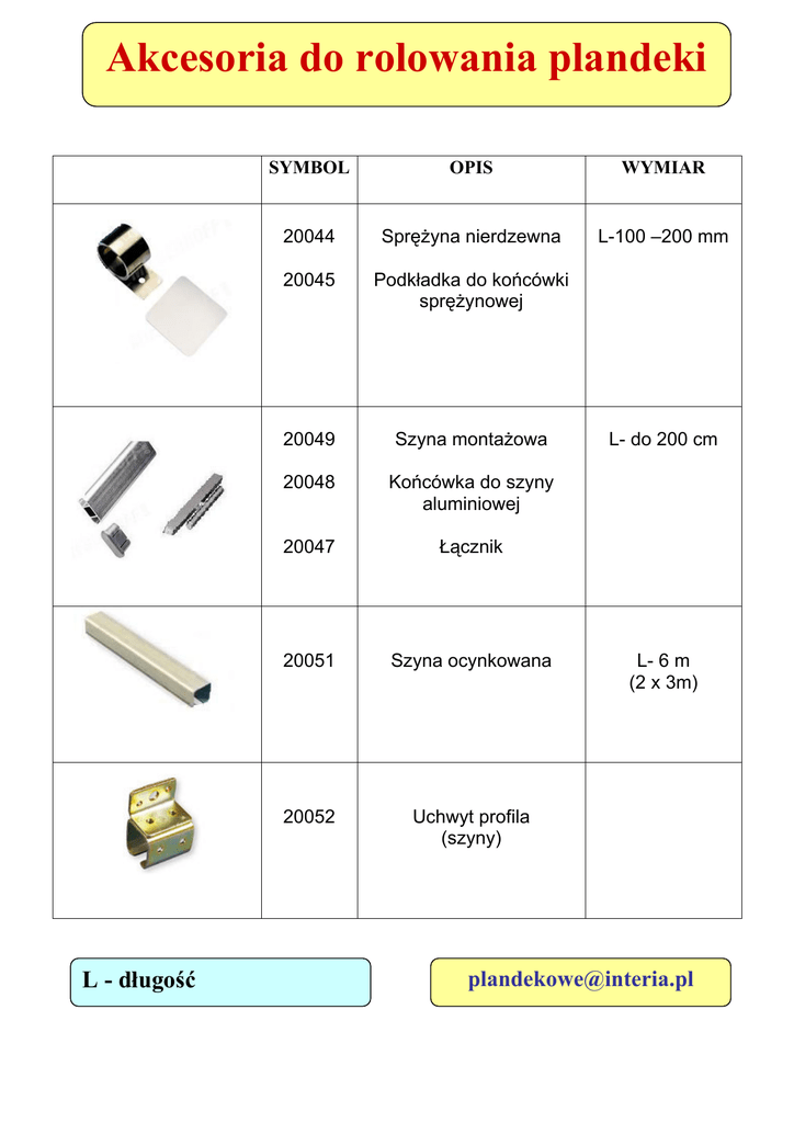 Akcesoria do rolowania plandeki L - długość SYMBOL OPIS WYMIAR 20044 SpręŜyna nierdzewna L-100 –200 mm 20045 Podkładka do końcówki spręŜynowej 20049 Szyna montaŜowa 20048 Końcówka do szyny aluminiowej 20047 Łącznik 20051 Szyna ocynkowana 20052 Uchwyt profila (szyny) L- do 200 cm L- 6 m (2 x 3m) [email protected]
