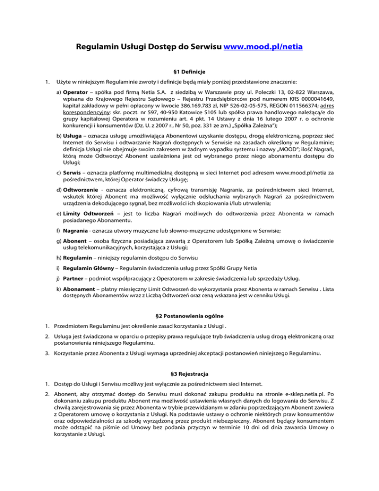 Regulamin Usługi Dostęp do Serwisu www.mood.pl/netia