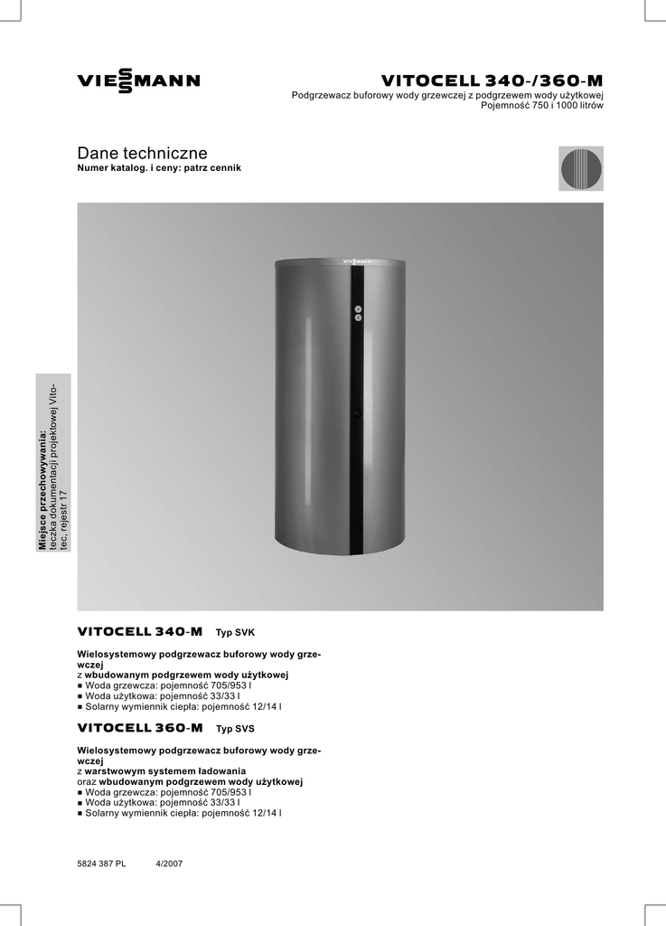 VIESMANN VITOCELL 340‐/360‐M Podgrzewacz buforowy wody grzewczej z podgrzewem wody użytkowej Pojemność 750 i 1000 litrów Dane techniczne Miejsce przechowywania: teczka dokumentacji projektowej Vitotec, rejestr 17 Numer katalog. i ceny: patrz cennik VITOCELL 340‐M Typ SVK Wielosystemowy podgrzewacz buforowy wody grzewczej z wbudowanym podgrzewem wody użytkowej & Woda grzewcza: pojemność 705/953 l & Woda użytkowa: pojemność 33/33 l & Solarny wymiennik ciepła: pojemność 12/14 l VITOCELL 360‐M Typ SVS Wielosystemowy podgrzewacz buforowy wody grzewczej z warstwowym systemem ładowania oraz wbudowanym podgrzewem wody użytkowej & Woda grzewcza: pojemność 705/953 l & Woda użytkowa: pojemność 33/33 l & Solarny wymiennik ciepła: pojemność 12/14 l 5824 387 PL 4/2007 Informacja o wyrobie Vitocell 340‐M i Vitocell 360‐M Możliwość przyłączenia kilku kotłów i higieniczny podgrzew wody użytkowej dla potrzeb dużego poboru w podgrzewaczu uniwersalnym nie zajmującym dużej powierzchni. Zalety w skrócie & & & & & & & Vitocell 340‐M i Vitocell 360‐M – zestawienie podgrzewacza buforowego wody grzewczej i pojemnościowego podgrzewacza wody. Przeznaczone dla instalacji grzewczych z kilkoma wytwornicami ciepła. Szczególnie dobrze przystosowane do pracy w połączeniu z systemami solarnymi firmy Viessmann do podgrzewu wody użytkowej i wspomagania ogrzewania. Dzięki przyłączom na różnej wysokości możliwe jest zastosowanie różnorodnych wytwornic ciepła, np. kotła na paliwo stałe lub pompy ciepła. Nie ma to wpływu na rozwarstwienie termiczne. Niewielkie zapotrzebowanie na miejsce i prosty montaż – podgrzewacz wody użytkowej i podgrzewacz buforowy w jednym urządzeniu. Zamocowana swobodnie w komorze podgrzewacza elastyczna wężownica z rury falistej, z wysokogatunkowej stali nierdzewnej, w której podgrzewana jest woda użytkowa. Optymalne wykorzystanie energii solarnej dzięki dobremu przekazywaniu ciepła w dolnej części podgrzewacza, dzięki dużej powierzchni wymiany ciepła wężownicy z rury falistej. Vitocell 360‐M: System ładowania warstwowego zapewnia przekazywanie energii słonecznej odpowiedniej warstwie wody zależnie od jej temperatury, dzięki temu ogrzana solarnie woda użytkowa jest szybko dostępna. Vitocell 340‐M (typ SVK) – wielosystemowy podgrzewacz buforowy wody grzewczej z wbudowanym podgrzewem wody użytkowej 2 VIESMANN Zasilanie wodą grzewczą 1 / odpowietrzanie Ciepła woda użytkowa / cyrkulacja Wężownica wody użytkowej z rury falistej, ze stali nierdzewnej Zasilanie wodą grzewczą 2 / powrót wody grzewczej 1 Grzałka elektryczna EHE Powrót wody grzewczej 2 Powrót wody grzewczej 3 Zimna woda Spust Powrót wody grzewczej / spust instalacji solarnej Zasilanie wodą grzewczą / odpowietrzanie instalacji solarnej 5824 387 PL A B C D E F H K L M N VITOCELL 340‐/360‐M Zalety w skrócie (ciąg dalszy) Vitocell 360‐M (typ SVS) – wielosystemowy podgrzewacz buforowy wody grzewczej z warstwowym systemem ładowania i z wbudowanym podgrzewem wody użytkowej Zasilanie wodą grzewczą 1 / odpowietrzanie Ciepła woda użytkowa / cyrkulacja Wężownica wody użytkowej z rury falistej, ze stali nierdzewnej Zasilanie wodą grzewczą 2 / powrót wody grzewczej 1 Grzałka elektryczna EHE Powrót wody grzewczej 2 Warstwowy system ładowania Powrót wody grzewczej 3 Zimna woda Spust Powrót wody grzewczej / spust instalacji solarnej Zasilanie wodą grzewczą / odpowietrzanie instalacji solarnej 5824 387 PL A B C D E F G H K L M N VITOCELL 340‐/360‐M VIESMANN 3 Dane techniczne Vitocell 340‐M (typ SVK) / Vitocell 360‐M (typ SVS) Dane techniczne Do magazynowania wody grzewczej i podgrzewu wody użytkowej w połączeniu z instalacjami solarnymi, pompami ciepła i kotłami na paliwo stałe. Przystosowany do następujących instalacji: & Temperatura wody na zasilaniu wodą grzewczą do 110°C & Temperatura wody na zasilaniu po stronie solarnej do 140°C Nr rejestru DIN Pojemność podgrzewacza I Woda grzewcza I Woda użytkowa I Solarny wymiennik ciepła I Wymiary Długość (7) mm – z izolacją cieplną a mm – bez izolacji cieplnej o mm Szerokość b mm Wysokość – z izolacją cieplną c mm – bez izolacji cieplnej mm Wymiar przechylenia – bez izolacji cieplnej mm Min. wys. montażowa mm Ciężar – z izolacją cieplną kg – bez izolacji cieplnej kg Przyłącza Zasilanie i powrót wody grzewczej R Zimna/ciepła woda R Zasilanie i powrót wody grzewczej G (solar) Solarny wymiennik ciepła Powierzchnia grzewcza m2 Wymiennik ciepła c.w.u. Powierzchnia grzewcza m2 Maks. możl. do przył. pow. czynna absorbera Vitosol m2 1 Ilość ciepła dyżurnego * q BS przy różnicy temp. 45 K kWh/ 24 h & & & & Dopuszczalna temperatura wody użytkowej 95°C Ciśnienie robocze po stronie wody grzewczej do 3 bar Ciśnienie robocze po stronie solarnej do 10 bar Ciśnienie robocze po stronie wody użytkowej do 10 bar Vitocell 340‐M 0262/06‐10MC/E 750 705 33 12 Vitocell 360‐M 0263/06‐10MC/E 750 705 33 12 1000 953 33 14 1000 953 33 14 960 750 1000 1060 850 1100 960 750 1000 1060 850 1100 2100 2002 2100 2044 2100 2002 2100 2044 2070 2190 2130 2190 2070 2190 2130 2190 212 197 240 224 212 197 240 224 1 1 1 1¼ 1¼ 1 1 1 1 1¼ 1¼ 1 1,8 2,1 1,8 2,1 7,2 7,2 7,2 7,2 12 20 12 20 1,47 * 2 1,55 * 2 1,47 * 2 1,55 * 2 Wydajność stała Vitocell 340‐M i Vitocell 360‐M Wydajność stała * 3 Przy podgrzewie wody użytkowej z 10 na 45°C i temperaturze wody na zasilaniu wodą grzewczą wynoszącej 70°C przy podanym poniżej przepływie wody grzewczej (zmierzonym na HV1/HR1) Natężenie przepływu wody grzewczej dla podanych wartości wydajności stałej Wydajność stała * 3 Przy podgrzewie wody użytkowej z 10°C na 60°C i temperaturze wody na zasilaniu wodą grzewczą wynoszącej 70°C przy podanym poniżej przepływie wody grzewczej (zmierzonym na HV1/HR1) Natężenie przepływu wody grzewczej dla podanych wartości moc