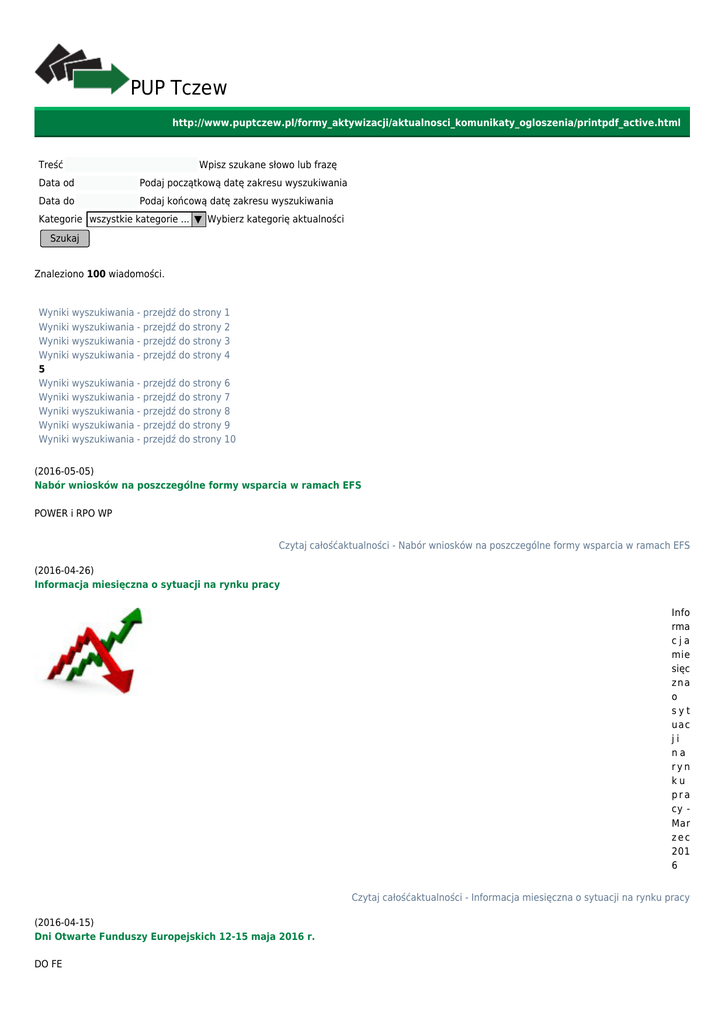 PUP Tczew http://www.puptczew.pl/formy_aktywizacji/aktualnosci_komunikaty_ogloszenia/printpdf_active.html Treść Wpisz szukane słowo lub frazę Data od Podaj początkową datę zakresu wyszukiwania Data do Podaj końcową datę zakresu wyszukiwania Kategorie wszystkie kategorie ... ▼ Wybierz kategorię aktualności Szukaj Znaleziono 100 wiadomości. Wyniki wyszukiwania - przejdź do strony 1 Wyniki wyszukiwania - przejdź do strony 2 Wyniki wyszukiwania - przejdź do strony 3 Wyniki wyszukiwania - przejdź do strony 4 5 Wyniki wyszukiwania - przejdź do strony 6 Wyniki wyszukiwania - przejdź do strony 7 Wyniki wyszukiwania - przejdź do strony 8 Wyniki wyszukiwania - przejdź do strony 9 Wyniki wyszukiwania - przejdź do strony 10 (2016-05-05) Nabór wniosków na poszczególne formy wsparcia w ramach EFS POWER i RPO WP Czytaj całośćaktualności - Nabór wniosków na poszczególne formy wsparcia w ramach EFS (2016-04-26) Informacja miesięczna o sytuacji na rynku pracy Info rma cja mie sięc zna o syt uac ji na ryn ku pra cy Mar zec 201 6 Czytaj całośćaktualności - Informacja miesięczna o sytuacji na rynku pracy (2016-04-15) Dni Otwarte Funduszy Europejskich 12-15 maja 2016 r. DO FE Czytaj całośćaktualności - Dni Otwarte Funduszy Europejskich 12-15 maja 2016 r. (2016-04-13) KOMUNIKAT ŚR OD KI PFR ON Czy taj cał ość akt ual noś ci KO MU NIK AT (2016-04-12) KOMUNIKAT Wst rzy ma nie nab oru wni osk ów dot ycz ący ch sta ży w ram ach proj ekt u „Ak tyw izac ja osó b mło dyc h poz ost ają cyc h bez pra cy w po wie cie tcz ews kim (II)” Czytaj całośćaktualności - KOMUNIKAT (2016-03-29) Informacja miesięczna o sytuacji na rynku pracy Info rma cja mie sięc zna o syt uac ji na ryn ku pra cy Lut y 201 6 Czytaj całośćaktualności - Informacja miesięczna o sytuacji na rynku pracy (2016-02-23) Wstrzymanie naboru wniosków w ramach Krajowego Funduszu Szkoleniowego KO MU NIK AT ! Czy taj cał ość akt ual noś ci Wst rzy ma nie nab oru wni osk ów w ram ach Kraj ow ego Fun dus zu Szk ole nio we go (2016-01-28) Informacja miesięczna o sytuacji na rynku pracy Info rma cja mie sięc zna o syt uac ji na ryn ku pra cy Sty cze ń 201 6 Czytaj całośćaktualności - Informacja miesięczna o sytuacji na rynku pracy (2016-01-27) Informacja miesięczna o sytuacji na rynku pracy Info rma cja mie sięc zna o syt uac ji na ryn ku pra cy Gru dzi eń 201 5 Czytaj całośćaktualności - Informacja miesięczna o sytuacji na rynku pracy (2016-01-11) Katalog usług dla pracodawców Kat alo g usł ug dla pra cod awc ów Czytaj całośćaktualności - Katalog usług dla pracodawców Wyniki wyszukiwania - przejdź do strony 1 Wyniki wyszukiwania - przejdź do strony 2 Wyniki wyszukiwania - przejdź do strony 3 Wyniki wyszukiwania - przejdź do strony 4 5 Wyniki wyszukiwania - przejdź do strony 6 Wyniki wyszukiwania - przejdź do strony 7 Wyniki wyszukiwania - przejdź do strony 8 Wyniki wyszukiwania - przejdź do strony 9 Wyniki wyszukiwania - przejdź do strony 10