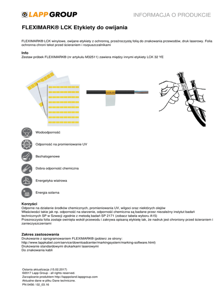 INFORMACJA O PRODUKCIE FLEXIMARK® LCK Etykiety do owijania FLEXIMARK® LCK winylowe, owijane etykiety z ochronną, przeźroczystą folią do znakowania przewodów, druk laserowy. Folia ochronna chroni tekst przed ścieraniem i rozpuszczalnikami Info Zestaw próbek FLEXIMARK® (nr artykułu M32511) zawiera między innymi etykiety LCK 32 YE Wodoodporność Odporność na promieniowanie UV Bezhalogenowe Dobra odporność chemiczna Energetyka wiatrowa Energia solarna Korzyści Odporne na działanie środków chemicznych, promieniowania UV, wilgoci oraz niektórych olejów Właściwości takie jak np. odporność na starzenie, odporność chemiczna są badane przez niezależny instytut badań technicznych SP w Szwecji zgodnie z metodą badań SP 2171 (zobacz tabela wyboru A15) Przezroczysta folia zostaje owinięta wokół przewodu i zakrywa opisaną etykietę tak, że nadruk jest chroniony przed ścieraniem i zanieczyszczeniami Zakres zastosowania Drukowanie z oprogramowaniem FLEXIMARK® (pobierz ze strony: http://www.lappkabel.com/service/downloadcenter/markingsystem/marking-software.html) Drukowanie standardowymi drukarkami laserowymi Do znakowania kabli Ostania aktualizacja (15.02.2017) ©2017 Lapp Group - all rights reserved. Zarządzanie produktem http://lapppoland.lappgroup.com Aktualne dane w pliku Dane techniczne. PN 0456 / 02_03.16 INFORMACJA O PRODUKCIE FLEXIMARK® LCK Etykiety do owijania Uwaga Zaleca się stosowanie oryginalnych kartridży producenta drukarki Najlepsze wyniki drukowania daje zastosowanie drukarek laserowych z prostymi podajnikami papieru, bez prowadzenia papieru na rolkach i o niewielkiej produkcji ciepła Arkusz ładuje się do drukarki w trybie podajnika ręcznego Zakres dostawy 10 lub 100 perforowanych arkuszy etykiet DINA 4 (w zależności od opakowania) Dane techniczne Klasyfikacja: ETIM 5.0 Class-ID: EC001288 Opis klasy ETIM 5.0: Materiał do etykiet Samoprzylepne: Trwała akrylowa warstwa kleju Kolor: Biały lub żółty Materiał: Bezhalogenowy poliester Grubość: 0,025 mm Zakres temperatury: Od -40°C do +125°C Minimalna temperatura obróbki: +10°C Wskazówka Fotografie nie mogą być używane do wymiarowania oraz nie stanowią szczegółowego odwzorowania przedstawionych produktów. * Podane ceny to ceny netto bez podatku VAT i dodatkowych opłat. Sprzedaż klientom biznesowym. Produkty FLEXIMARK® sprzedawane są w pełnych opakowaniach. Np. w przypadku jeśli zamówienia etykiet LCK 640 32 wystarczy zamówić 1 opakowanie zamiast 640 pojedynczych sztuk. Ostania aktualizacja (15.02.2017) ©2017 Lapp Group - all rights reserved. Zarządzanie produktem http://lapppoland.lappgroup.com Aktualne dane w pliku Dane techniczne. PN 0456 / 02_03.16 Powered by TCPDF (www.tcpdf.org) Kolor Szerokość x długość [mm] Powierzchnia do opisu Dla średnicy Liczba oznaczników Liczba etykiet na zewnętrznej - Ø [mm] na jednostkę dostawy stronie (PU) 83256143 FLEXIMARK® Etykieta kablowa LCK 32 WH biały 25 x 33,5 25 x 12,7 4-7 640 64 83256142 FLEXIMARK® Etykieta kablowa LCK 32 YE żółty 25 x 33,5 25 x 12,7 4-7 640 64 83256145 FLEXIMARK® Etykieta kablowa LCK 35 WH biały 25 x 55 25 x 19 6 - 12 400 40 83256144 FLEXIMARK® Etykieta kablowa LCK 35 YE żółty 25 x 55 25 x 19 6 - 12 400 40 83256147 FLEXIMARK® Etykieta kablowa LCK 40 WH biały 25 x 94 25 x 25,4 8 - 21 240 24 83256146 FLEXIMARK® Etykieta kablowa LCK 40 YE żółty 25 x 94 25 x 25,4 8 - 21 240 24 83256149 FLEXIMARK® Etykieta kablowa LCK 45 WH biały 25 x 142,5 25 x 25,4 8 - 36 160 16 83256148 FLEXIMARK® Etykieta kablowa LCK 45 YE żółty 25,5 x 142,5 25,5 x 25,4 8 - 36 160 16 83256160 FLEXIMARK® Etykieta kablowa LCK 48 WH biały 34 x 93 34 x 25,4 8 - 21 180 18 83256161 FLEXIMARK® Etykieta kablowa LCK 48 YE żółty 34 x 93 34 x 25,4 8 - 21 180 18 83256151 FLEXIMARK® Etykieta kablowa LCK 60 WH biały 50 x 56 50 x 19 6 - 12 200 20 83256150 FLEXIMARK® Etykieta kablowa LCK 60 YE żółty 50 x 56 50 x 19 6 - 12 200 20 83256153 FLEXIMARK® Etykieta kablowa LCK 65 WH biały 50 x 94 50 x 25,4 8 - 21 120 12 INFORMACJA O PRODUKCIE Oznaczenie wyrobu FLEXIMARK® LCK Etykiety do owijania Ostania aktualizacja (15.02.2017) ©2017 Lapp Group - all rights reserved. Zarządzanie produktem http://lapppoland.lappgroup.com Aktualne dane w pliku Dane techniczne. PN 0456 / 02_03.16 Numer katalogowy Powered by TCPDF (www.tcpdf.org) Kolor Szerokość x długość [mm] Powierzchnia do opisu Dla średnicy Liczba oznaczników Liczba etykiet na zewnętrznej - Ø [mm] na jednostkę dostawy stronie (PU) 83256152 FLEXIMARK® Etykieta kablowa LCK 65 YE żółty 50 x 94 50 x 25,4 8 - 21 120 12 83256155 FLEXIMARK® Etykieta kablowa LCK 70 WH biały 50 x 142,5 50 x 25,4 8 - 36 80 8 83256154 FLEXIMARK® Etykieta kablowa LCK 70 YE żółty 50 x 142,5 50 x 25,4 8 - 36 80 8 83256542 FLEXIMARK® Etykieta kablowa LCK 32 YE-100 żółty 25 x 33,5 25 x 12,7 4-7 6400 64 83256545 FLEXIMARK® Etykieta kablowa LCK 35 WH-100 biały 25 x 55 25 x 19 6 - 12 4000 40 83256544 FLEXIMARK® Etykieta kablowa LCK 35 YE-100 żółty 25 x 55 25 x 19 6 - 12 4000 40 83256546 FLEXIMARK® Etykieta kablowa LCK 40 YE-100 żółty 25 x 94 25 x 25,4 8 - 21 2400 24 83256549 FLEXIMARK® Etykieta kablowa LCK 45 WH-100 biały 25 x 142,5 25 x 25,4 8 - 36 1600 16 83256548 FLEXIMARK® Etykieta kablowa LCK 45 YE-100 żółty 25 x 142,5 25 x 25,4 8 - 36 1600 16 83256551 FLEXIMARK® Etykieta kablowa LCK 60 WH-100 biały 50 x 56 50 x 19 6 - 12 2000 20 83256550 FLEXIMARK® Etykieta kablowa LCK 60 YE-100 żółty 50 x 56 50 x 19 6 - 12 2000 20 83256553 FLEXIMARK® Etykieta kablowa LCK 65 WH-100 biały 50 x 94 50 x 25,4 8 - 21 1200 12 83256555 FLEXIMARK® Etykieta kablowa LCK 70 WH-100 biały 50 x 142,5 50 x 25,4 8 - 36 800 8 INFORMACJA O PRODUKCIE Oznaczenie wyrobu FLEXIMARK® LCK Etykiety do owijania Ostania aktualizacja (15.02.2017) ©2017 Lapp Group - all rights reserved. Zarządzanie produktem http://lapppoland.lappgroup.com Aktualne dane w pliku Dane techniczne. PN 0