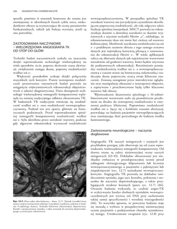 226 DIAGNOSTYKA CHORÓB NACZYŃ sposób, pomimo iż stosunek kontrastu do szumu jest zmniejszony w określonych fazach cyklu serca, niskodawkowe obrazy są wystarczające do oceny parametrów funkcjonalnych, takich jak frakcja wyrzutu, jeżeli są one potrzebne. ZASTOSOWANIA NACZYNIOWE – WIELORZĘDOWA ANGIOGRAFIA TK OD STÓP DO GŁÓW Techniki badań naczyniowych zyskały na znaczeniu dzięki wprowadzeniu technologii wielorzędowej na wiele sposobów, m.in. poprzez skrócenie czasu akwizycji, zwiększenie zasięgu skanu, poprawę rozdzielczości wzdłuż osi z-. Większość protokołów zyskuje dzięki połączeniu wszystkich tych korzyści. Prawie izotropowa rozdzielczość przestrzenna rutynowych badań pozwala na osiągnięcie trójwymiarowych rekonstrukcji objętościowych o jakości diagnostycznej. Duża dostępność technologii wielorzędowej tomografii komputerowej wpłynęła na zmianę tradycyjnego odbioru obrazowania TK. W badaniach TK tradycyjnie różnicuje się rozdzielczość wzdłuż osi z- oraz rozdzielczość wewnątrzpłaszczyznową. Podział ten jest oparty głównie na historycznych podstawach. Przed wprowadzeniem spiralnej tomografii komputerowej rozdzielczość wzdłuż osi z- była określona przez szerokość warstwy, podczas gdy algorytm rekonstrukcji wyznaczał rozdzielczość wewnątrzpłaszczyznową. W przypadku spiralnej TK szerokość warstwy nie jest jedynym czynnikiem określającym poprzeczną rozdzielczość, ale rolę odgrywa także funkcja spiralnej interpolacji. MSCT pozwala na rekonstrukcje skanów o dowolnej szerokości ze skanów wyjściowych z użyciem techniki filtrów „z”, zakładając, że rekonstruowany skan nie może być cieńszy od warstwy kolimacyjnej. Możliwość uzyskania rozdzielczości na osi z- z podobnym szumem obrazu z tego samego zestawu danych jest największą korzyścią płynącą z zastosowania do rekonstrukcji filtrów z-. W wielu aplikacjach zaleca się zbieranie danych jak najcieńszymi warstwami niezależnie od grubości warstwy, która będzie używana do podstawowych rekonstrukcji. Rozróżnienie pomiędzy rozdzielczością wzdłuż osi z- a wewnątrzpłaszczyznową z czasem stanie się historyczną ciekawostką i tradycyjne skany poprzeczne stracą swoje kliniczne znaczenie. Zostaną zastąpione przez interaktywne oglądanie oraz manipulacje obrazami o izotropowej objętości, a zapisywane i przechowywane będą tylko kluczowe warstwy lub obrazy. Wprowadzenie skanowania spiralnego z 16-submilimetrowymi warstwami stało się prawdziwym przełomem na drodze do izotropowej rozdzielczości w rutynowej praktyce klinicznej. Poprawiona rozdzielczość wzdłuż osi z- łączy się z krótkimi czasami akwizycji, pozwalając na badania pacjentów niewspółpracujących oraz zmniejszając ilość potrzebnego do badania środka kontrastowego. Zastosowania neurologiczne – naczynia dogłowowe Ryc. 12.7. (Patrz także atlas kolorowy – ilustr. 12.7). Tętniak (strzałka) lewej tętnicy szyjnej wewnętrznej widziany w projekcji czaszkowo-czołowej w badaniu 4-rzędowego skanera. Technika kolorowej rekonstrukcji objętościowej. Kształt i umiejscowienie tętniaka, a także stosunek do naczynia doprowadzającego są intuicyjnie zobrazowane. Angiografia TK naczyń mózgowych i szyjnych jest przykładem postępu, jaki obserwuje się od czasu wprowadzenia wielorzędowej tomografii komputerowej. Od dawna znane są zalety nieinwazyjnej oceny naczyń mózgowych [43-45]. Dokładne obrazowanie jest niezbędne zwłaszcza w przedoperacyjnej ocenie przed zabiegami chirurgicznego klipsowania lub leczenia wewnątrznaczyniowego u pacjentów z pękniętymi lub niepękniętymi (ryc. 12.7) tętniakami wewnątrzczaszkowymi. Angiografia TK pozwala na dokładne uwidocznienie tętniaka, jego szyi, kształtu, położenia i stosunku do naczynia doprowadzającego, a także przylegających struktur kostnych (patrz ryc. 12.7) [46]. Ostatnie badania wykazały, że czułość angio-TK w wykrywaniu bardzo drobnych tętniaków wewnątrzczaszkowych jest wyższa niż DSA przy zachowaniu takiej samej specyficzności i wysokiej wiarygodności [46]. To wszystko sprawia, że powyższe badanie staje się metodą z wyboru w prospektywnej nieinwazyjnej ocenie pacjentów z podejrzeniem choroby tętniakowatej mózgu. Uwidocznienie zwapnień (ryc. 12.8) przy ANGIOGRAFIA TOMOGRAFII KOMPUTEROWEJ Ryc. 12.8. (Patrz także atlas kolorowy – ilustr. 12.8). Wielorzędowa angiografia tętnic szyjnych z użyciem 4-rzędowego skanera. Niepowodujące zwężeń uwapnione blaszki miażdżycowe w lewej tętnicy szyjnej wewnętrznej blisko podziału. Możliwość charakteryzacji blaszek miażdżycowych dzięki uwidocznieniu zwapnień (strzałka) jest wyznacznikiem przewagi TK nad innymi metodami obrazowymi. Szybkość wielorzędowej TK pozwala na zeskanowanie tętnic szyjnych na całej długości z rozdzielczością 1 mm wzdłuż osi z- bez znaczącego wzmocnienia żylnego, które utrudnia późniejsze rekonstrukcje trójwymiarowe. Technika kolorowej rekonstrukcji objętościowej. ocenie blaszek miażdżycowych stanowi wyraźną przewagę TK nad innymi konkurencyjnymi metodami. Konwencjonalne techniki TK obrazowania unaczynienia mózgowia wymagają większych dawek środków kontrastowych i relatywnie dłuższych czasów koniecznych do uzyskania obrazów o wysokiej jakości. Angio-TK tętnic wewnątrzczaszkowych i szyjnych odniosła więc korzyść z szybkich oraz dokładnych technik skanowania tomografii wielorzędowej. Izotropowe dane uzyskiwane w badaniach wielorzędowej TK zapewniają rozdzielczość przestrzenną konieczną do wizualizacji często drobnych i krętych naczyń. Używając tych danych, można uzyskać wysokiej jakości dwu- i trójwymiarowe rekonstrukcje anatomii naczyniowej. Używa się do tego technik, takich jak rekonstrukcje wielopłaszczyznowe (MPR), projekcje największej intensywności (MIP), obrazy cieniowania powierzchniowego (SSD) czy rekonstrukcje ob