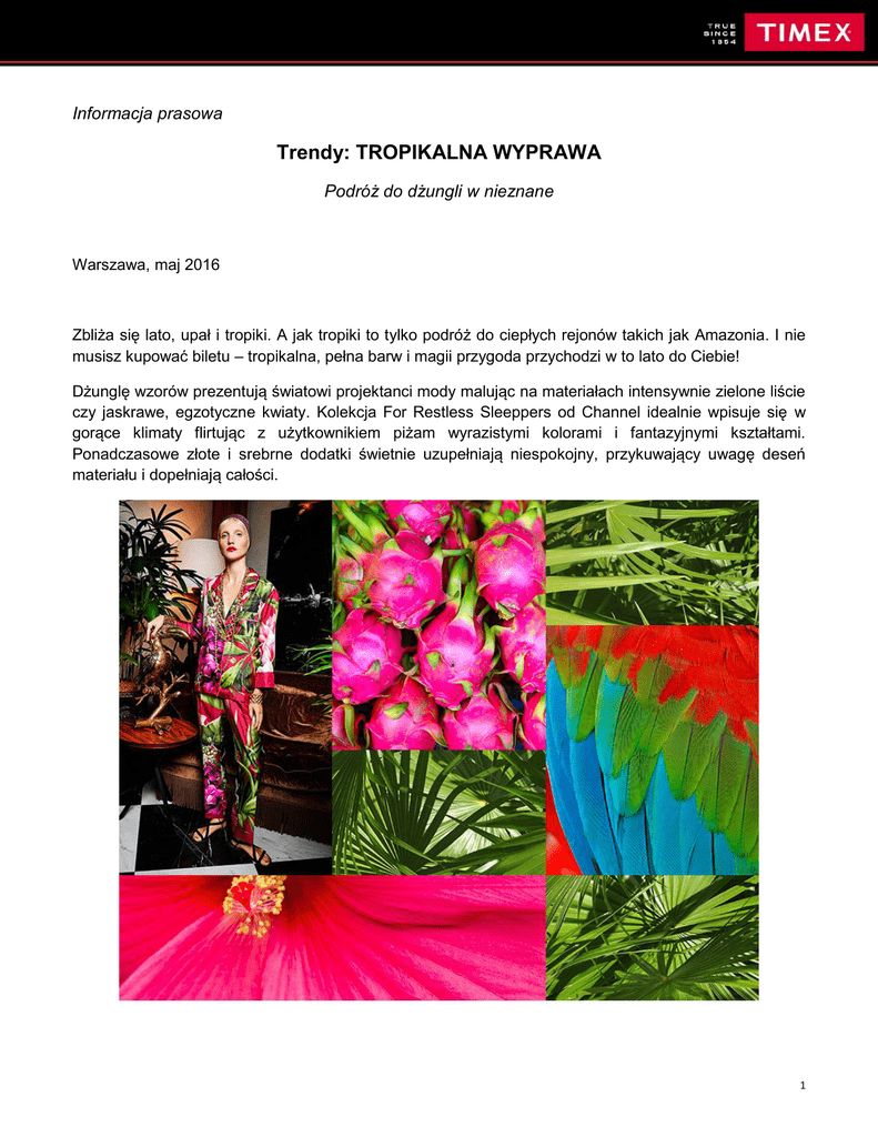 Informacja prasowa Trendy: TROPIKALNA WYPRAWA Podróż do dżungli w nieznane Warszawa, maj 2016 Zbliża się lato, upał i tropiki. A jak tropiki to tylko podróż do ciepłych rejonów takich jak Amazonia. I nie musisz kupować biletu – tropikalna, pełna barw i magii przygoda przychodzi w to lato do Ciebie! Dżunglę wzorów prezentują światowi projektanci mody malując na materiałach intensywnie zielone liście czy jaskrawe, egzotyczne kwiaty. Kolekcja For Restless Sleeppers od Channel idealnie wpisuje się w gorące klimaty flirtując z użytkownikiem piżam wyrazistymi kolorami i fantazyjnymi kształtami. Ponadczasowe złote i srebrne dodatki świetnie uzupełniają niespokojny, przykuwający uwagę deseń materiału i dopełniają całości. 1 Z botanicznych inspiracji czerpał również Gucci malując na garniturach pełne życia ogrody. Ozdobny garnitur dobrze podkreślić gładką, jednokolorową koszulą, która stanie się tłem dla grającej pierwsze skrzypce marynarki i spodni w kolorze blue lagoon. Inspiracji warto szukać wszędzie tam, gdzie jest gorąco i egzotycznie – w Ameryce Południowej, Afryce czy Azji. Kwiaty czy owoce tropikalne dobrze znane w Polsce jak storczyki czy ananasy, będą świetnym punktem wyjścia do rozpoczęcia przygody z żywiołem wzorów i kolorów. Dopełnieniem tropikalnego looku z pazurem będzie delikatny zegarek Miami Mini od producenta czasomierzy Timex. To między innymi Miami rozgrzewa serca miłośników egzotycznej, gorącej zabawy do białego rana. Taki dodatek zatem świetnie sprawdzi się przy odważnej, wyraźnej stylizacji. Damski czasomierz dostępny jest w trzech wersjach kolorystycznych : złotej, srebrnej i złoto-srebrnej. Mała, delikatna, okrągła koperta każdego z nich ozdobiona jest kryształkami Svarovskiego®. Dodatkowo, Miami Mini posiadają bardzo praktyczną, regulowaną bransoletę, której długość można dostosować do nadgarstka właścicielki. Wszystkie zegarki kolekcji wyposażone są również w skrócony indeks cyfr rzymskich ułatwiających odczytanie godziny oraz wodoszczelność w klasie 30 WR. 2 Ceny zegarków (od lewej): TW2P78900 – 329PLN, TW2P80000 – 349PLN, TW2P80100 – 349 PLN. Więcej inspiracji znajdziecie na stronie http://www.timex.pl/. Informacje o Timex Group: Timex Group jest jednym z największych w skali globalnej producentów oraz sprzedawców innowacyjnych zegarków i biżuterii. Założony w 1854 roku Timex jest częścią Timex Group – firmy, do której należy kilka marek, i która zatrudnia ponad 5 tysięcy osób na całym świecie. Polskie przedstawicielstwo Timex, z siedzibą w Warszawie działa od 1994 roku. Zegarki Timex dostępne są w sklepie internetowym www.timex.pl oraz w autoryzowanych sklepach na terenie całego kraju. Więcej informacji: Aleksandra Szafraniec, Omega Communication [email protected] 22 854 16 29, 692 059 401 ### 3