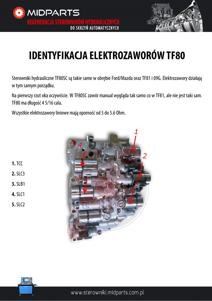 IDENTYFIKACJA ELEKTROZAWORÓW TF80 Sterowniki hydrauliczne TF80SC są takie same w obrębie Ford/Mazda oraz TF81 i 09G. Elektrozawory działają w tym samym porządku. Na pierwszy rzut oka oczywiście. W TF80SC zawór manual wygląda tak samo co w TF81, ale nie jest taki sam. TF80 ma długość 4 5/16 cala. Wszystkie elektrozawory liniowe mają oporność od 5 do 5.6 Ohm. 1. TCC 2. SLC3 3. SLB1 4. SLC1 5. SLC2