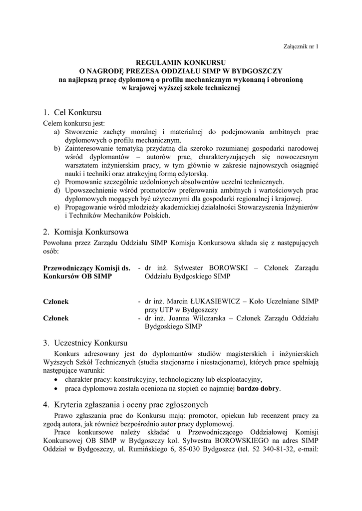 Załącznik nr 1 REGULAMIN KONKURSU O NAGRODĘ PREZESA ODDZIAŁU SIMP W BYDGOSZCZY na najlepszą pracę dyplomową o profilu mechanicznym wykonaną i obronioną w krajowej wyższej szkole technicznej 1. Cel Konkursu Celem konkursu jest: a) Stworzenie zachęty moralnej i materialnej do podejmowania ambitnych prac dyplomowych o profilu mechanicznym. b) Zainteresowanie tematyką przydatną dla szeroko rozumianej gospodarki narodowej wśród dyplomantów – autorów prac, charakteryzujących się nowoczesnym warsztatem inżynierskim pracy, w tym głównie w zakresie najnowszych osiągnięć nauki i techniki oraz atrakcyjną formą edytorską. c) Promowanie szczególnie uzdolnionych absolwentów uczelni technicznych. d) Upowszechnienie wśród promotorów preferowania ambitnych i wartościowych prac dyplomowych mogących być użytecznymi dla gospodarki regionalnej i krajowej. e) Propagowanie wśród młodzieży akademickiej działalności Stowarzyszenia Inżynierów i Techników Mechaników Polskich. 2. Komisja Konkursowa Powołana przez Zarządu Oddziału SIMP Komisja Konkursowa składa się z następujących osób: Przewodniczący Komisji ds. Konkursów OB SIMP - dr inż. Sylwester BOROWSKI – Członek Zarządu Oddziału Bydgoskiego SIMP Członek - dr inż. Marcin ŁUKASIEWICZ – Koło Uczelniane SIMP przy UTP w Bydgoszczy - dr inż. Joanna Wilczarska – Członek Zarządu Oddziału Bydgoskiego SIMP Członek 3. Uczestnicy Konkursu Konkurs adresowany jest do dyplomantów studiów magisterskich i inżynierskich Wyższych Szkół Technicznych (studia stacjonarne i niestacjonarne), których prace spełniają następujące warunki: charakter pracy: konstrukcyjny, technologiczny lub eksploatacyjny, praca dyplomowa została oceniona na stopień co najmniej bardzo dobry. 4. Kryteria zgłaszania i oceny prac zgłoszonych Prawo zgłaszania prac do Konkursu mają: promotor, opiekun lub recenzent pracy za zgodą autora, jak również bezpośrednio autor pracy dyplomowej. Prace konkursowe należy składać u Przewodniczącego Oddziałowej Komisji Konkursowej OB SIMP w Bydgoszczy kol. Sylwestra BOROWSKIEGO na adres SIMP Oddział w Bydgoszczy, ul. Rumińskiego 6, 85-030 Bydgoszcz (tel. 52 340-81-32, e-mail: [email protected]). Termin zgłaszania proponowanych do nagrodzenia prac dyplomowych upływa w dniu 25 listopada 2016 r. Prace powinny być złożone w zamkniętych kopertach zaadresowanych na OB SIMP Bydgoszcz, ul. Rumuńskiego 6. Na kopercie powinien być napis: "KONKURS – rok akademicki 2015/2016". Przy zgłaszaniu prac na konkurs należy dostarczyć: wypełniony wniosek-zgłoszenie, egzemplarz pracy dyplomowej, dwie opinie (recenzje) o pracy: promotora oraz recenzenta, kopię dyplomu lub zaświadczenie o obronieniu pracy dyplomowej. Przy ocenie uwzględniane będą: opinia promotora i recenzenta, aktualność tematu pracy, poziom analizy teoretycznej zagadnienia, jakość opracowania edytorskiego, metodyka projektowania i prac badawczych, organizacja badań eksperymentalnych,. poprawność zastosowania wybranych metod statystyki i analizy danych, możliwość wdrożenia do praktyki przemysłowej rezultatów badań, walory naukowe, poznawcze i praktyczne otrzymanych wyników, poświadczenie wdrożenia (lub zamiaru wdrożenia) wyników pracy dyplomowej. Wszystkie prace (nagrodzone i nienagrodzone) po ogłoszeniu wyników Konkursu zostaną odesłane nadawcom. 5. Ustalenia końcowe Nagrody i wyróżnienia laureatom Konkursu wręczy Prezes Zarządu Oddziału Bydgoskiego Stowarzyszenia Inżynierów i Techników Mechaników Polskich w Bydgoszczy w czasie uroczystości wręczenia dyplomów. Załącznik nr 2 Pieczątka jednostki zgłaszającej WNIOSEK – ZGŁOSZENIE do Konkursu o Nagrodę Prezesa Oddziału SIMP w Bydgoszczy na najlepszą pracę dyplomową o profilu mechanicznym wykonaną i obronioną w krajowej wyższej szkole technicznej w roku akademickim 2015/2016. 1. Zgłaszający ………………………………………………………………………………………………… 2. Instytut / Zakład , ………………………………………………………………………………………………… 3. Tytuł pracy dyplomowej ………………………………………………………………………………………………… ………………………………………………………………………………………………… 4. Imię i nazwisko autora pracy ………………………………………………………………………………………………… Data: Imię i nazwisko oraz podpis Zgłaszającego Załączniki: 1. 2. 3. 4. 5. Egzemplarz pracy dyplomowej Krótkie streszczenie pracy Opinia promotora Opinia recenzenta Kopia dyplomu lub zaświadczenie o obronie pracy dyplomowej (jeżeli dyplom nie został jeszcze wydany) 6. Ewentualna opinia jednostki wdrażającej