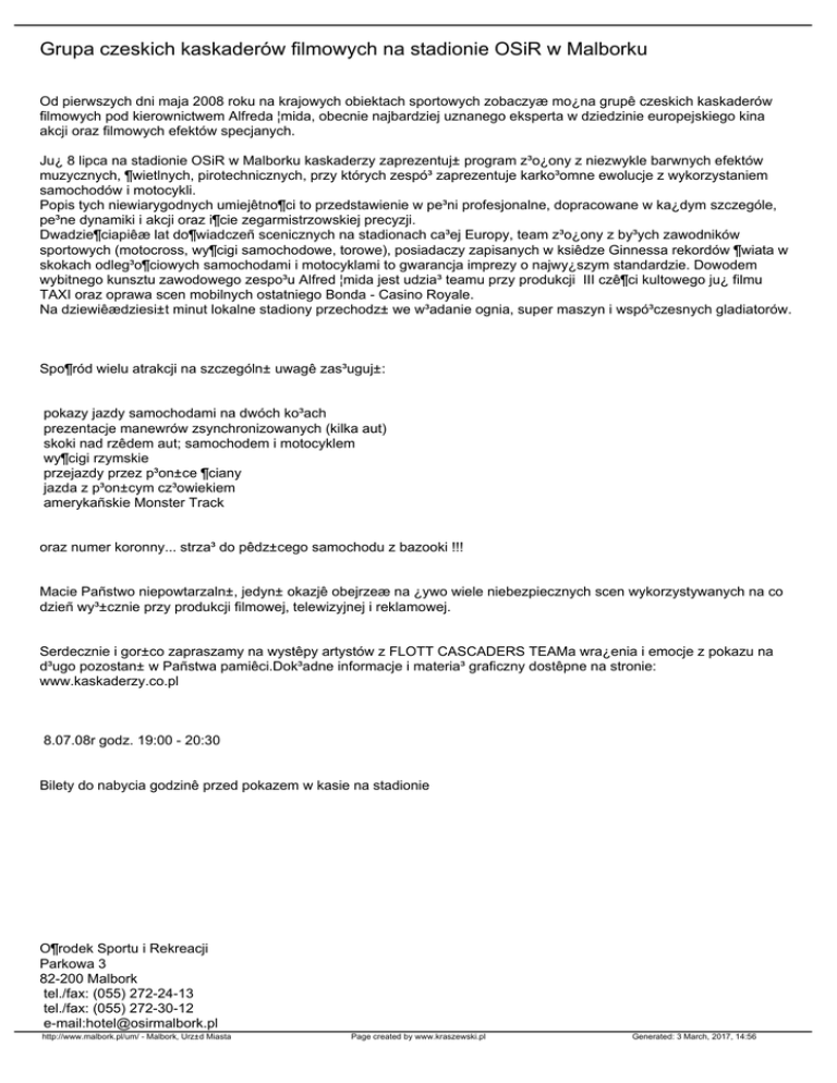 Grupa czeskich kaskaderów filmowych na stadionie OSiR w Malborku Od pierwszych dni maja 2008 roku na krajowych obiektach sportowych zobaczyæ mo¿na grupê czeskich kaskaderów filmowych pod kierownictwem Alfreda ¦mida, obecnie najbardziej uznanego eksperta w dziedzinie europejskiego kina akcji oraz filmowych efektów specjanych. Ju¿ 8 lipca na stadionie OSiR w Malborku kaskaderzy zaprezentuj± program z³o¿ony z niezwykle barwnych efektów muzycznych, ¶wietlnych, pirotechnicznych, przy których zespó³ zaprezentuje karko³omne ewolucje z wykorzystaniem samochodów i motocykli. Popis tych niewiarygodnych umiejêtno¶ci to przedstawienie w pe³ni profesjonalne, dopracowane w ka¿dym szczególe, pe³ne dynamiki i akcji oraz i¶cie zegarmistrzowskiej precyzji. Dwadzie¶ciapiêæ lat do¶wiadczeñ scenicznych na stadionach ca³ej Europy, team z³o¿ony z by³ych zawodników sportowych (motocross, wy¶cigi samochodowe, torowe), posiadaczy zapisanych w ksiêdze Ginnessa rekordów ¶wiata w skokach odleg³o¶ciowych samochodami i motocyklami to gwarancja imprezy o najwy¿szym standardzie. Dowodem wybitnego kunsztu zawodowego zespo³u Alfred ¦mida jest udzia³ teamu przy produkcji III czê¶ci kultowego ju¿ filmu TAXI oraz oprawa scen mobilnych ostatniego Bonda - Casino Royale. Na dziewiêædziesi±t minut lokalne stadiony przechodz± we w³adanie ognia, super maszyn i wspó³czesnych gladiatorów. Spo¶ród wielu atrakcji na szczególn± uwagê zas³uguj±: pokazy jazdy samochodami na dwóch ko³ach prezentacje manewrów zsynchronizowanych (kilka aut) skoki nad rzêdem aut; samochodem i motocyklem wy¶cigi rzymskie przejazdy przez p³on±ce ¶ciany jazda z p³on±cym cz³owiekiem amerykañskie Monster Track oraz numer koronny... strza³ do pêdz±cego samochodu z bazooki !!! Macie Pañstwo niepowtarzaln±, jedyn± okazjê obejrzeæ na ¿ywo wiele niebezpiecznych scen wykorzystywanych na co dzieñ wy³±cznie przy produkcji filmowej, telewizyjnej i reklamowej. Serdecznie i gor±co zapraszamy na wystêpy artystów z FLOTT CASCADERS TEAMa wra¿enia i emocje z pokazu na d³ugo pozostan± w Pañstwa pamiêci.Dok³adne informacje i materia³ graficzny dostêpne na stronie: www.kaskaderzy.co.pl 8.07.08r godz. 19:00 - 20:30 Bilety do nabycia godzinê przed pokazem w kasie na stadionie O¶rodek Sportu i Rekreacji Parkowa 3 82-200 Malbork tel./fax: (055) 272-24-13 tel./fax: (055) 272-30-12 e-mail:[email protected] http://www.malbork.pl/um/ - Malbork, Urz±d Miasta Page created by www.kraszewski.pl Generated: 3 March, 2017, 14:56 strona: www.osirmalbork.pl http://www.malbork.pl/um/ - Malbork, Urz±d Miasta Page created by www.kraszewski.pl Generated: 3 March, 2017, 14:56