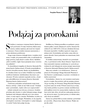 P R Z E S Ł A N I E O D R A D Y P R E Z Y D E N TA K O Ś C I O Ł A , S T Y C Z E Ń 2 0 1 5 R . Prezydent Thomas S. Monson Podążaj za prorokami S łużyłem w marynarce wojennej Stanów Zjednoczonych pod koniec II wojny światowej. Byłem marynarzem, miałem najniższy, jaki może być stopień w marynarce. Potem zostałem starszym marynarzem, a potem młodszym podoficerem. Druga wojna światowa dobiegła końca i zostałem zwolniony z wojska, ale postanowiłem sobie, że jeśli kiedyś do niego powrócę, będę służył w randze oficera. Myślałem: „Jeśli to możliwe, nigdy więcej sprzątania mesy i szorowania pokładów”. Po demobilizacji wstąpiłem do Rezerwy Marynarki Wojennej Stanów Zjednoczonych. W każdy poniedziałkowy wieczór ćwiczyłem musztrę. Bardzo się przykładałem, bo chciałem dostać się na studia. Poddałem się wszelkim możliwym badaniom: intelektualnym, fizycznym i psychicznym. W końcu nadeszła wspaniała nowina: „Został pan zakwalifikowany do korpusu Rezerwy Marynarki Wojennej Stanów Zjednoczonych”. Uradowany pokazałem zawiadomienie mojej żonie, Frances, mówiąc: „Udało mi się! Udało mi się!”. Uściskała mnie i powiedziała: „Ciężko sobie na to zapracowałeś”. Jednak wydarzyło się wówczas coś jeszcze. Zostałem powołany jako doradca w radzie biskupiej mojego okręgu. Spotkania rady biskupiej odbywały się w tym samym czasie, co moje zajęcia z musztry. Wiedziałam, że jedno zupełnie nie zgra się z drugim. Wiedziałem, że nie pogodzę obowiązków rezerwisty i obowiązków w radzie biskupiej. Co zrobić? Trzeba było podjąć decyzję. Modliłem się. Później poszedłem na spotkanie z prezydentem palika z moich chłopięcych czasów, Starszym Haroldem B. Lee (1899-1973), wówczas członkiem Kworum Dwunastu Apostołów. Usiadłem naprzeciw niego przy jednym stole. Powiedziałem, jak bardzo cenię sobie ten patent oficerski. Nawet pokazałem mu mianowanie, które otrzymałem. Po krótkim zastanowieniu, Harold B. Lee powiedział: „Oto, co powinieneś zrobić, Bracie Monson. Napisz list do biura marynarki wojennej i poinformuj, że z powodu powołania do rady biskupiej nie możesz przyjąć mianowania w Rezerwie Marynarki Wojennej Stanów Zjednoczonych”. Moje serce zamarło. A on dodał jeszcze: „Potem napiszesz do Dwunastego Okręgu Marynarki Wojennej w San Francisco i poinformujesz, że prosisz o zwolnienie ze służby rezerwowej”. Powiedziałem: „Starszy Lee, nie rozumiesz zasad panujących w wojsku. Rzeczywiście, jeśli nie przyjmę awansu, oni go wycofają, ale Dwunasty Okręg Marynarki Wojennej na pewno mnie nie zwolni. W Korei zanosi się na wojnę, więc każdy podoficer na pewno zostanie zmobilizowany. Jeśli miałbym wrócić do czynnej służby wojskowej, chciałbym wrócić jako oficer, ale jeśli nie zaakceptuję mianowania, tak się nie stanie. Czy jesteś pewien, że właśnie takiej rady chcesz mi udzielić?”. Starszy Lee położył dłoń na moim ramieniu i powiedział po ojcowsku: „Więcej wiary, Bracie Monson. Wojsko nie jest dla ciebie”. 1 przemówienia Prezydenta Monsona z ostatniej konfe- Wróciłem do domu. Włożyłem mokre od łez mianowanie z powrotem do koperty wraz z towarzyszącym mu listem oraz moją odmową. Następnie napisałem do Dwunastego Okręgu Marynarki Wojennej z prośbą o zwolnienie mnie ze służby w rezerwie marynarki wojennej. Ta prośba znalazła się w ostatniej grupie podań rozpatrzonych przed wybuchem wojny koreańskiej. Moja baza została postawiona w stan gotowości bojowej. Sześć miesięcy po powołaniu na doradcę w radzie biskupiej, zostałem powołany na biskupa. Nie objąłbym mojej dzisiejszej funkcji w Kościele, gdybym nie posłuchał rady proroka, gdybym nie modlił się, przed podjęciem tamtej decyzji, gdybym nie zaakceptował pewnej ważnej prawdy: mądrość Boga często jest głupstwem dla ludzi 1. Najwspanialszą nauką, jaką możemy wynieść z doczesnego życia, jest to, że kiedy Bóg przemawia, a Jego dzieci są Mu posłuszne, zawsze dokonują właściwych wyborów Mówi się, że brama historii obraca się na małych zawiasach. Podobnie jest z ludzkim życiem. Decyzje determinują przeznaczenie. Ale podczas ich podejmowania nie jesteśmy pozostawieni sami sobie. Jeśli chcecie ujrzeć światłość nieba, jeśli chcecie odczuć natchnienie Wszechmogącego Boga, jeśli chcecie poczuć w głębi serca, że wasz Ojciec Niebieski was prowadzi, idźcie za głosem proroków Boga. Jeśli będziecie podążać za prorokami, będziecie bezpieczni. rencji generalnej (nie zapominając o tym, co powiedział na rozpoczęcie i na zakończenie). Poszukajcie w nich konkretnych wskazówek lub wezwań do działania. Możecie porozmawiać z odwiedzanymi osobami, o tym, czego dowiedzieliście się z tych przemówień i zastanowić się nad zastosowaniem rad Prezydenta Monsona. MŁODZIEŻ Rada na trudne decyzje P rezydent Henry B. Eyring, Pierwszy Doradca w Radzie Prezydenta Kościoła, opowiedział o sytuacji, w której posłuchał rady proroka. W czasie jednej z konferencji generalnych Prezydent Ezra Taft Benson (1899- 1994) wezwał członków, by spłacili długi — zwłaszcza długi hipoteczne. Prezydent Eyring powiedział: „Po spotkaniu podszedłem do żony i zapytałem: ‘Sądzisz, że jest sposób, żebyśmy mogli to zrobić?’. Z początku nie mogliśmy nic wymyślić”. Wieczorem jednak przyszła mu na myśl pewna nieruchomość, którą od lat bezskutecznie starali się sprzedać. „Ufaliśmy Bogu i […] [przesłaniu] Jego sługi, [więc] ustaliliśmy, że […] zadzwonię do człowieka […], który zajmował się sprzedażą naszej nieruchomości. […] Usłyszałem odpowiedź, która po dziś dzień wzmacnia moje zaufanie do Boga i Jego sług”. Tego samego dnia pewien człowiek wyraził chęć zakupu PRZYPIS 1. Zob. I List do Koryntian 2:14. nieruchomości Eyringów za kwotę nieco przewyższającą ich dług hipoteczn