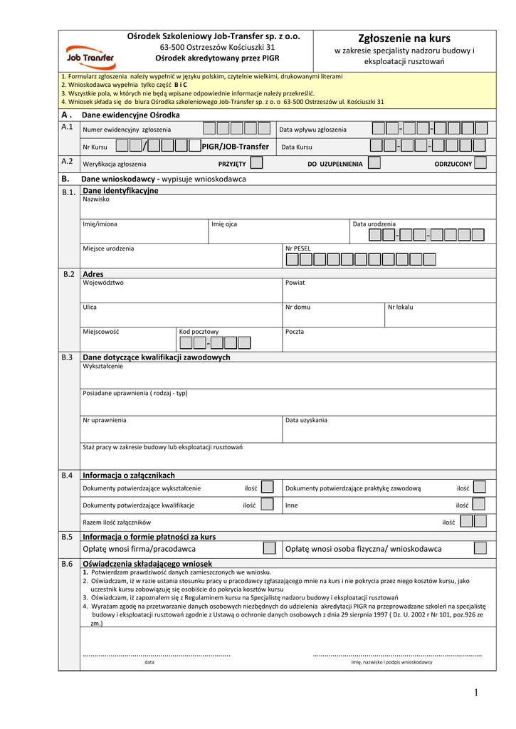 Ośrodek Szkoleniowy Job-Transfer sp. z o.o. Zgłoszenie na kurs 63-500 Ostrzeszów Kościuszki 31 Ośrodek akredytowany przez PIGR w zakresie specjalisty nadzoru budowy i eksploatacji rusztowao 1. Formularz zgłoszenia należy wypełnid w języku polskim, czytelnie wielkimi, drukowanymi literami 2. Wnioskodawca wypełnia tylko częśd B i C 3. Wszystkie pola, w których nie będą wpisane odpowiednie informacje należy przekreślid. 4. Wniosek składa się do biura Ośrodka szkoleniowego Job-Transfer sp. z o. o 63-500 Ostrzeszów ul. Kościuszki 31 A. Dane ewidencyjne Ośrodka A.1 Numer ewidencyjny zgłoszenia Nr Kursu A.2 Data wpływu zgłoszenia / PIGR/JOB-Transfer Weryfikacja zgłoszenia Data Kursu PRZYJĘTY - - - - DO UZUPEŁNIENIA ODRZUCONY B. Dane wnioskodawcy - wypisuje wnioskodawca B.1. Dane identyfikacyjne Nazwisko Imię/imiona Imię ojca Data urodzenia Miejsce urodzenia - Nr PESEL B.2 Adres Województwo Powiat Ulica Nr domu Miejscowośd Kod pocztowy Nr lokalu Poczta B.3 Dane dotyczące kwalifikacji zawodowych Wykształcenie Posiadane uprawnienia ( rodzaj - typ) Nr uprawnienia Data uzyskania Staż pracy w zakresie budowy lub eksploatacji rusztowao B.4 Informacja o załącznikach Dokumenty potwierdzające wykształcenie ilośd Dokumenty potwierdzające praktykę zawodową ilośd Dokumenty potwierdzające kwalifikacje ilośd Inne ilośd Razem ilośd załączników B.5 B.6 Informacja o formie płatności za kurs Opłatę wnosi firma/pracodawca ilośd Opłatę wnosi osoba fizyczna/ wnioskodawca Oświadczenia składającego wniosek 1. Potwierdzam prawdziwośd danych zamieszczonych we wniosku. 2. Oświadczam, iż w razie ustania stosunku pracy u pracodawcy zgłaszającego mnie na kurs i nie pokrycia przez niego kosztów kursu, jako uczestnik kursu zobowiązuję się osobiście do pokrycia kosztów kursu 3. Oświadczam, iż zapoznałem się z Regulaminem kursu na Specjalistę nadzoru budowy i eksploatacji rusztowao 4. Wyrażam zgodę na przetwarzanie danych osobowych niezbędnych do udzielenia akredytacji PIGR na przeprowadzane szkoleo na specjalistę budowy i eksploatacji rusztowao zgodnie z Ustawą o ochronie danych osobowych z dnia 29 sierpnia 1997 ( Dz. U. 2002 r Nr 101, poz.926 ze zm.) ……………………………………………………………….. data …………………………………………………………………………. Imię, nazwisko i podpis wnioskodawcy 1 B.7 Deklarowana forma płatności – 3 dni od daty wystawienia faktury gotówka przelew C. Dane o pracodawcy delegującego wnioskodawcę na kurs – wypełnia pracodawca Dane identyfikacyjne pracodawcy C.1. Nazwa pełna NIP - - - Regon KRS RHB Nr zaświadczenia o działalności gospodarczej Przez kogo wydane Tak Członkostwo PIGR Nie C.2 Adres Województwo Powiat Ulica Nr domu Miejscowośd Kod pocztowy Nr lokalu Poczta C.3. Kontakt Telefon stacjonarny: C4 Telefon komórkowy: Fax: Adres e- mail Oświadczenie pracodawcy o oddelegowaniu na kurs Potwierdzam oddelegowanie ww. pracownika na kurs na Specjalistę nadzoru budowy i eksploatacji rusztowao i tym samym zobowiązuję się do pokrycia kosztów kursu ……………………………………………………………….. Data ……………………………………………………………… Imię, nazwisko i podpis osoby uprawnionej w firmie do podpisania oświadczenia 2