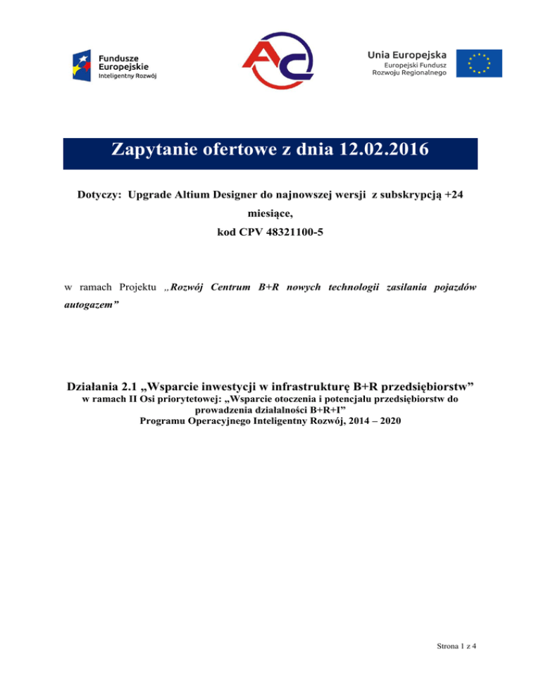 Zapytanie ofertowe z dnia 12.02.2016 Dotyczy: Upgrade Altium Designer do najnowszej wersji z subskrypcją +24 miesiące, kod CPV 48321100-5 w ramach Projektu „Rozwój Centrum B+R nowych technologii zasilania pojazdów autogazem” Działania 2.1 „Wsparcie inwestycji w infrastrukturę B+R przedsiębiorstw” w ramach II Osi priorytetowej: „Wsparcie otoczenia i potencjału przedsiębiorstw do prowadzenia działalności B+R+I” Programu Operacyjnego Inteligentny Rozwój, 2014 – 2020 Strona 1 z 4 1. OPIS PRZEDMIOTU ZAMÓWIENIA Przedmiotem zapytania ofertowego jest aktualizacja oprogramowania do projektowania układów elektronicznych w postaci jednej licencji sieciowej sześciostanowiskowej wraz z 24 miesięczna subskrypcją o parametrach co najmniej takich, jak podane poniżej: 1. Oprogramowanie w postaci zintegrowanej aplikacji pozwalającej na aktualizacje oprogramowania Altium Designer do najnowszej wersji, zawierającej edytor schematu, symulator obwodów, edytor PCB, edytor CAM oraz inne moduły pozwalające na tworzenie projektów PCB, projektów FPGA, projektów wbudowanych i projektów skryptowych oraz zarządzanie dokumentacją projektową. 2. Licencjonowanie – licencja sieciowa pozwalająca na jednoczesne uruchomienie oprogramowania na 6 komputerach. 3. Darmowa aktualizacja oprogramowania przez 24 miesiące od daty zakupu znacząco podnosząca wydajność pracy. 4. Import plików projektowych i bibliotek Protel 99SE (*.ddb), Allegro PCB (*.brd i *.alg), CADSTAR (*.csa, *.cpa, *.lib), CircuitMaker 2000 (*.ckt, *.lib), DxDesigner, Orcad (*.dbc, *.dsn, *.max, *.olb, *.llb), PADS (*.asc, *.d, *.txt), P-CAD (*.sch, *.pcb, *.lia, *.lib). 5. Zapis plików w formacie Protel 99 (*.sch, *.pcb) i Altium Designer (*.schdoc, *.pcbdoc). 6. Obsługa bibliotek zintegrowanych oraz bazodanowych. 7. Obsługa bezpośredniego połączenia do bazy danych dostawców komponentów. 8. Wbudowana kontrola wersji SVN oraz zarządzanie dokumentacją projektową. 9. Interfejs do firmowej bazy danych (np. ODBC) oraz serwerów Altium Vault. 10. Edytor PCB sterowany regułami. 11. Obsługa fontów True Type na PCB. 12. Możliwość wstawiania kodów paskowych na PCB 13. Wsparcie dla elementów dotykowych Atmel QTouch, biblioteki do schematu i PCB. 14. Możliwość pracy z PCB w trybie 3D z detekcją kolizji pomiędzy elementami. 15. Import oraz eksport modeli 3D elementów, eksport modelu 3D PCB w formacie STEP. 16. Wbudowany moduł CAM oferujący możliwości weryfikacji i edycji plików CAM. 17. Automatyczne wykrywanie błędów na płytce w edytorze CAM. 18. Generacja danych wyjściowych CAM w formacie Gerber, NC Drill, ODB++. 19. Wbudowany system analizy obwodów kompatybilny ze SPICE. 20. Wbudowany analizator integralności sygnałów. 21. Obsługa wariantów montażowych z wizualizacją wariantów na schemacie, PCB i wydrukach. 22. Obsługa interaktywnego prowadzenia ścieżek na PCB (tryby przepychania, otaczania, automatycznego kończenia ścieżki, zarówno dla pojedynczych połączeń i magistral). 23. Obsługa par różnicowych, prowadzenie ścieżek z kontrolą impedancji falowej, wyrównywanie długości połączeń. 24. Wbudowany autorouter topologiczny z obsługa reguł projektowych z edytora PCB. 25. Obsługa płyt uruchomieniowych NanoBoard i innych układów poprzez JTAG. 26. Wbudowane narzędzia do projektowania systemów na FPGA. Strona 2 z 4 27. Obsługa komponentów typu „no BOM”, „mechanical”. 28. Możliwość tworzenia raportów porównawczych obudów elementów na PCB z bibliotekami z których pochodzą 29. Możliwość zachowywania fragmentów płytki PCB i odpowiadających im fragmentów schematów do ponownego wykorzystania w przyszłości. 30. Możliwość tworzenia projektów wielokanałowych. 31. Możliwość importowania globalnych ustawień programu. 32. Zapewnienie szkoleń z zakresu obsługi oprogramowania dla 3 osób. 2. WARUNKI UDZIAŁU W POSTĘPOWANIU 1. O udzielenie zamówienia ubiegać się mogą przedsiębiorcy, którzy złożą ważną ofertę. 2. Zamawiający dokona wyboru oferty spośród ofert ważnych. 3. Oferta ważna musi spełniać następujące warunki: a. Oferent składający zamówienie nie może być wykluczony z postępowania na podstawie art. 24 ustawy Prawo Zamówień Publicznych. b. Oferta winna być złożona w terminie wyznaczonym do składania ofert. c. Minimalny okres związania ofertą powinien wynosić co najmniej 1 miesiąc od dnia jej złożenia. 4. Oferent upoważnia Zamawiającego do sprawdzenia prawdziwości wszystkich danych zawartych w ofercie. 5. Oferentów wobec których stwierdzi się, że dostarczone przez nich informacje istotne dla prowadzonego postępowania są nieprawdziwe - wyklucza się z postępowania konkursowego. 3. KRYTERIA OCENY OFERT 1. Specyfikacja wymagań AC S.A. dla parametrów technicznych – 100% 2. Przy spełnionych warunkach specyfikacji technicznej kolejnym kryterium wyboru jest: cena – 90% (0 – 90 punktów), obliczane wg następującego wzoru: KC – kryterium ceny Cmin. – najniższa cena wśród rozpatrywanych ofert Coferty – cena w aktualnie analizowanej ofercie KC = Cmin. / Coferty x 90 pkt atrakcyjność oferty (m.in. bezpłatne pakiety wdrożeniowe, szkolenia) – 10% (0 – 10 punktów). 4. TERMIN SKŁADANIA OFERT 1. Termin składania ofert upływa 22.02.2016 r. 2. Oferty należy składać pocztą na adres AC Spółka Akcyjna, ul. 42 Pułku Piechoty 50, 15181 Białystok lub emailem na adres [email protected] 3. Wiążąca jest data wpływu oferty. Strona 3 z 4 5. DODATKOWE INFORMACJE 1. Zamówienie nie może być udzielone podmiotom powiązanym z Zamawiającym osobowo lub kapitałowo. Przez powiązania kapitałowe lub osobowe rozumie się wzajemne powiązania między beneficjentem lub osobami upoważnionymi do zaciągania zobowiązań w imieniu beneficjenta lub osobami wykonującymi w imieniu beneficjenta czynności związane z przygotowaniem i przeprowadzeniem procedury wyboru wykonaw