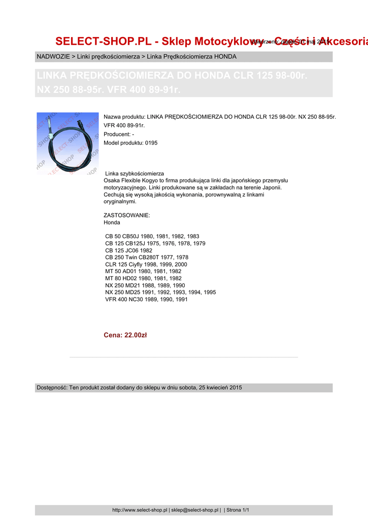Utworzono: piątek, 01 maj SELECT-SHOP.PL - Sklep Motocyklowy - Części i 2015 Akcesoria NADWOZIE > Linki prędkościomierza > Linka Prędkościomierza HONDA LINKA PRĘDKOŚCIOMIERZA DO HONDA CLR 125 98-00r. NX 250 88-95r. VFR 400 89-91r. Nazwa produktu: LINKA PRĘDKOŚCIOMIERZA DO HONDA CLR 125 98-00r. NX 250 88-95r. VFR 400 89-91r. Producent: Model produktu: 0195 Linka szybkościomierza Osaka Flexible Kogyo to firma produkująca linki dla japońskiego przemysłu motoryzacyjnego. Linki produkowane są w zakładach na terenie Japonii. Cechują się wysoką jakością wykonania, porownywalną z linkami oryginalnymi. ZASTOSOWANIE: Honda CB 50 CB50J 1980, 1981, 1982, 1983 CB 125 CB125J 1975, 1976, 1978, 1979 CB 125 JC06 1982 CB 250 Twin CB280T 1977, 1978 CLR 125 Ciyfly 1998, 1999, 2000 MT 50 AD01 1980, 1981, 1982 MT 80 HD02 1980, 1981, 1982 NX 250 MD21 1988, 1989, 1990 NX 250 MD25 1991, 1992, 1993, 1994, 1995 VFR 400 NC30 1989, 1990, 1991 Cena: 22.00zł Dostępność: Ten produkt został dodany do sklepu w dniu sobota, 25 kwiecień 2015 http://www.select-shop.pl | [email protected] | | Strona 1/1