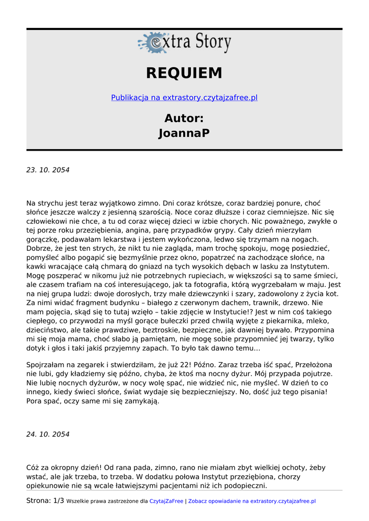 REQUIEM Publikacja na extrastory.czytajzafree.pl Autor: JoannaP 23. 10. 2054 Na strychu jest teraz wyjątkowo zimno. Dni coraz krótsze, coraz bardziej ponure, choć słońce jeszcze walczy z jesienną szarością. Noce coraz dłuższe i coraz ciemniejsze. Nic się człowiekowi nie chce, a tu od coraz więcej dzieci w izbie chorych. Nic poważnego, zwykłe o tej porze roku przeziębienia, angina, parę przypadków grypy. Cały dzień mierzyłam gorączkę, podawałam lekarstwa i jestem wykończona, ledwo się trzymam na nogach. Dobrze, że jest ten strych, że nikt tu nie zagląda, mam trochę spokoju, mogę posiedzieć, pomyśleć albo pogapić się bezmyślnie przez okno, popatrzeć na zachodzące słońce, na kawki wracające całą chmarą do gniazd na tych wysokich dębach w lasku za Instytutem. Mogę poszperać w nikomu już nie potrzebnych rupieciach, w większości są to same śmieci, ale czasem trafiam na coś interesującego, jak ta fotografia, którą wygrzebałam w maju. Jest na niej grupa ludzi: dwoje dorosłych, trzy małe dziewczynki i szary, zadowolony z życia kot. Za nimi widać fragment budynku – białego z czerwonym dachem, trawnik, drzewo. Nie mam pojęcia, skąd się to tutaj wzięło – takie zdjęcie w Instytucie!? Jest w nim coś takiego ciepłego, co przywodzi na myśl gorące bułeczki przed chwilą wyjęte z piekarnika, mleko, dzieciństwo, ale takie prawdziwe, beztroskie, bezpieczne, jak dawniej bywało. Przypomina mi się moja mama, choć słabo ją pamiętam, nie mogę sobie przypomnieć jej twarzy, tylko dotyk i głos i taki jakiś przyjemny zapach. To było tak dawno temu… Spojrzałam na zegarek i stwierdziłam, że już 22! Późno. Zaraz trzeba iść spać, Przełożona nie lubi, gdy kładziemy się późno, chyba, że ktoś ma nocny dyżur. Mój przypada pojutrze. Nie lubię nocnych dyżurów, w nocy wolę spać, nie widzieć nic, nie myśleć. W dzień to co innego, kiedy świeci słońce, świat wydaje się bezpieczniejszy. No, dość już tego pisania! Pora spać, oczy same mi się zamykają. 24. 10. 2054 Cóż za okropny dzień! Od rana pada, zimno, rano nie miałam zbyt wielkiej ochoty, żeby wstać, ale jak trzeba, to trzeba. W dodatku połowa Instytut przeziębiona, chorzy opiekunowie nie są wcale łatwiejszymi pacjentami niż ich podopieczni. Strona: 1/3 Wszelkie prawa zastrzeżone dla CzytajZaFree | Zobacz opowiadanie na extrastory.czytajzafree.pl Chyba położę się wcześniej spać, muszę wypocząć przed nocnym dyżurem. 25. 10. 2054 Nocny dyżur już za mną. Nie miałam wiele pracy, właściwie całą noc przesiedziałam przy jednej dziewczynce, małej Agnieszce, którą chłopcy zrzucili ze schodów. Na szczęście poza skręconą kostką nic jej nie jest. Biedne dziecko. Jest taka inna od reszty dzieci, taka cicha i bezbronna. Ma dziesięć lat a wygląda na osiem, zawsze sprawia takie wrażenie, jakby się czegoś bała. Inne dzieciaki, większe od niej i silniejsze ciągle jej dokuczają, popychają, wyśmiewają, a ona nigdy się nie skarży, tylko czasem popłakuje w samotności. Przełożona uważa, że należy przedstawić jej sprawę Komisji ds. Właściwego Rozwoju. Jeżeli Komisja uzna Agnieszkę za nieprzystosowaną społecznie, a na to się zanosi, małej grozi operacja. Nikt nie może odbiegać od normy. To takie interesujące dziecko! Dzisiaj długo nie mogła zasnąć, rozmawiała więc ze mną. Jakie dziwne pytania mi zadawała: ,, Siostro Anno, dlaczego noc jest taka ciemna? Dlaczego wiatr jest dzisiaj taki smutny? Chciałabym być wiatrem i odlecieć stąd daleko, daleko. Dlaczego ja nie jestem jak inne dzieci i nie potrafię się śmiać?” Co będzie, kiedy ją zoperują? 26.10.2054 Boli mnie dzisiaj głowa. Czuję się stara i zmęczona. A przecież mam dopiero trzydzieści pięć lat! Za wcześnie, by mieć poczucie, że życie się skończyło, że nie mogę się już niczego spodziewać, tylko czekać. Komisja zbierze się jutro. Decyzje podejmie prawdopodobnie po dwóch, trzech dniach obrad. Mało prawdopodobne, żeby Agnieszka uniknęła losu innych nieprzystosowanych dzieci. A jest ich wiele. Trafiają tu do nas maluchy w wieku pięciu lat, by mogły zostać odpowiednio ukształtowane przez Instytut. Wszelkie problemy emocjonalne zwalczane są podczas cotygodniowej obowiązkowej sesji terapeutycznej. Czasem jednak terapia nie skutkuje i wtedy Komisja podejmuje decyzję o operacji. 27.10.2054 Jest cichy, pogodny wieczór. Cały dzień był wyjątkowo ciepły. Po pracy postanowiłam pójść na spacer. Kiedy przechodziłam przez dziedziniec, zobaczyłam, że wśród zeschłych liści coś się porusza. Przyjrzałam się i stwierdziłam, że to motyl. Mały kolorowy motylek z podziwu Strona: 2/3 Wszelkie prawa zastrzeżone dla CzytajZaFree | Zobacz opowiadanie na extrastory.czytajzafree.pl godną wytrwałością szedł przed siebie, ku krańcowi dziedzińca. Skrzydełka miał złożone, nie mógł latać. Przypominał rannego żołnierza usiłującego wydostać się z pola bitwy. Był taki mały i bezbronny, a jednocześnie tak niesamowicie silny, bo nie poddał się walczył. Skąd tak wielka wola życia w tak delikatnej istocie? I skąd się tu wziął ten motyl o tej porze roku, w czasie ze wszech miar dla niego nieodpowiednim? Zrobiło mi się go żal. I samej siebie. I nas wszystkich. Nagle na dziedziniec wybiegł mały chłopiec i rozdeptał motyla. Usłyszałam krzyki. Pobiegłam w tamtą stronę, pomyślałam, że coś musiało się stać. Zobaczyłam wianuszek dzieci, a w środku wystraszoną Agnieszkę. Przypominała tego motyla – dzielna, ale bez szans wobec siły potężniejszej od niej. Dziecięce twarzyczki wykrzywione nienawiścią otaczały ją ze wszystkich stron. Przecisnęłam się jakoś do dziewczynki, wzięłam ją za rękę i zabrałam stamtąd. Zaskoczone dzieci nie zareagowały. Poszłyśmy do parku. Agnieszka szła obok mnie zamyślona, ze spuszczoną głową. Nagle podniosła