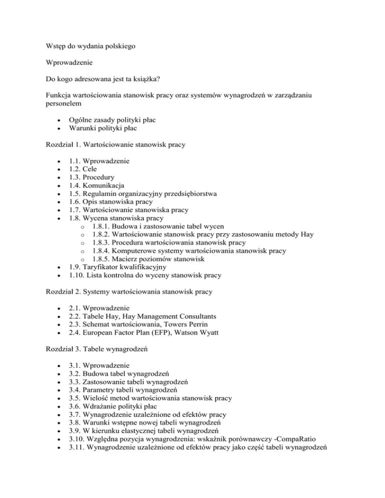 Wstęp do wydania polskiego Wprowadzenie Do kogo adresowana jest ta książka? Funkcja wartościowania stanowisk pracy oraz systemów wynagrodzeń w zarządzaniu personelem Ogólne zasady polityki płac Warunki polityki płac Rozdział 1. Wartościowanie stanowisk pracy 1.1. Wprowadzenie 1.2. Cele 1.3. Procedury 1.4. Komunikacja 1.5. Regulamin organizacyjny przedsiębiorstwa 1.6. Opis stanowiska pracy 1.7. Wartościowanie stanowiska pracy 1.8. Wycena stanowiska pracy o 1.8.1. Budowa i zastosowanie tabel wycen o 1.8.2. Wartościowanie stanowisk pracy przy zastosowaniu metody Hay o 1.8.3. Procedura wartościowania stanowisk pracy o 1.8.4. Komputerowe systemy wartościowania stanowisk pracy o 1.8.5. Macierz poziomów stanowisk 1.9. Taryfikator kwalifikacyjny 1.10. Lista kontrolna do wyceny stanowisk pracy Rozdział 2. Systemy wartościowania stanowisk pracy 2.1. Wprowadzenie 2.2. Tabele Hay, Hay Management Consultants 2.3. Schemat wartościowania, Towers Perrin 2.4. European Factor Plan (EFP), Watson Wyatt Rozdział 3. Tabele wynagrodzeń 3.1. Wprowadzenie 3.2. Budowa tabel wynagrodzeń 3.3. Zastosowanie tabeli wynagrodzeń 3.4. Parametry tabeli wynagrodzeń 3.5. Wielość metod wartościowania stanowisk pracy 3.6. Wdrażanie polityki płac 3.7. Wynagrodzenie uzależnione od efektów pracy 3.8. Warunki wstępne nowej tabeli wynagrodzeń 3.9. W kierunku elastycznej tabeli wynagrodzeń 3.10. Względna pozycja wynagrodzenia: wskaźnik porównawczy -CompaRatio 3.11. Wynagrodzenie uzależnione od efektów pracy jako część tabeli wynagrodzeń 3.12. Model wynagradzania pracowników dostosowany do awansu zawodowego 3.13. Lista kontrolna wynagrodzeń Rozdział 4. Badania wynagrodzeń 4.1. Wprowadzenie 4.2. Warunki i wymagania 4.3. Sposoby badania wynagrodzeń o 4.3.1. Hay Management Consultants o 4.3.2. Towers Perrin o 4.3.3. Watson Wyatt Rozdział 5. Podsumowanie Rozdział 6. Definicje Załączniki Bibliografia Spis tabel Spis ilustracji Indeks