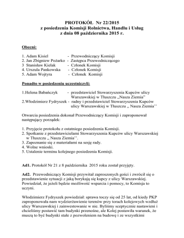 PROTOKÓŁ Nr 22/2015 z posiedzenia Komisji Rolnictwa, Handlu i Usług z dnia 08 października 2015 r. Obecni: 1. Adam Kisiel 2. Jan Zbigniew Pożarko 3 Stanisław Kielak 4. Urszula Pankowska 5. Adam Wojtyra - Przewodniczący Komisji - Zastępca Przewodniczącego - Członek Komisji - Członek Komisji - Członek Komisji Ponadto w posiedzeniu uczestniczyli: 1.Helena Babańczyk - przedstawiciel Stowarzyszenia Kupców ulicy Warszawskiej w Tłuszczu ,,Nasza Ziemia” 2.Włodzimierz Fydryszek - radny i przedstawiciel Stowarzyszenia Kupców ulicy Warszawskiej w Tłuszczu ,, Nasza Ziemia’’ Otwarcia posiedzenia dokonał Przewodniczący Komisji i zaproponował następujący porządek: 1. Przyjęcie protokołu z ostatniego posiedzenia Komisji. 2. Spotkanie z przedstawicielami Stowarzyszenia Kupców ulicy Warszawskiej w Tłuszczu ,, Nasza Ziemia’’. 3. Zapoznanie się z materiałami na sesję rady. 4. Wolne wnioski. 5. Ustalenie terminu kolejnego posiedzenia Komisji. Ad1. Protokół Nr 21 z 8 października 2015 roku został przyjęty. Ad2. Przewodniczący Komisji przywitał zaproszonych gości i zwrócił się o przedstawienie sytuacji z jaką borykają się kupcy z ulicy Warszawskiej. Powiedział, że jeżeli będzie możliwość wsparcia i pomocy, to Komisja to uczyni. Włodzimierz Fydryszek powiedział: sprawa toczy się od 25 lat, od kiedy PKP zaproponowała nam wydzierżawienie terenów przy torach kolejowych wzdłuż ulicy Warszawskiej i zainwestowanie w nie. Byliśmy sceptycznie nastawieni i chcieliśmy postawić tam budynki przenośne, ale Kolej postawiła warunek, że muszą to być budynki stałe z pozwoleniem na budowę i ze wszystkimi procedurami, gdyż te tereny nie będą potrzebne kolei, chyba że w przypadku wojny i takie są zapisy w umowach. Otrzymaliśmy pozwolenia na budowę, wybudowaliśmy te budynki, dbaliśmy o nie, płaciliśmy i dalej płacimy Kolei nie małe pieniądze z tytułu dzierżawy terenu. Przez 24 lata uświadamiano nas, że jeżeli tylko będzie możliwość sprzedaży tych gruntów pod naszymi budynkami, to na pewno je kupimy, Kolei nie będzie robić problemów. Okazało się, że w międzyczasie została wprowadzona ustawa o prywatyzacji i restrukturyzacji PKP, która później była nowelizowana i nikt nie zauważył, nikt się nie zainteresował, że w całej Polsce jest kilka tysięcy takich podmiotów jak my, które zainwestowały na terenach kolejowych, że należy to uregulować, że po 25 latach należy nam się prawo pierwokupu, czy w ramach negocjacji kupno tego terenu. Przykładem jest Halinów, gdzie kupcy dzierżawili teren od Kolei, wybudowali budynki w których prowadzili działalność gospodarczą, a teraz Kolej wystawiła to do przetargu i sprzedała bez ich wiedzy. Dowiedzieli się z prasy, że ich budynki zostały sprzedane i z dnia na dzień zostali pozbawieni pracy. W tej chwili nikt z przedstawicieli Kolei nie traktuje nas poważnie tylko przedmiotowo, nikogo nie obchodzi, że prowadzimy tam działalność, mamy miejsca pracy, że dbamy o te tereny i budynki, interesuje ich tylko sprzedaż terenu i budynków. Aby walczyć o swoją założyliśmy Stowarzyszenie, mamy swojego prawnika, zaangażowaliśmy kilka osób min. Pana Burmistrza, Przewodniczącego Komisji Rolnictwa, Handlu i Usług i kilku posłów z różnym odzewem. Wspomnę, że najbardziej zaangażował się Pan Burmistrz, Poseł Jacek Sasin i Posłanka Pawłowicz, którzy na dzień dzisiejszy bardzo nam pomogli, interweniowali o wstrzymanie procedury, jakie będą skutki nie wiadomo. Otrzymaliśmy kopię odpowiedzi na zapytanie poselskie Pana Posła Jacka Sasina skierowane do Ministra Infrastruktury i Rozwoju w przedmiotowej sprawie (załącznik nr 1 do niniejszego protokołu). W odpowiedzi jest zawarta informacja, że pawilony handlowe położone w Tłuszczu przy ul. Warszawskiej są usytuowane na działce stanowiącej linie kolejową nr 6 Zielonka-Kuźnica Białostocka i są objęte decyzją nr 3 Ministra Infrastruktury i Rozwoju z dnia 24 marca 2014 roku w sprawie ustalenia terenów przez które przebiegają linie kolejowe, jako terenów zamkniętych. Obecnie wszczęta została procedura podziału geodezyjnego działki i po jej zakończeniu koniecznym będzie wyłączenie wydzielonych działek z ww. decyzji nr 3 Ministerstwa Infrastruktury i Rozwoju i dopiero wówczas będzie mogła zostać wszczęta procedura sprzedaży przedmiotowych nieruchomości na określonych zasadach. Z chwilą wystawienia nieruchomości do sprzedaży w drodze ustnych przetargów nieograniczonych, najemcy gruntu zostaną zaproszeni do wzięcia udziału w przetargach, w których będą mogli nabyć wynajmowane nieruchomości. Ceny wywoławcze nieruchomości będą uwzględniały zarówno wartość gruntu jak i wartość budynków, bowiem budynek wzniesiony przez 2 najemcę na gruncie będącym w wieczystym użytkowaniu PKP S.A stanowi własność wieczystego użytkownika. W takiej sytuacji najemcom nieruchomości może przysługiwać roszczenie jedynie o zwrot poniesionych nakładów. PKP S.A poinformowały, że prawo to zostanie ustalone w oparciu o analizę istniejących dokumentów. Pani Helena Babańczyk powiedziała: Pan Jacek Sasin interweniował również o rozpatrzenie naszych umów i poproszono nas o dostarczenie umów dzierżawy i najmu zawieranych w różnych okresach czasu przez różne osoby i różne jednostki organizacyjne PKP i spółki Grupy PKP. W tych umowach nie ma informacji, że my się zrzekamy na rzecz kolei, a im głównie chodzi o to, że jak się zrzekniemy, to nam się nie należy żaden zwrot nakładów i chociaż o te zwroty nakładów walczymy. Włodzimierz Fydryszek: Piszemy pisma do różnych osób z prośbą o pomoc, ale niestety nikt nie wskazuje nam drogi wyjścia z takiej sytuacji, tylko wszyscy powielają przepisy prawa jakie obowiązują, nikt nie wysilił się wskazać nam możliwości z których możemy skorzystać np. zastosowanie kodeksu cywilnego. Odby