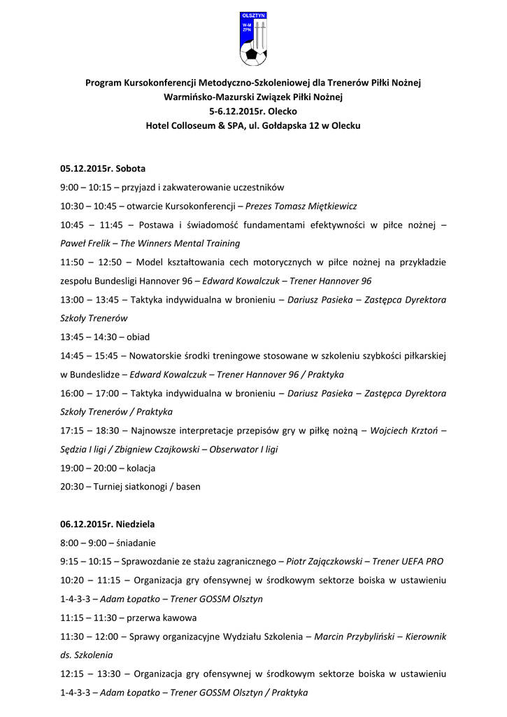 Program Kursokonferencji Metodyczno-Szkoleniowej dla Trenerów Piłki Nożnej Warmińsko-Mazurski Związek Piłki Nożnej 5-6.12.2015r. Olecko Hotel Colloseum & SPA, ul. Gołdapska 12 w Olecku 05.12.2015r. Sobota 9:00 – 10:15 – przyjazd i zakwaterowanie uczestników 10:30 – 10:45 – otwarcie Kursokonferencji – Prezes Tomasz Miętkiewicz 10:45 – 11:45 – Postawa i świadomość fundamentami efektywności w piłce nożnej – Paweł Frelik – The Winners Mental Training 11:50 – 12:50 – Model kształtowania cech motorycznych w piłce nożnej na przykładzie zespołu Bundesligi Hannover 96 – Edward Kowalczuk – Trener Hannover 96 13:00 – 13:45 – Taktyka indywidualna w bronieniu – Dariusz Pasieka – Zastępca Dyrektora Szkoły Trenerów 13:45 – 14:30 – obiad 14:45 – 15:45 – Nowatorskie środki treningowe stosowane w szkoleniu szybkości piłkarskiej w Bundeslidze – Edward Kowalczuk – Trener Hannover 96 / Praktyka 16:00 – 17:00 – Taktyka indywidualna w bronieniu – Dariusz Pasieka – Zastępca Dyrektora Szkoły Trenerów / Praktyka 17:15 – 18:30 – Najnowsze interpretacje przepisów gry w piłkę nożną – Wojciech Krztoń – Sędzia I ligi / Zbigniew Czajkowski – Obserwator I ligi 19:00 – 20:00 – kolacja 20:30 – Turniej siatkonogi / basen 06.12.2015r. Niedziela 8:00 – 9:00 – śniadanie 9:15 – 10:15 – Sprawozdanie ze stażu zagranicznego – Piotr Zajączkowski – Trener UEFA PRO 10:20 – 11:15 – Organizacja gry ofensywnej w środkowym sektorze boiska w ustawieniu 1-4-3-3 – Adam Łopatko – Trener GOSSM Olsztyn 11:15 – 11:30 – przerwa kawowa 11:30 – 12:00 – Sprawy organizacyjne Wydziału Szkolenia – Marcin Przybyliński – Kierownik ds. Szkolenia 12:15 – 13:30 – Organizacja gry ofensywnej w środkowym sektorze boiska w ustawieniu 1-4-3-3 – Adam Łopatko – Trener GOSSM Olsztyn / Praktyka 13:30 – 13:45 – wydawanie certyfikatów 13:45 – 15:00 – obiad i wykwaterowanie
