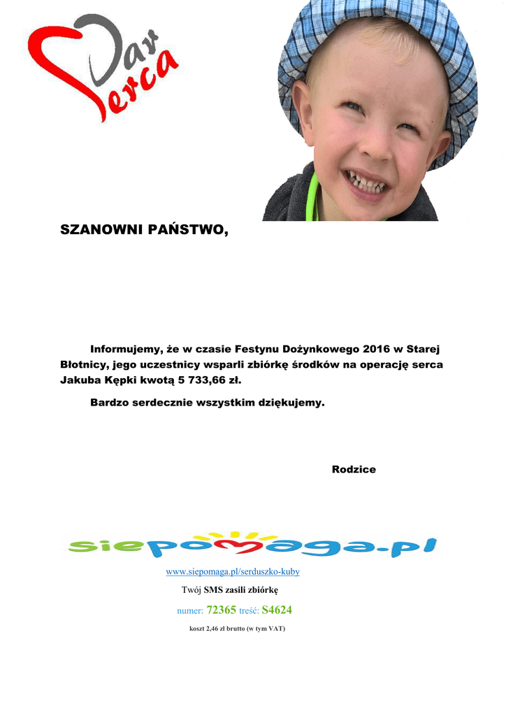 SZANOWNI PAŃSTWO, Informujemy, że w czasie Festynu Dożynkowego 2016 w Starej Błotnicy, jego uczestnicy wsparli zbiórkę środków na operację serca Jakuba Kępki kwotą 5 733,66 zł. Bardzo serdecznie wszystkim dziękujemy. Rodzice www.siepomaga.pl/serduszko-kuby Twój SMS zasili zbiórkę numer: 72365 treść: S4624 koszt 2,46 zł brutto (w tym VAT)