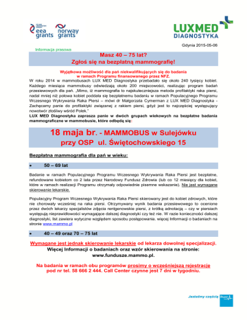 Gdynia 2015-05-06 Informacja prasowa Masz 40 – 75 lat? Zgłoś się na bezpłatną mammografię! Wyjątkowa możliwość dla pań niekwalifikujących się do badania w ramach Programu finansowanego przez NFZ. W roku 2014 w mammobusach LUX MED Diagnostyka przebadało się około 240 tysięcy kobiet. Każdego miesiąca mammobusy odwiedzają około 200 miejscowości, realizując program badań przesiewowych dla pań. „Mimo, iż mammografia to najskuteczniejsza metoda profilaktyki raka piersi, nadal mniej niż połowa kobiet poddała się bezpłatnemu badaniu w ramach Populacyjnego Programu Wczesnego Wykrywania Raka Piersi – mówi dr Małgorzata Cymerman z LUX MED Diagnostyka Zachęcamy panie do profilaktyki związanej z rakiem piersi, gdyż jest to najczęściej występujący nowotwór złośliwy wśród Polek.” LUX MED Diagnostyka zaprasza panie w dwóch grupach wiekowych na bezpłatne badania mammograficzne w mammobusie, które odbędą się: 18 maja br. - MAMMOBUS w Sulejówku przy OSP ul. Świętochowskiego 15 Bezpłatna mammografia dla pań w wieku: 50 – 69 lat Badanie w ramach Populacyjnego Programu Wczesnego Wykrywania Raka Piersi jest bezpłatne, refundowane kobietom co 2 lata przez Narodowy Fundusz Zdrowia (lub co 12 miesięcy dla kobiet, które w ramach realizacji Programu otrzymały odpowiednie pisemne wskazanie). Nie jest wymagane skierowanie lekarskie. Populacyjny Program Wczesnego Wykrywania Raka Piersi skierowany jest do kobiet zdrowych, które nie chorowały wcześniej na raka piersi. Otrzymywany wynik badania przesiewowego to ocenione przez dwóch lekarzy specjalistów zdjęcia rentgenowskie piersi, z krótką adnotacją – czy w piersiach występują nieprawidłowości wymagające dalszej diagnostyki czy też nie. W razie konieczności dalszej diagnostyki, list zawiera wytyczne względem sposobu postępowania. więcej Informacji o badaniach na stronie www.mammo.pl 40 – 49 oraz 70 – 75 lat Wymagane jest jednak skierowanie lekarskie od lekarza dowolnej specjalizacji. Więcej Informacji o badaniach oraz wzór skierowania na stronie: www.fundusze.mammo.pl. Na badania w ramach obu programów prosimy o wcześniejszą rejestrację pod nr tel. 58 666 2 444. Call Center czynne jest 7 dni w tygodniu. Badania wykonywane są w ramach Projektu „Poprawa dostępności i jakości usług medycznych w ramach Populacyjnego Programu Wczesnego Wykrywania Raka Piersi” współfinansowanego z funduszy EOG i Norweskiego Mechanizmu Finansowego. Na badania w ramach obu programów prosimy o wcześniejszą rejestrację pod nr tel. 58 666 2 444. Call Center czynne jest 7 dni w tygodniu. W zakresie realizowanego Projektu i zwiększenia dostępności do badań, zapewniamy paniom nie kwalifikującym się jeszcze / już do Programu finansowanego przez NFZ, bezpłatną mammografię. Mammografia trwa jedynie kilka minut i polega na zrobieniu 4 zdjęć rentgenowskich – dwóch projekcji każdej piersi. Badania nie należy się obawiać, ponieważ promieniowanie, które emituje jest nie większe niż przy RTG zęba. Pozwala na rozpoznanie i wykrycie tzw. zmian bezobjawowych (guzków oraz innych nieprawidłowości w piersi) w bardzo wczesnym etapie rozwoju – wtedy, kiedy nie są one wyczuwalne przez kobietę lub lekarza, co bardzo istotnie zwiększa szansę wyleczenia. Fundusze EOG i Norweskiego Mechanizmu Finansowego: Poprzez fundusze EOG i fundusze norweskie, Islandia, Liechtenstein i Norwegia przyczyniają się do zmniejszania nierówności społecznych i ekonomicznych oraz wzmacniania relacji dwustronnych z państwami beneficjentami w Europie. Trzy państwa ściśle współpracują z UE na podstawie Porozumienia o Europejskim Obszarze Gospodarczym (Porozumienie EOG). W okresie 2009–2014 wartość funduszy EOG i funduszy norweskich wynosi 1,79 miliarda euro. Norwegia zapewnia około 97% łącznego finansowania. Fundusze są dostępne dla organizacji pozarządowych, instytucji badawczych i szkół wyższych, sektora publicznego i sektora prywatnego w 12 nowoprzyjętych państwach członkowskich UE oraz Grecji, Portugalii i Hiszpanii. W ich ramach ma miejsce szeroka współpraca z podmiotami z państw darczyńców, a przedsięwzięcia mogą być wdrażane do 2016 r. Najważniejsze obszary wsparcia obejmują ochronę środowiska i zmiany klimatyczne, badania i stypendia, społeczeństwo obywatelskie, ochronę zdrowia i wsparcie dla dzieci, równość płci, sprawiedliwość i dziedzictwo kulturowe. Informacje o LUX MED Diagnostyka: LUX MED Diagnostyka jest jednym z największych usługodawców diagnostyki obrazowej w Polsce posiada 28 placówek w 17 miastach. W centrach diagnostycznych wykonywane są badania tomografii komputerowej, rezonansu magnetycznego, RTG oraz mammograficzne (także w ramach mobilnej mammografii na terenie całego kraju - LUX MED Diagnostyka dysponuje 15 mammobusami). Marka oferuje Pacjentom wysoki poziom usług, a partnerom biznesowym efektywne kosztowo rozwiązania outsourcingu medycznego i teleradiologii. Informacje o Grupie LUX MED: Grupa LUX MED to największa sieć medyczna w Polsce. Oferta Grupy kierowana jest zarówno do klientów korporacyjnych, jak i indywidualnych. Klienci korporacyjni korzystają z Pracowniczych Programów Zdrowotnych rozwijanych wokół medycyny pracy. Klienci indywidualni mogą skorzystać z opieki zdrowotnej na podstawie Planów Opieki Medycznej, a także tzw. świadczeń FFS (fee for service, opłaty za poszczególne usługi) oraz w ramach kontraktu z NFZ. Opieka medyczna świadczona jest w 164 placówkach. Usługi ambulatoryjne realizowane są przede wszystkim w placówkach LUX MED i centrach medycznych Medycyny Rodzinnej, która specjalizuje się w obsłudze pacjentów w ramach kontraktu z NFZ. Pod marką PROFEMED w Warszawie działa specjalistyczna przychodnia lekarska przeznaczona specjalnie dla klientów „fee for service”. Z Grupą współpracuje ok. 1600 poradni partnerskich w całej Polsce. Pod jej opieką znajduje się p