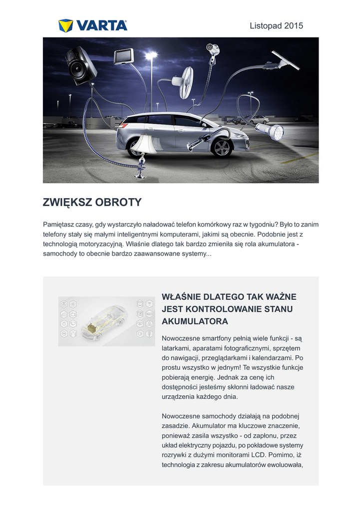 Listopad 2015 ZWIĘKSZ OBROTY Pamiętasz czasy, gdy wystarczyło naładować telefon komórkowy raz w tygodniu? Było to zanim telefony stały się małymi inteligentnymi komputerami, jakimi są obecnie. Podobnie jest z technologią motoryzacyjną. Właśnie dlatego tak bardzo zmieniła się rola akumulatora samochody to obecnie bardzo zaawansowane systemy... WŁAŚNIE DLATEGO TAK WAŻNE JEST KONTROLOWANIE STANU AKUMULATORA Nowoczesne smartfony pełnią wiele funkcji - są latarkami, aparatami fotograficznymi, sprzętem do nawigacji, przeglądarkami i kalendarzami. Po prostu wszystko w jednym! Te wszystkie funkcje pobierają energię. Jednak za cenę ich dostępności jesteśmy skłonni ładować nasze urządzenia każdego dnia. Nowoczesne samochody działają na podobnej zasadzie. Akumulator ma kluczowe znaczenie, ponieważ zasila wszystko - od zapłonu, przez układ elektryczny pojazdu, po pokładowe systemy rozrywki z dużymi monitorami LCD. Pomimo, iż technologia z zakresu akumulatorów ewoluowała, nadal istnieje kilka czynników, które negatywnie wpływają na długość cyklu eksploatacji akumulatora, np. ekstremalne temperatury, przejeżdżanie krótkich dystansów lub trudne warunki klimatyczne. Nic więc dziwnego, że co trzecia awaria samochodu jest spowodowana przez akumulator*. Zobacz film, aby dowiedzieć się więcej i móc wytłumaczyć swoim klientom, dlaczego regularne kontrolowanie stanu akumulatora jest tak ważne. *Źródło: Statystyki awarii ADAC 2014 WŁĄCZ TESTOWANIE AKUMULATORÓW DO CODZIENNYCH CZYNNOŚCI Przetestuj akumulator w każdym samochodzie, który trafia do warsztatu. Wystarczy kilka minut, aby zapewnić Twoim klientom mobilność zaoszczędzając im dodatkowych kosztów i problemów. Z testem VARTA Battery Test-Check możesz mieć pewność, że akumulator w każdym samochodzie, który trafia do Twojego warsztatu, zostanie bezpłatnie przetestowany! Jednak test to tylko jedna strona medalu - kolejnym kluczowym czynnikiem jest przekazanie wyniku testu klientowi. Siedmiu na dziesięciu klientów posłucha Twojej rekomendacji, ponieważ ufają Twojemu doświadczeniu.* * Źródło : GIPA, Midtronics KOLOR ZIELONY OZNACZA ZIELONE ŚWIATŁO DO JAZDY... Oto nasza propozycja przekazywania klientom wyniku testu akumulatora. ZIELONY stan akumulatora oznacza: "Może Pan/Pani jechać dalej - stan akumulatora jest dobry. Proszę jednak pojawić się u nas jeszcze raz przed nadejściem zimy. Wtedy ponownie przetestuję akumulator w Pana/Pani samochodzie - za darmo!". ŻÓŁTY stan akumulatora oznacza: "Kontrola akumulatora wykazała niski stan naładowania. Niski stan naładowania nie jest typowym zjawiskiem, parametry akumulatora są obniżone. Akumulator może wymagać wymiany". CZERWONY stan akumulatora oznacza: "Akumulator należy niezwłocznie wymienić. Pana/Pani samochód potrzebuje odpowiedniego stanu akumulatora do niezawodnego uruchomienia. Musimy natychmiast wymienić akumulator, tak aby zapewnić Panu/Pani bezpieczne uruchamianie pojazdu". TESTUJ AKUMULATOR W KAŻDYM SAMOCHODZIE, KTÓRY TRAFIA DO WARSZTATU Dołącz do programu bezpłatnych testów VARTA Battery Test-Check - zapewnimy Ci specjalistyczne szkolenia oraz wsparcie marketingowe. Zwiększymy ruch w Twoim warsztacie i dostarczymy materiały edukacyjne dla Ciebie i kierowców - zarówno przez Internet, jak i poza nim. Nie przegap tej szansy! Pamiętaj, aby zgłosić swój warsztat do tego wyjątkowego programu. WYJAŚNIJ KORZYŚCI Pamiętaj, że co trzecia awaria samochodu jest spowodowana akumulatorem. Włączając bezpłatny test VARTA Battery Test-Check do codziennych czynności, pomagasz w wykrywaniu i wymianie słabych akumulatorów zanim zawiodą Twoich klientów. Dzięki temu Twoi klienci zachowają mobilność, a Ty zyskasz ich zaufanie. Biorąc pod uwagę fakt, że 70% klientów słucha porad otrzymanych w warsztacie, zwiększasz również potencjał swojej działalności. ZAREJESTRUJ SIĘ JUŻ DZIŚ! Nie zapomnij udostępnić swoim znajomym, rodzinie i klientom treści z witryny VARTA za pomocą serwisu Facebook, Twitter lub poczty elektronicznej. NIE ZAMARZAJ - UODPORNIJ SWÓJ AKUMULATOR NA ZIMĘ! Śnieg i ujemne temperatury? Właśnie teraz warto poinformować swoich klientów o tym, jak ważne jest sprawdzanie stanu akumulatora - najlepiej jeszcze przed nadejściem zimy. Kliknij tutaj, aby zapoznać się z naszymi cyfrowymi treściami i udostępnić je! CO ZROBILIŚCIE DLA MNIE OSTATNIO? Aby w pełni wykorzystać relacje z klientem, kluczowa jest skuteczna komunikacja. W kolejnym newsletterze bliżej przyjrzymy się lojalności klientów. Dowiesz się, jak odpowiednie informacje przekazywane we właściwy sposób mogą zmaksymalizować biznesowy potencjał testowania akumulatorów w Twoim warsztacie. Wszystko to znajdziesz w newsletterze na kolejny miesiąc! > Preventative - Battery Search PL > Preventative - Test Every Battery PL A Johnson Controls Inc. Company Johnson Controls Akumulatory Sp. z o.o. Ul. Ceglana 4 40-514 Katowice Polska Tel: 0048 32 608 69 50 51 Fax: 0048 32 209 55 83 E-mail: [email protected]
