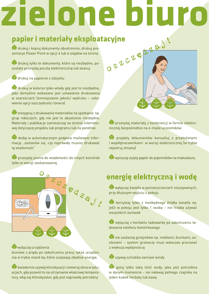 zielone biuro papier i materiały eksploatacyjne drukuj i kopiuj dokumenty obustronnie, drukuj prezentacje Power Point w opcji 4 lub 6 slajdów na stronę drukuj tylko te dokumenty, które są niezbędne, pozostałe przesyłaj pocztą elektroniczną lub skanuj drukuj na papierze z odzysku drukuj w kolorze tylko wtedy gdy jest to niezbędne, jako domyślne wskazane jest ustawienie drukowania w szarościach (zmniejszenie jakości wydruku – ustawienie opcji oszczędności tonera) zrezygnuj z drukowania materiałów na spotkania np. grup roboczych, gdy nie jest to absolutnie niezbędne. Materiały i publikacje zamieszczaj na stronie internetowej dotyczącej projektu lub programu lub na pendrive przesyłaj materiały z konferencji w formie elektronicznej bezpośrednio na e-maile uczestników dodaj w automatycznym podpisie mailowym informację „zastanów się, czy naprawdę musisz drukować tą wiadomość” projekty dokumentów konsultuj z przełożonymi i współpracownikami w wersji elektronicznej (w trybie rejestruj zmiany) przesyłaj pisma do wiadomości do innych komórek tylko w wersji zeskanowanej wyrzucaj zużyty papier do pojemników na makulaturę. energię elektryczną i wodę wyłączaj światła w pomieszczeniach nieużywanych, przy dłuższym wyjściu z pokoju korzystaj tylko z niezbędnego źródła światła np. jeśli w pokoju jest tylko 1 osoba – nie trzeba używać wszystkich żarówek wyłączaj z kontaktu ładowarkę po zakończeniu ładowania telefonu komórkowego wyłączaj urządzenia biurowe z prądu po zakończeniu pracy, także urządzenia w trybie stand-by, które zużywają zbędnie energię świadomie używaj klimatyzacji i otwieraj okna w sytuacjach, gdy pozwoli to na utrzymanie właściwej temperatury, włączaj klimatyzator, gdy jest naprawdę potrzebny nie zasłaniaj grzejników np. meblami, biurkami, zasłonami – system grzewczy musi wówczas pracować z większą wydajnością używaj schodów zamiast windy gotuj tylko taką ilość wody, jaka jest potrzebna w danym momencie - nie nalewaj pełnego czajnika na jeden kubek herbaty lub kawy. zielone biuro przy zakupie gadżetów i publikacji wybieraj ekologiczne materiały konferencyjne, np. torby płócienne zamiast papierowych, jednorazowych uwzględniaj „zielone zamówienia publiczne” przy wyborze materiału promocyjnego, np. długopisy mogą być produkowane w przedsiębiorstwie posiadającym certyfikat środowiskowy a bawełna z której wyprodukowano t-shirty pochodzić z ekologicznych upraw bawełny, zgodnych z zasadą fair trade dopasowuj materiały promocyjne do odbiorcy, tak aby zapewnić użyteczność danego przedmiotu i wydłużenie jego wykorzystania dbaj o jakość materiałów promocyjnych – np. dobrej jakości długopis posłuży dłużej a nie zostanie zaraz po otrzymaniu wyrzucony, zamawiając gadżety należy kierować się ich wysoką jakością i wartością komunikacyjną a nie upominkową ograniczaj ilość zamawianych gadżetów - unikaj produkowania materiałów promocyjnych „na siłę”, by nie wytwarzać odpadów minimalizuj drukowanie ulotek i broszur, drukowane materiały promocyjne często zawierają bardzo niewiele treści i natychmiast zostają wyrzucone drukuj odpowiednio policzoną ilość broszur i plakatów a także wydawnictw, których trwałość treści jest ograniczona podczas konferencji i szkoleń Organizuj szkolenia ze świadomością, że masz możliwość wdrażać zasadę zrównoważonego rozwoju poprzez prawidłowo prowadzoną logistykę szkolenia, co oznacza m.in.: wybieraj takie miejsce konferencji, by można było dotrzeć tam środkami komunikacji miejskiej. Informuj uczestnika o takiej możliwości dojazdu w zaproszeniu materiały szkoleniowe – minimalizuj ilość drukowanych, umieszczaj w sieci materiały w formie elektronicznej, catering na naczyniach wielorazowych, przygotowany w oparciu o sezonowe owoce i warzywa, w miarę możliwości z wykorzystaniem produktów pochodzących z gospodarstw ekologicznych, zbieraj identyfikatory po konferencji w celu ograniczenia ilości produkowanych przy kolejnej konferencji zobliguj prowadzącego szkolenie do oszczędzania energii poprzez odpowiednie sterowanie ogrzewaniem (np. otwarcie okien zamiast włączania klimatyzacji, wyłączanie nieużywanych sprzętów, wykorzystywanie naturalnego oświetlenia itp.) stosując ankiety oceniające po szkoleniach, warsztatach i konferencjach, komitetach i podkomitetach monitorujących badające potrzeby szkoleniowe wykorzystuj na tyle ile to jest możliwe ankiety elektroniczne, np. przez stronę www. stosuj tele- i videokonferencje,