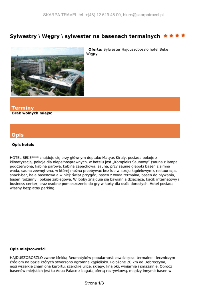 SKARPA TRAVEL tel. +(48) 12 619 48 00, [email protected] Sylwestry \ Węgry \ sylwester na basenach termalnych Oferta: Sylwester Hajduszoboszlo hotel Beke Węgry Terminy Brak wolnych miejsc Opis Opis hotelu HOTEL BEKE**** znajduje się przy głównym deptaku Matyas Kiraly, posiada pokoje z klimatyzacją, pokoje dla niepełnosprawnych, w hotelu jest „Kompleks Saunowy” (sauna z lampa podczerwona, kabina parowa, kabina zapachowa, sauna, przy saunie głęboki basen z zimna woda, sauna zewnętrzna, w której można przebywać bez lub w stroju kąpielowym), restauracja, snack-bar, hala basenowa a w niej: świat przygód, basen z woda termalna, basen do pływania, basen rodzinny i pokoje zabiegowe. W lobby znajduje się bawialnia dziecięca, kącik internetowy i business center, oraz osobne pomieszczenie do gry w karty dla osób dorosłych. Hotel posiada własny bezpłatny parking. Opis miejscowości HAJDUSZOBOSZLO zwane Mekką Reumatyków popularność zawdzięcza, termalno - leczniczym źródłom na bazie których stworzono ogromne kąpielisko. Położone 20 km od Debreczyna, nosi wszelkie znamiona kurortu: szerokie ulice, sklepy, knajpki, winiarnie i smażalnie. Oprócz basenów miejskich jest tu Aqua Palace z bogatą ofertą rozrywkową, między innymi: basen w Strona 1/3 SKARPA TRAVEL tel. +(48) 12 619 48 00, [email protected] jaskini lodowej, basen kinowy, masaże uciskowe, prądy znoszące i wiele, wiele innych. Idealne miejsce na zimowy relaks. Cena zawiera 3 noclegi, 3 śniadania, 2 obiadokolacje w formie bufetu, Zabawę Sylwestrową: gala, kolacja bufet, muzyka i program rozrywkowy, korzystanie na terenie hotelu z basenów, zamknięty parking, opieka mobilnego rezydenta węgierskiego, ubezpieczenie KL+NNW +choroby przewlekłe i nowotworowe+bagaż. Dopłaty 1.Taksy klimatycznej obowiązkowo płatnej na miejscu 450 HUF/ osoba/doba 2. W czasie Zabawy Sylwestrowej alkohol, kawa, herbata, sok płatne dodatkowo. Praktyczne informacje Najbliższa placówka dyplomatyczna Ambasada RP na Węgrzech Verosligeti fasor 16, 1068 Budapest Wydział Konsularny tel. 00361 413 82 14, fax. 00361 351 17 25 Strona 2/3 SKARPA TRAVEL tel. +(48) 12 619 48 00, [email protected] Obowiązująca waluta: forint (HUF) 1 EUR = ok. 300 HUF Strona 3/3 Powered by TCPDF (www.tcpdf.org)