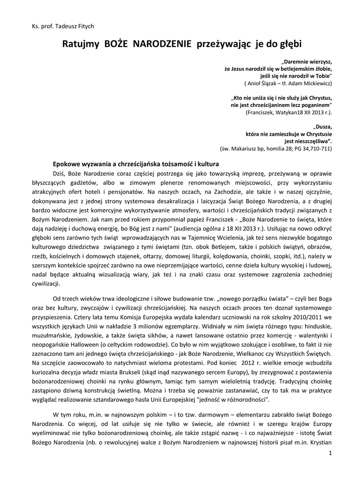 Ks. prof. Tadeusz Fitych Ratujmy BOŻE NARODZENIE przeżywając je do głębi „Daremnie wierzysz, że Jezus narodził się w betlejemskim żłobie, jeśli się nie narodził w Tobie” ( Anioł Ślązak – tł. Adam Mickiewicz) „Kto nie uniża się i nie służy jak Chrystus, nie jest chrześcijaninem lecz poganinem” (Franciszek, Watykan18 XII 2013 r.). „Dusza, która nie zamieszkuje w Chrystusie jest nieszczęśliwa”. (św. Makariusz bp, homilia 28; PG 34,710-711) Epokowe wyzwania a chrześcijańska tożsamość i kultura Dziś, Boże Narodzenie coraz częściej postrzega się jako towarzyską imprezę, przeżywaną w oprawie błyszczących gadżetów, albo w zimowym plenerze renomowanych miejscowości, przy wykorzystaniu atrakcyjnych ofert hoteli i pensjonatów. Na naszych oczach, na Zachodzie, ale także i w naszej ojczyźnie, dokonywana jest z jednej strony systemowa desakralizacja i laicyzacja Świąt Bożego Narodzenia, a z drugiej bardzo widoczne jest komercyjne wykorzystywanie atmosfery, wartości i chrześcijańskich tradycji związanych z Bożym Narodzeniem. Jak nam przed rokiem przypomniał papież Franciszek - „Boże Narodzenie to święta, które dają nadzieję i duchową energię, bo Bóg jest z nami” (audiencja ogólna z 18 XII 2013 r.). Usiłując na nowo odkryć głęboki sens zarówno tych świąt wprowadzających nas w Tajemnicę Wcielenia, jak też sens niezwykle bogatego kulturowego dziedzictwa związanego z tymi świętami (tzn. obok Betlejem, także i polskich świątyń, obrazów, rzeźb, kościelnych i domowych stajenek, ołtarzy, domowej liturgii, kolędowania, choinki, szopki, itd.), należy w szerszym kontekście spojrzeć zarówno na owe nieprzemijające wartości, cenne dzieła kultury wysokiej i ludowej, nadal będące aktualną wizualizacją wiary, jak też i na znaki czasu oraz systemowe zagrożenia zachodniej cywilizacji. Od trzech wieków trwa ideologiczne i siłowe budowanie tzw. „nowego porządku świata” – czyli bez Boga oraz bez kultury, zwyczajów i cywilizacji chrześcijańskiej. Na naszych oczach proces ten doznał systemowego przyspieszenia. Cztery lata temu Komisja Europejska wydała kalendarz uczniowski na rok szkolny 2010/2011 we wszystkich językach Unii w nakładzie 3 milionów egzemplarzy. Widniały w nim święta różnego typu: hinduskie, muzułmańskie, żydowskie, a także święta sikhów, a nawet lansowane ostatnio przez komercję - walentynki i neopogańskie Halloween (o celtyckim rodowodzie). Co było w nim wyjątkowo szokujące i osobliwe, to fakt iż nie zaznaczono tam ani jednego święta chrześcijańskiego - jak Boże Narodzenie, Wielkanoc czy Wszystkich Świętych. Na szczęście zaowocowało to natychmiast wieloma protestami. Pod koniec 2012 r. wielkie emocje wzbudziła kuriozalna decyzja władz miasta Brukseli (skąd inąd nazywanego sercem Europy), by zrezygnować z postawienia bożonarodzeniowej choinki na rynku głównym, łamiąc tym samym wieloletnią tradycję. Tradycyjną choinkę zastąpiono dziwną konstrukcją świetlną. Można i trzeba się poważnie zastanawiać, czy to tak ma w praktyce wyglądać realizowanie sztandarowego hasła Unii Europejskiej "jedność w różnorodności". W tym roku, m.in. w najnowszym polskim – i to tzw. darmowym – elementarzu zabrakło świąt Bożego Narodzenia. Co więcej, od lat usiłuje się nie tylko w świecie, ale również i w szeregu krajów Europy wyeliminować nie tylko bożonarodzeniową choinkę, ale także zstąpić nazwę - i co najważniejsze - istotę Świat Bożego Narodzenia (nb. o rewolucyjnej walce z Bożym Narodzeniem w najnowszej historii pisał m.in. Krystian 1 Kratiuk na witrynach – www.pch24.pl oraz wirtualna polska.com). Pan Kratiuk już w 2012 r. sygnalizował, że „nasilająca się ateizacja i ideologia „braku ideologii” skłaniają decydentów na całym świecie do coraz to bardziej absurdalnych decyzji dotyczących Bożego Narodzenia. W wolnym świecie nie wolno oficjalnie używać nazwy i symboli tego niezwykle ważnego Święta”. W efekcie - życiem ludzi, i to nawet wierzących, przestaje od jakiegoś czasu kierować kalendarz liturgiczny, a zaczyna tę funkcję pełnić komercja. Od lat, już w Adwencie mamy w sklepach pełne światła, dźwięk kolęd oraz komercyjne żniwa czyli konsumpcyjne święta. Jesteśmy świadkami systemowego zawłaszczania, zagłuszania, narzucania, mieszania i wypierania bożonarodzeniowej symboliki. Ta praktyka okazuje się być coraz bardziej intensywna i skuteczna na rzecz manipulatorów i biznesmenów pochłoniętych kategorią zysku. Jako chrześcijanie nie musimy się tych trendów bać, ale też nie powinniśmy – tak na ślepo, bezrefleksyjnie przyjmować te obce, globalizacyjne wzory, o wątpliwej wartości, tylko ze względu na to, że są modne, lub że nasze dzieci lub młodzież tego chcą. W tej sytuacji samo Boże Narodzenie z jego nieprzemijającymi treściami, szybko znika z naszych oczu, będąc błyskawicznie zasłonięte kolejnym komercyjnym zabiegiem – tzn. gigantycznie „rozdmuchanym” sylwestrem i karnawałem. Postawmy sobie pytanie – czy naprawdę jesteśmy ludźmi sumienia i ewangelicznymi chrześcijanami rozumiejącymi przesłanie Świąt Bożego Narodzenia? A jeśli tak, to dlaczego ciesząc się od 25 lat wolnością, i to w kraju w ponad 90 % katolickim, dajemy się wtłaczać w „postmodernistyczny gorset” i kolejny ateizujący „patent na szczęcie” nowej lewicy oraz spychać na nowe - „boczne i ślepe tory”? Jako Polacy mamy świadomość trwającej ponad 1000 lat nierozerwalności naszej tożsamości z wiarą katolicką. Niestety, w ostatnich dekadach została ona zapoznana. W 1989 r. znaczna część elit postsolidarnościowych, z tzw. lewicą laicką na czele, w radykalny sposób odwróciła się od ideałów, celów i wartości solidarnościowych. Dokonało się odejście od aspiracji, haseł i sztandarów, za którymi opowiedziały 