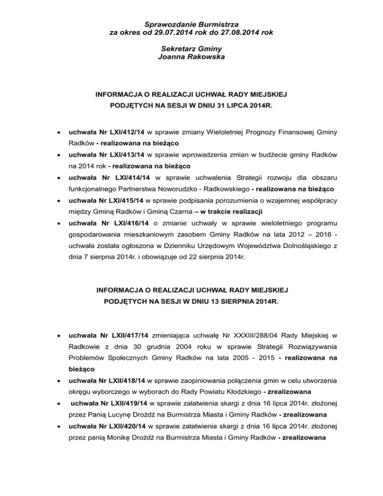 Sprawozdanie Burmistrza za okres od 29.07.2014 rok do 27.08.2014 rok Sekretarz Gminy Joanna Rakowska INFORMACJA O REALIZACJI UCHWAŁ RADY MIEJSKIEJ PODJĘTYCH NA SESJI W DNIU 31 LIPCA 2014R. uchwała Nr LXI/412/14 w sprawie zmiany Wieloletniej Prognozy Finansowej Gminy Radków - realizowana na bieżąco uchwała Nr LXI/413/14 w sprawie wprowadzenia zmian w budżecie gminy Radków na 2014 rok - realizowana na bieżąco uchwała Nr LXI/414/14 w sprawie uchwalenia Strategii rozwoju dla obszaru funkcjonalnego Partnerstwa Noworudzko - Radkowskiego - realizowana na bieżąco uchwała Nr LXI/415/14 w sprawie podpisania porozumienia o wzajemnej współpracy między Gminą Radków i Gminą Czarna – w trakcie realizacji uchwała Nr LXI/416/14 o zmianie uchwały w sprawie wieloletniego programu gospodarowania mieszkaniowym zasobem Gminy Radków na lata 2012 – 2016 uchwała została ogłoszona w Dzienniku Urzędowym Województwa Dolnośląskiego z dnia 7 sierpnia 2014r. i obowiązuje od 22 sierpnia 2014r. INFORMACJA O REALIZACJI UCHWAŁ RADY MIEJSKIEJ PODJĘTYCH NA SESJI W DNIU 13 SIERPNIA 2014R. uchwała Nr LXII/417/14 zmieniająca uchwałę Nr XXXIII/288/04 Rady Miejskiej w Radkowie z dnia 30 grudnia 2004 roku w sprawie Strategii Rozwiązywania Problemów Społecznych Gminy Radków na lata 2005 - 2015 - realizowana na bieżąco uchwała Nr LXII/418/14 w sprawie zaopiniowania połączenia gmin w celu utworzenia okręgu wyborczego w wyborach do Rady Powiatu Kłodzkiego - zrealizowana uchwała Nr LXII/419/14 w sprawie załatwienia skargi z dnia 16 lipca 2014r. złożonej przez Panią Lucynę Drożdż na Burmistrza Miasta i Gminy Radków - zrealizowana uchwała Nr LXII/420/14 w sprawie załatwienia skargi z dnia 16 lipca 2014r. złożonej przez panią Monikę Drożdż na Burmistrza Miasta i Gminy Radków - zrealizowana INFORMACJA O ZARZĄDZENIACH WYDANYCH PRZEZ BURMISTRZA W OKRESIE MIEDZYSESYJNYM zarządzenie Nr 110/14 z dnia 31 lipca 2014r. w sprawie ustalenia stawki bazowej czynszu - przedmiotowym zarządzeniem od dnia 1 sierpnia 2014r. ustalono stawkę bazową czynszu w wysokości 2,58 zł/m2 (stawka bazowa czynszu utrzymana została na dotychczasowym poziomie) zarządzenie Nr 111/14 z dnia 31 lipca 2014r. w sprawie zmian w budżecie gminy na 2014 rok - w wyniku wprowadzonych zmian plan budżetu gminy na 2014 rok wyniósł po stronie dochodów 35.523.200,92 zł oraz po stronie wydatków 37.400.862,92 zł zarządzenie Nr 112/14 z dnia 6 sierpnia 2014r. w sprawie przeznaczenia do sprzedaży gminnej nieruchomości gruntowej - przedmiotowym zarządzeniem przeznaczono do sprzedaży gminną nieruchomość gruntową jako działka nr 1107 AM-2 o powierzchni 1,1155 ha położoną w Ścinawce Średniej przy ul. Mickiewicza 2A (inne tereny zabudowane, łąki trwałe) zarządzenie Nr 113/14 z dnia 7 sierpnia 2014r. o zmianie zarządzenia w sprawie zasad wykonywania w Urzędzie Miasta i Gminy w Radkowie i jednostkach organizacyjnych Gminy Radków ustawy Prawo zamówień publicznych oraz Regulaminu Pracy Komisji Przetargowej Urzędu Miasta i Gminy w Radkowie -przedmiotowym zarządzeniem zmieniono zasady udzielania zamówień wyłączonych z ustawy, dostosowując je do zmienionych przepisów prawa zarządzenie Nr 114/14 z dnia 7 sierpnia 2014r. w sprawie powołania komisji przetargowej na zadanie pn.: Budowa chodnika w ciągu drogi wojewódzkiej nr 387 w m. Ścinawka Średnia i Ścinawka Górna na odcinku 1,51 km od skrzyżowania dróg wojewódzkich Nr 387 i 386 w kierunku Tłumaczowa przedmiotowym zarządzeniem na w/w zadanie powołano komisję przetargową w składzie: - Mirosław Kundzicz - przewodniczący; - Ewa Sowa - członek; - Swietłana Koszałko - członek; - Zdzisława Sokołowska-Kulas - członek zarządzenie Nr 115/14 z dnia 8 sierpnia 2014r. w sprawie przeznaczenia gminnej nieruchomości gruntowej do wydzierżawienia - przedmiotowym zarządzeniem przeznaczono do wydzierżawienia na okres do 30.09.2017r. gminne nieruchomości gruntowe na terenie gminy Radków zarządzenia Nr 116/14 z dnia 13 sierpnia 2014r. w sprawie zaopiniowania projektu Regulaminu Organizacyjnego Biblioteki Publicznej Miasta i Gminy Radków im. Karola Estreichera - przedmiotowym zarządzeniem zaopiniowano pozytywnie Regulamin Organizacyjny Biblioteki Publicznej Miasta i Gminy Radków zgodnie z wnioskiem Dyrektora z dnia 7 sierpnia 2014r. zarządzenie Nr 117/14 z dnia 13 sierpnia 2014r. w sprawie ustalenia terminu składania wniosków o dofinansowanie zakupu podręczników i materiałów dydaktycznych - przedmiotowym zarządzeniem ustalono termin składania wniosków o przyznanie pomocy uczniom w formie dofinansowania zakupu podręczników i materiałów dydaktycznych w ramach Rządowego programu pomocy uczniom w 2014r. „Wyprawka szkolna” do 5 września 2014r. zarządzenie Nr 118/14 z dnia 14 sierpnia 2014r. w sprawie przeznaczenia do wydzierżawienia gminnej nieruchomości - przedmiotowym zarządzeniem przeznaczono do wydzierżawienia pomieszczenia sklepiku szkolnego znajdującego się w budynku Zespołu Szkół z Oddziałami Integracyjnymi na działce nr 46/5 AM 2 w Ścinawce Średniej zarządzenie Nr 119/14 z dnia 19 sierpnia 2014r. w sprawie powołania komisji przetargowej na zadanie pn.: Termomodernizacja budynku i montaż pompy cieplnej w Zespole Szkolno - Przedszkolnym w Ścinawce Dolnej przedmiotowym zarządzeniem na w/w zadanie powołano komisję przetargową w składzie: Mirosław Kundzicz - przewodniczący; Ewa Sowa - członek; Maria Malik - członek; Swietłana Koszałko - członek; - Zdzisława Sokołowska-Kulas - członek zarządzenie Nr 120/14 z dnia 19 sierpnia 2014r. w sprawie powołania komisji przetargowej na zadanie pn.: Dostawa 110 szt. komputerów przenośnych typu netebook wraz zainstalowanym oprogramowaniem na potrzeby projektu POIG.08.03.00-02-080/13 pn.: „Przeciwdziałanie wykluczeniu cyfrowemu w gminie Radków” działanie 8.3 Przeciwdziałanie wykluczeniu cyfrowemu Einclusion, w ramach POIG 20