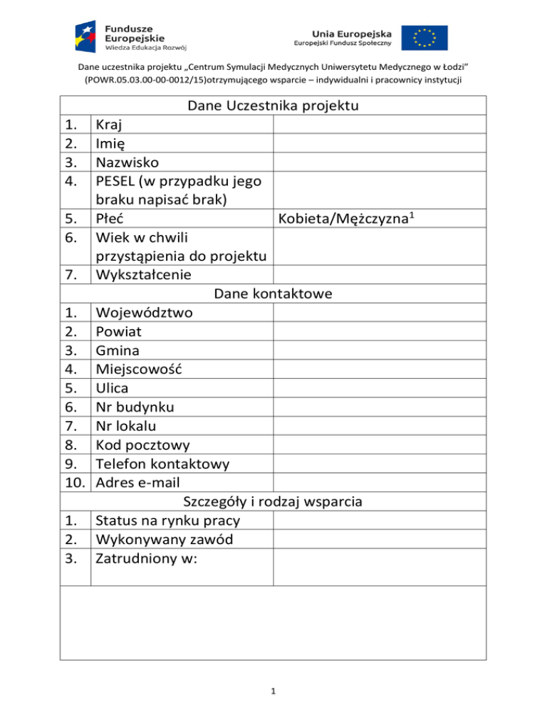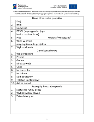 Dane Uczestnika projektu 1. Kraj 2. Imię 3. Nazwisko 4. PESEL (w